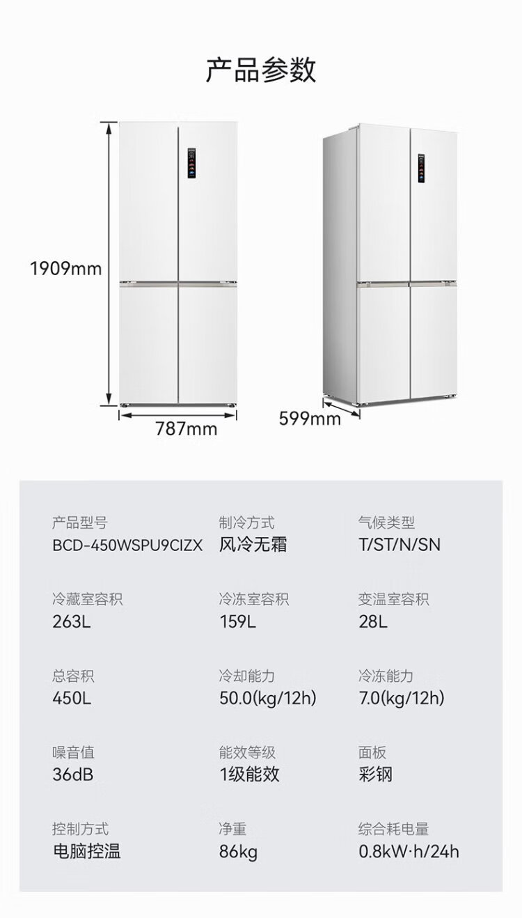 MeiLing Beluga Refrigerator 450L cross-door ultra-thin zero-level embedded automatic ice making bottom cooling dual system dual cycle first-level air cooling subsidy refrigerator White Beluga-BCD-450WSPU9CIZX