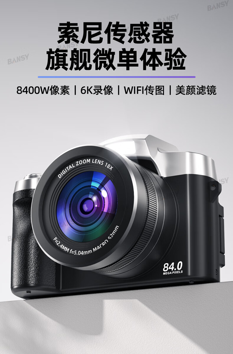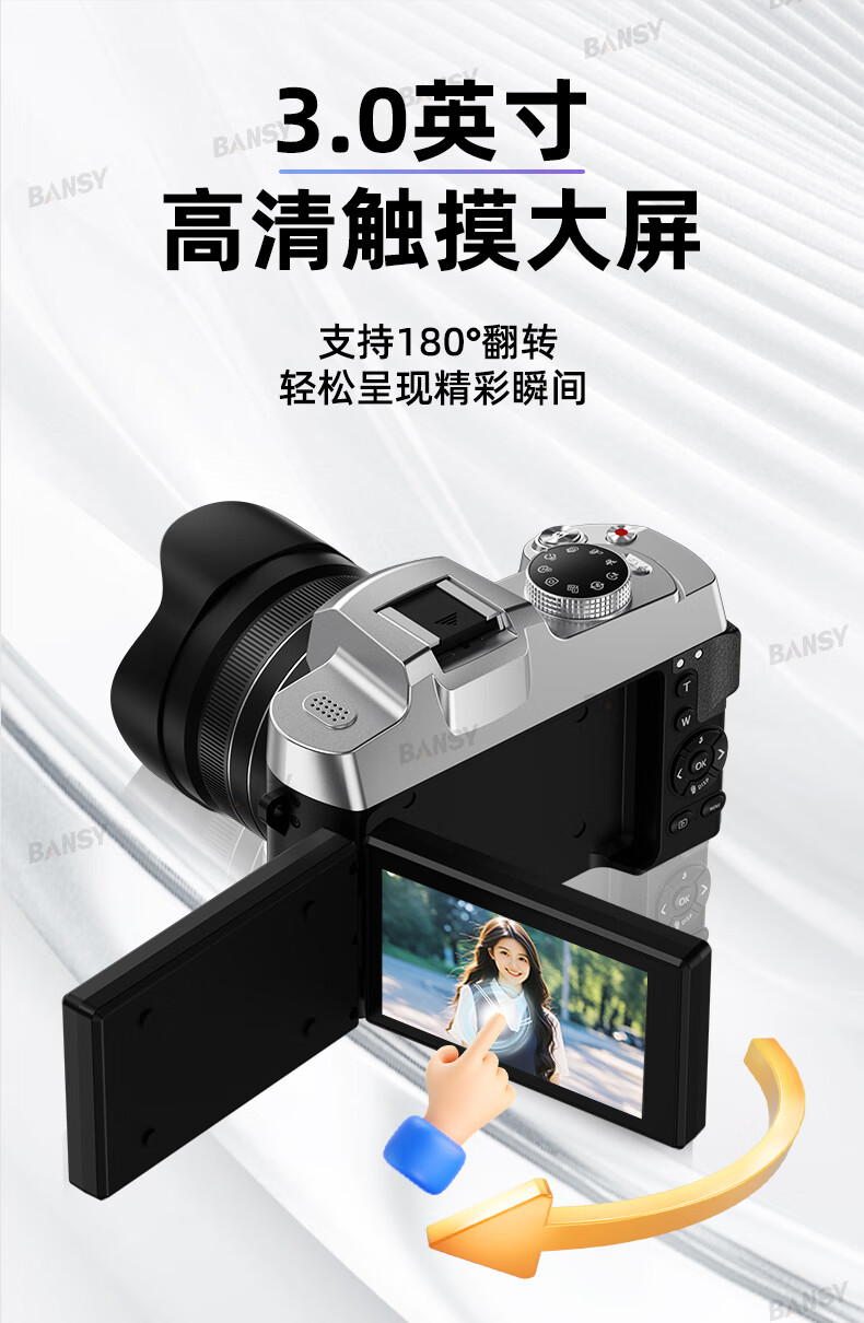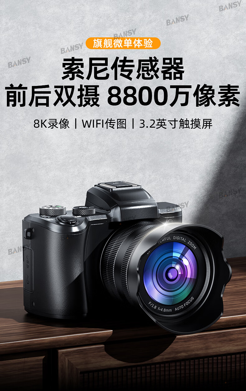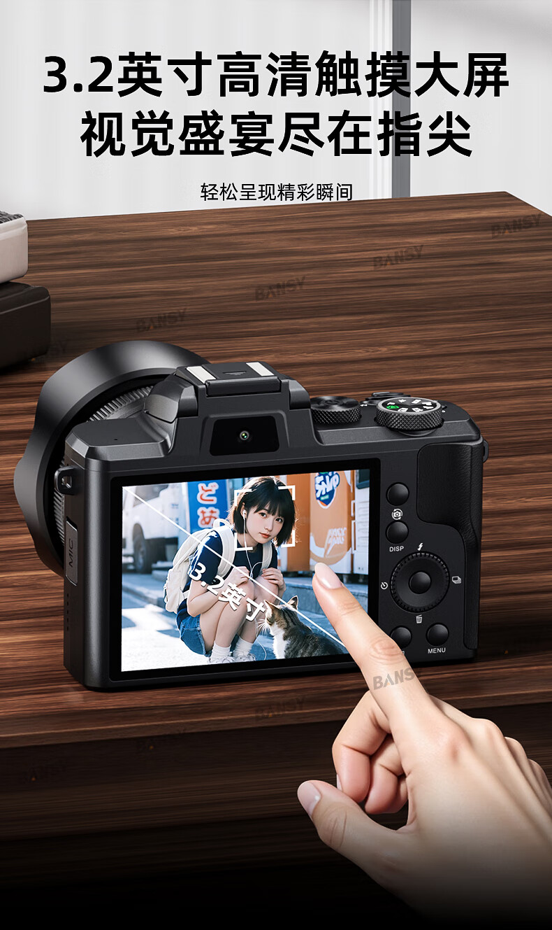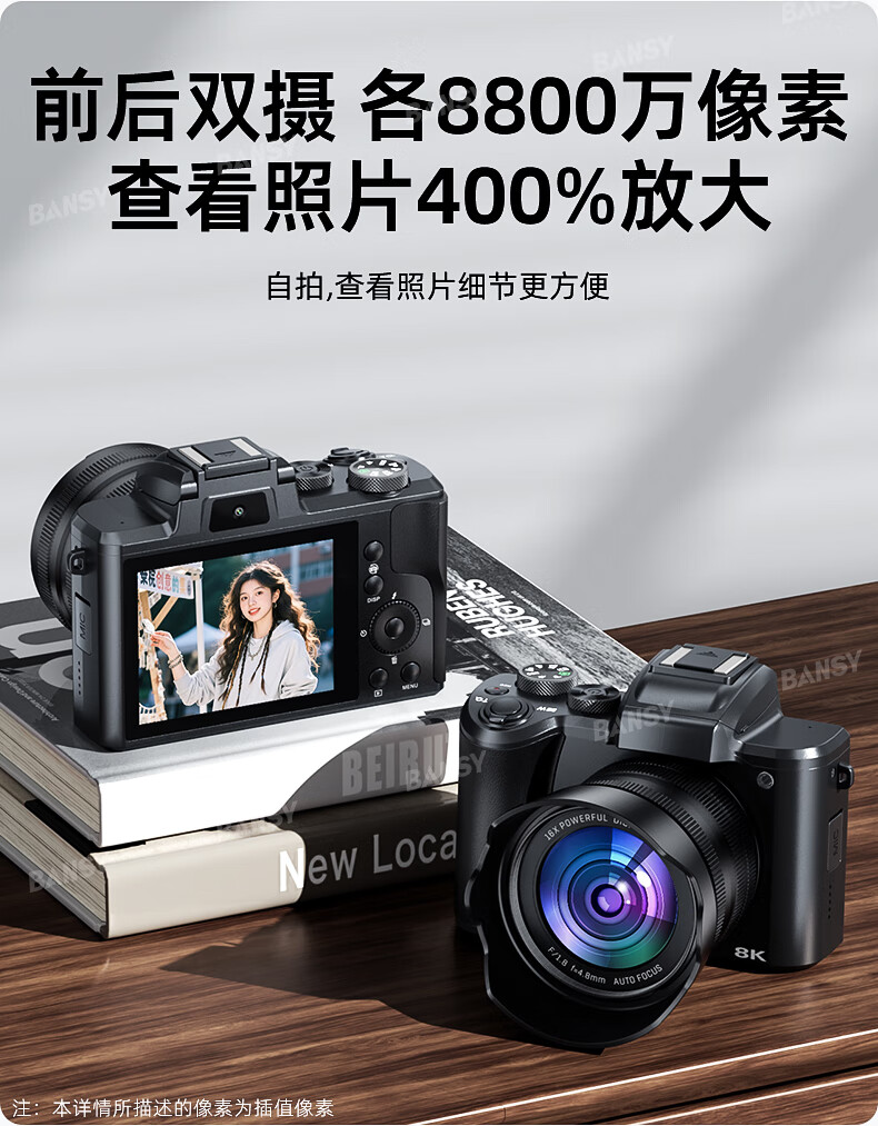 Bansy high-definition digital camera for photography and travel, entry-level 8K mirrorless camera for students, CCD replacement for high pixels, transferable to mobile phone, high school vlog shooting, SLR portable, 3.2-inch dual camera + 128G card + 8800W + 8K video recording, Sony sensor | Beauty filter | WiFi image transmission | Fill light