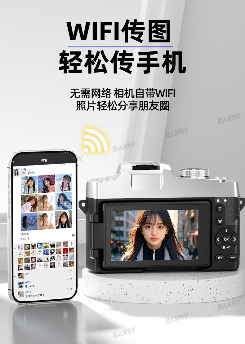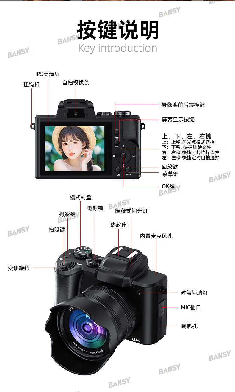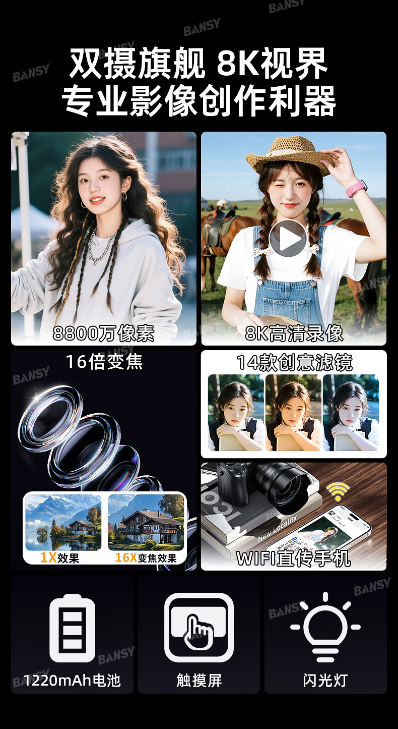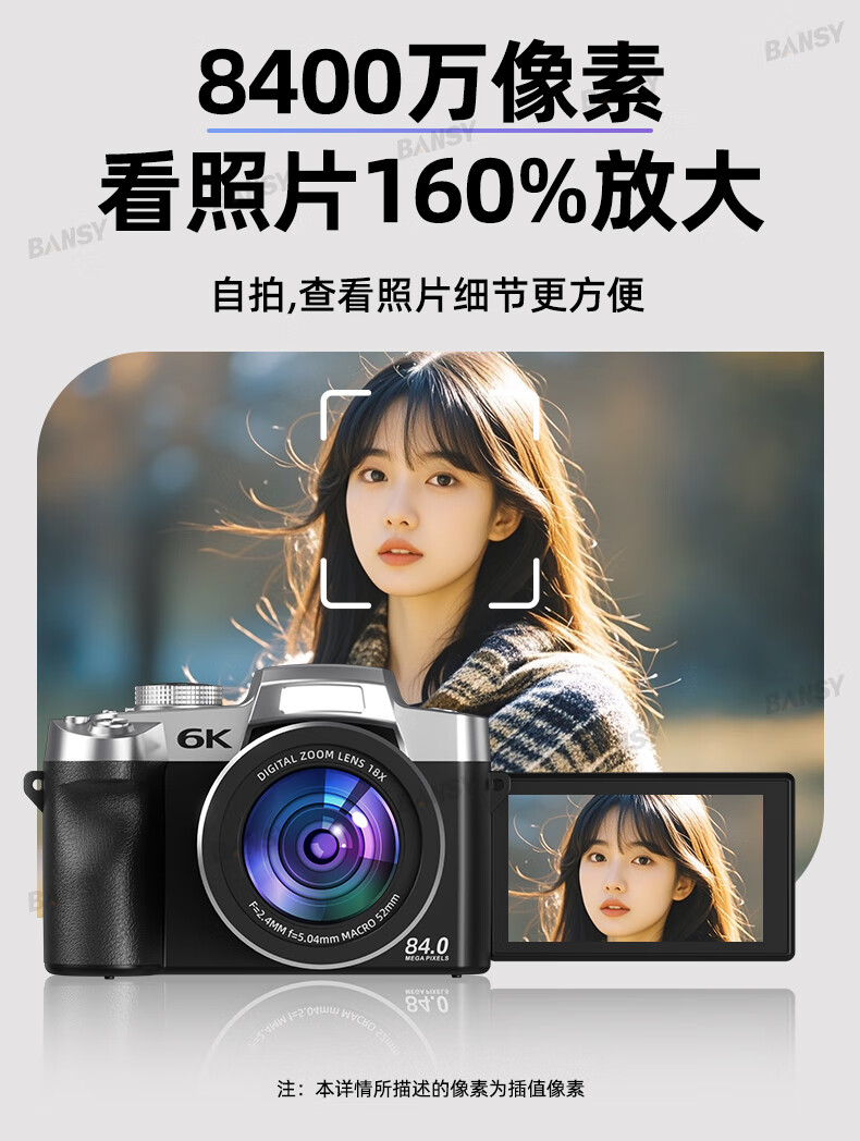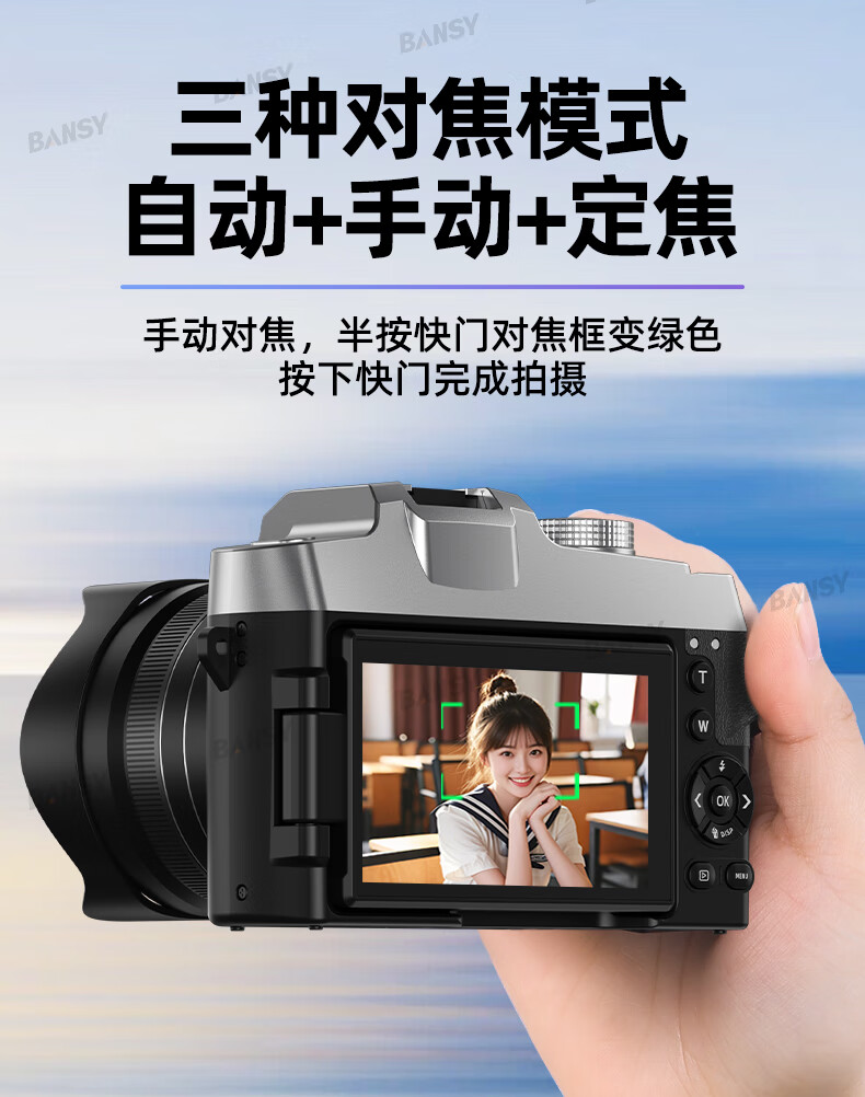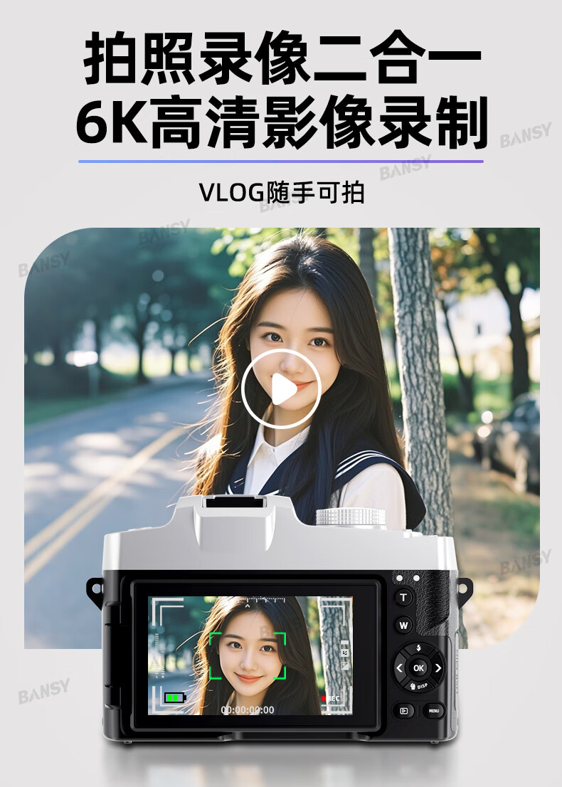 Bansy high-definition digital camera for photography and travel, entry-level 8K mirrorless camera for students, CCD replacement for high pixels, transferable to mobile phone, high school vlog shooting, SLR portable, 3.2-inch dual camera + 128G card + 8800W + 8K video recording, Sony sensor | Beauty filter | WiFi image transmission | Fill light
