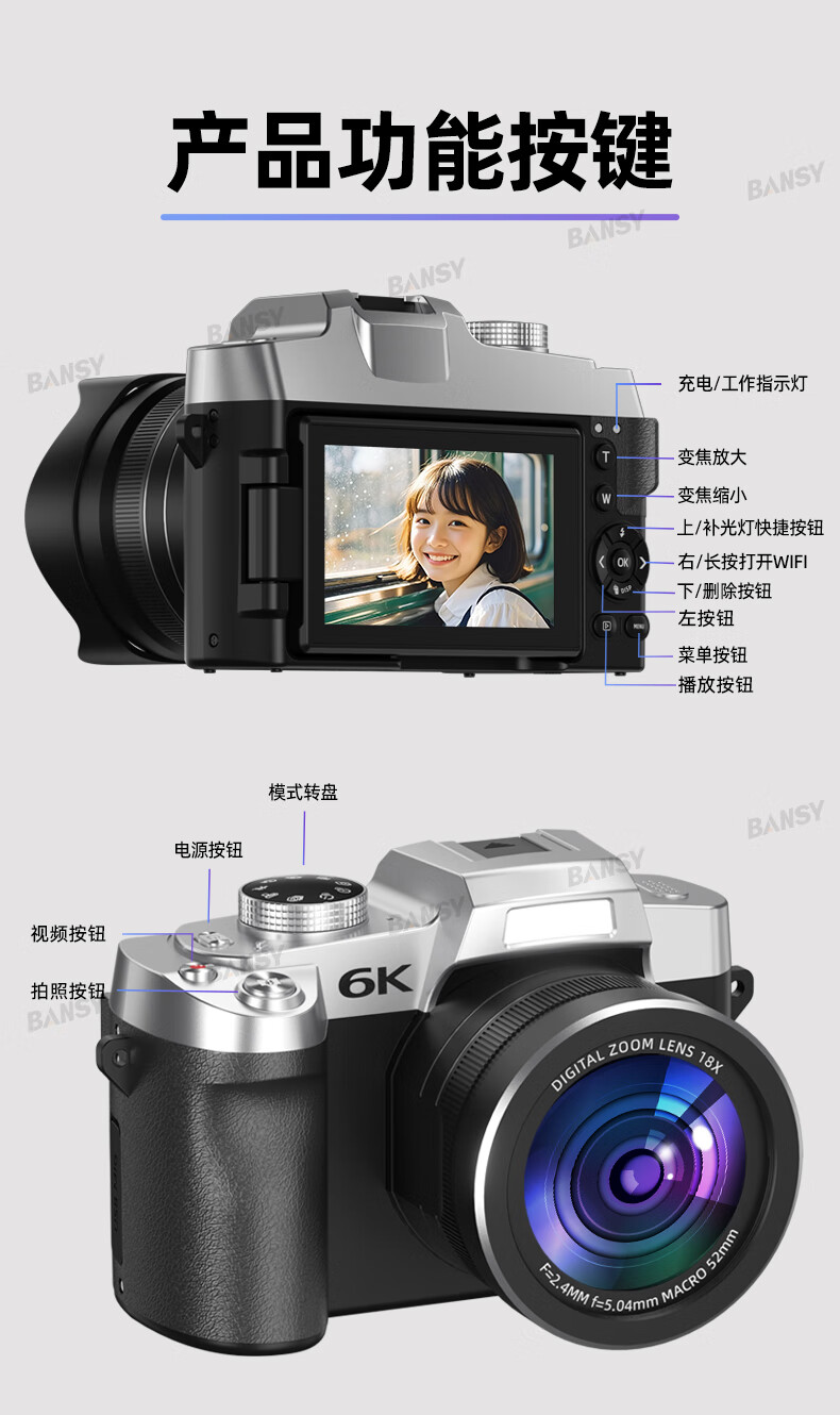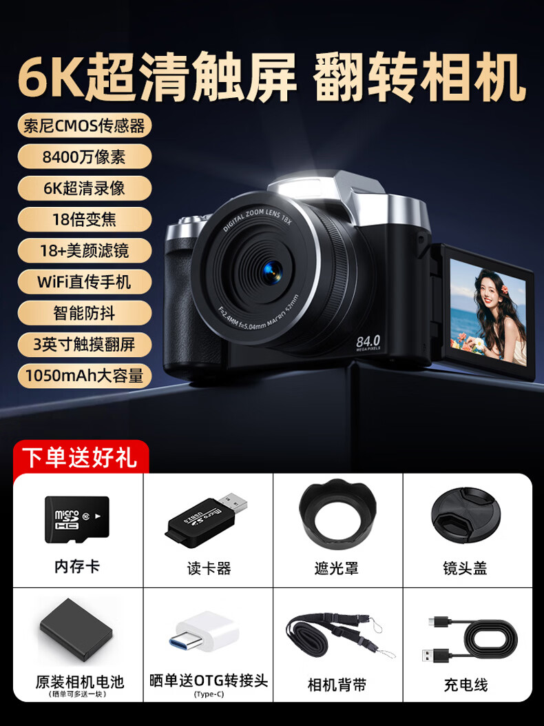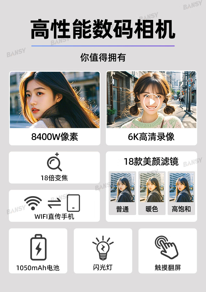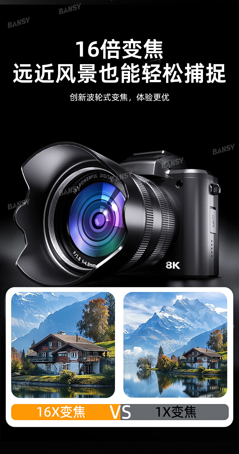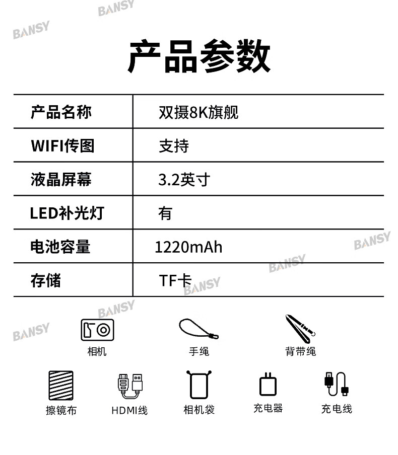 Bansy high-definition digital camera for photography and travel, entry-level 8K mirrorless camera for students, CCD replacement for high pixels, transferable to mobile phone, high school vlog shooting, SLR portable, 3.2-inch dual camera + 128G card + 8800W + 8K video recording, Sony sensor | Beauty filter | WiFi image transmission | Fill light