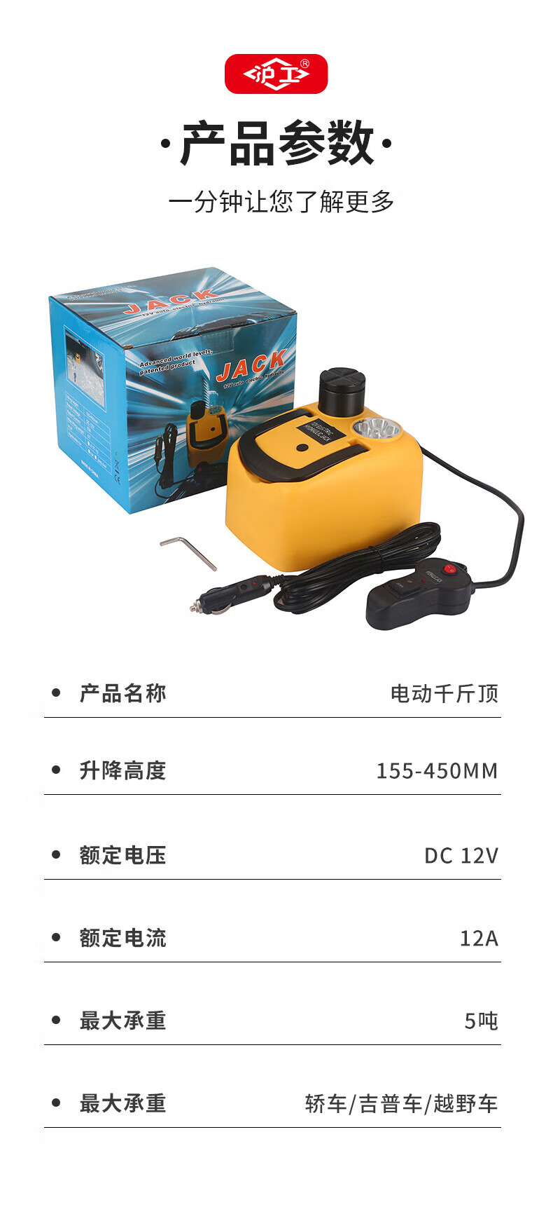 Hugong Portable Vehicle Mounted Electric Jack Weighing 5T Hydraulic Jack Vehicle Mounted Tire Changing Tool