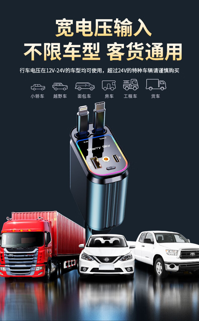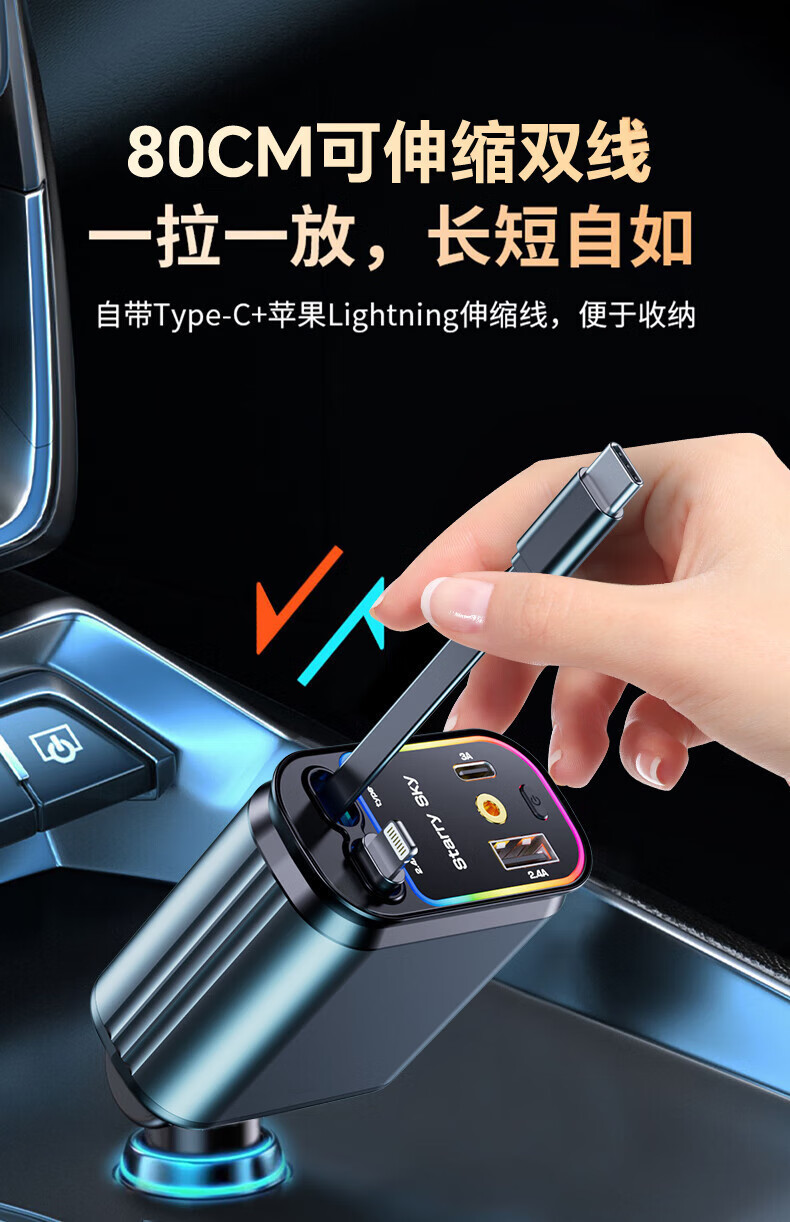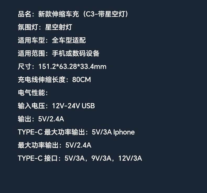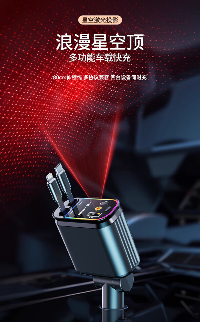 Starry sky top car charger 120W fast charging car charger with retractable cord ambient light car cigarette lighter 2025 model *TYPE-C+ starry sky top+fast