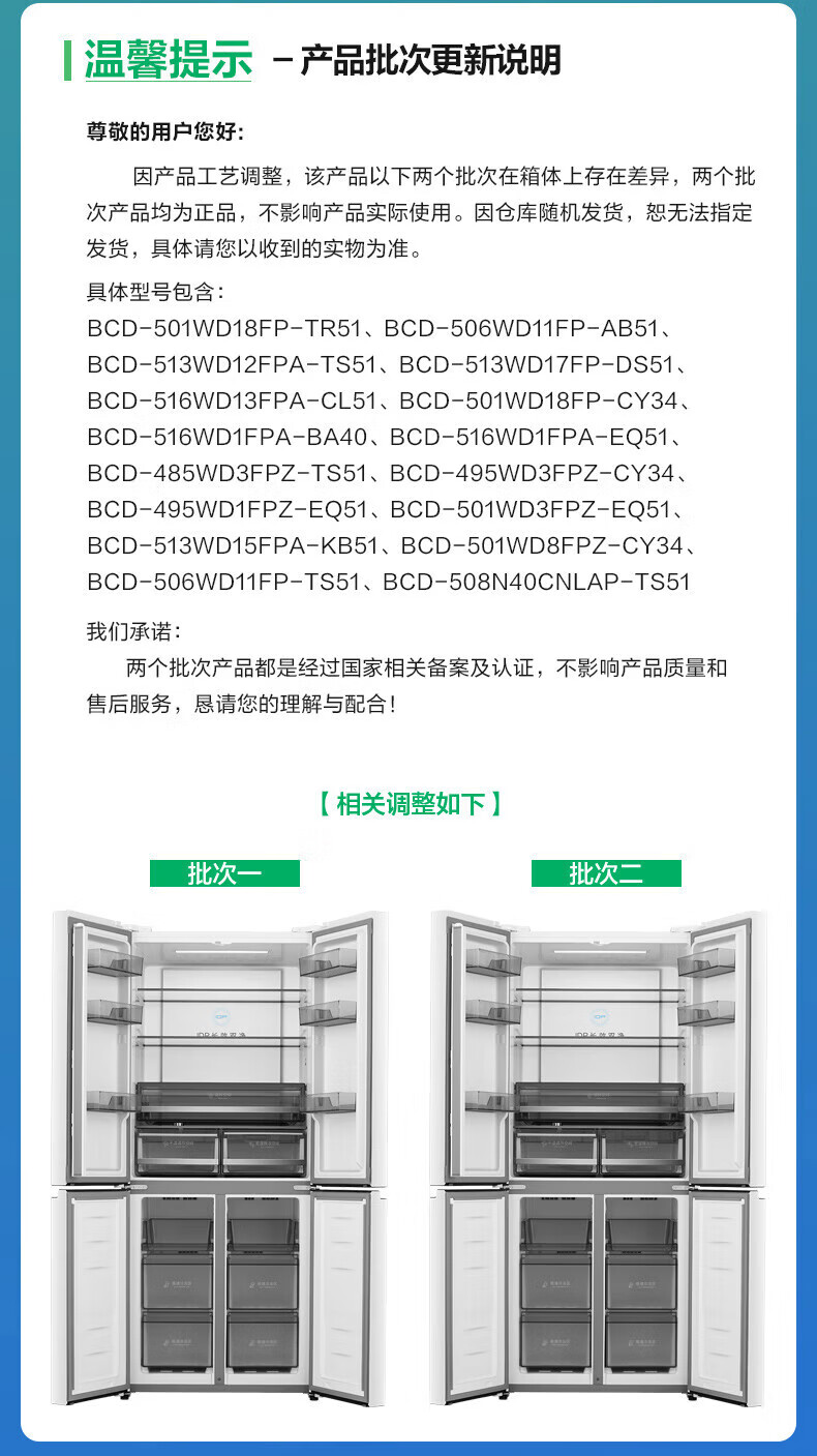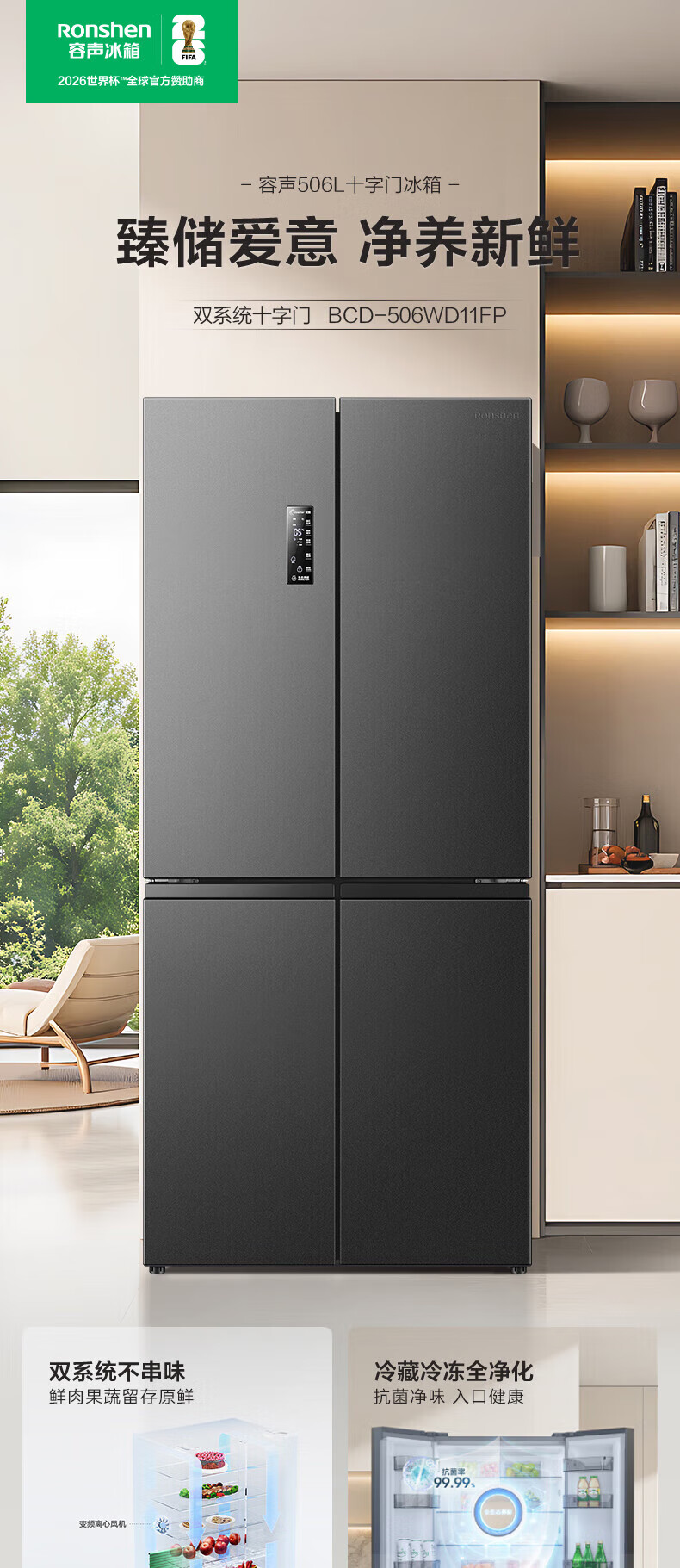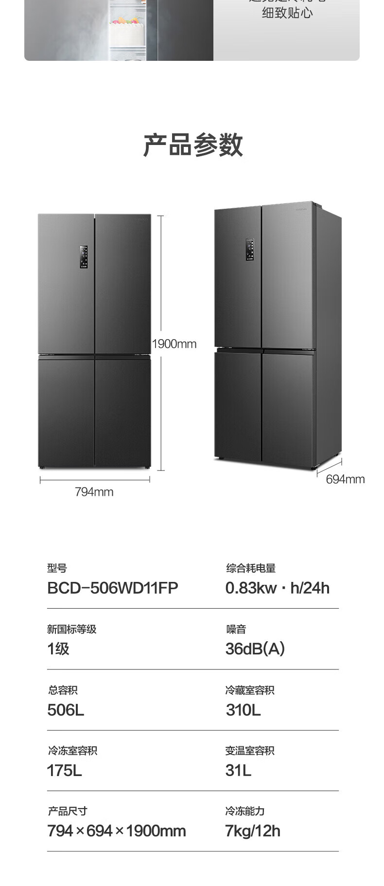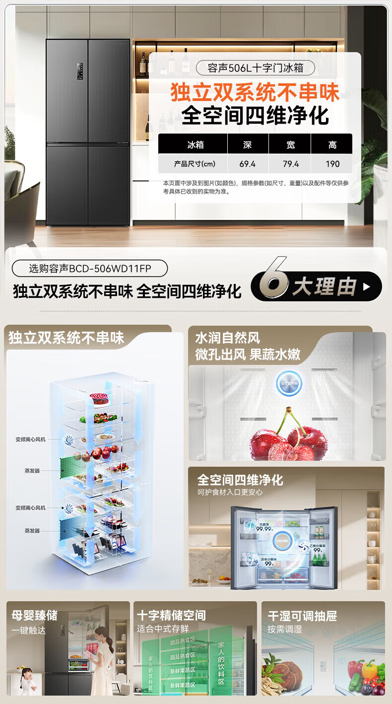 Rongsheng 506-liter dual-system dual-cycle cross-fold four-door refrigerator household first-class energy efficiency energy-saving frequency conversion air-cooled frost-free national subsidy official flagship store BCD-506WD11FP gray