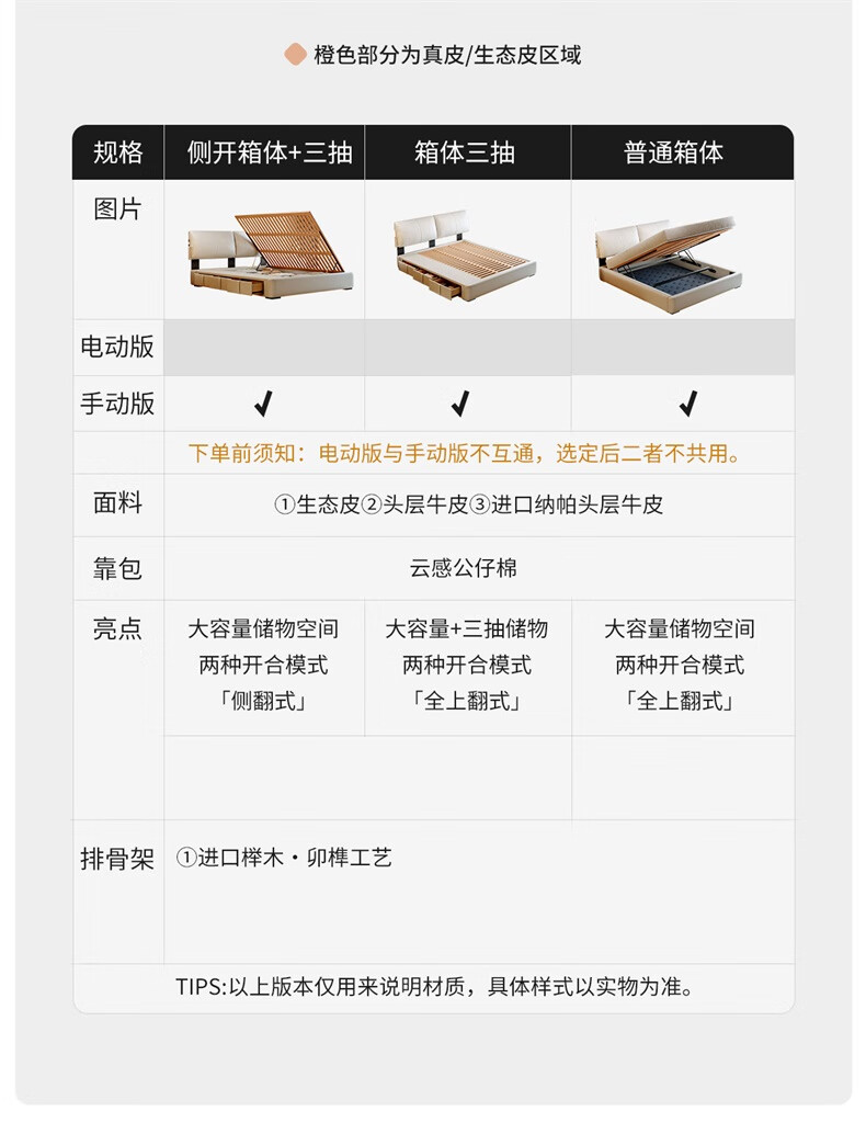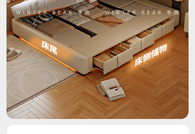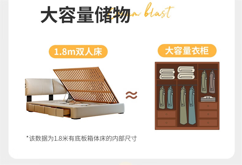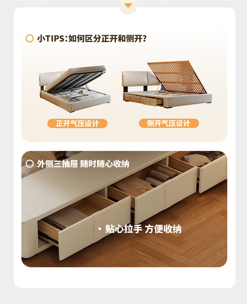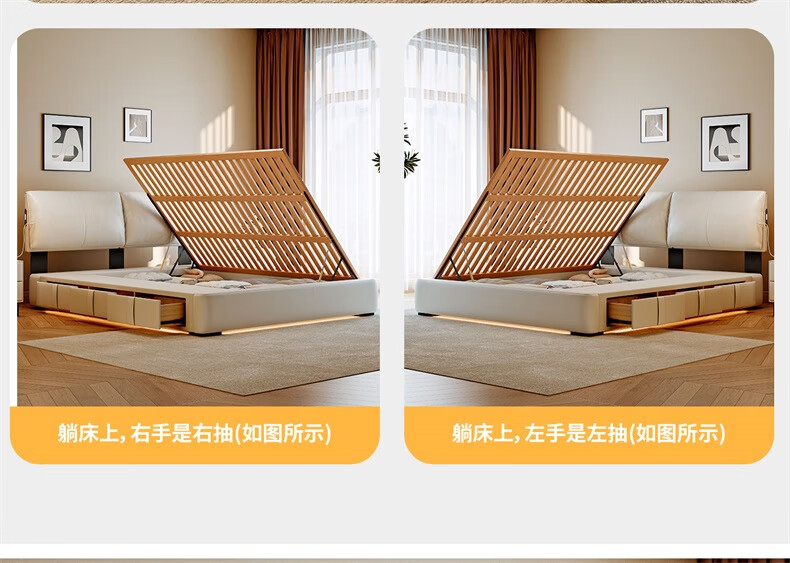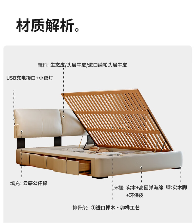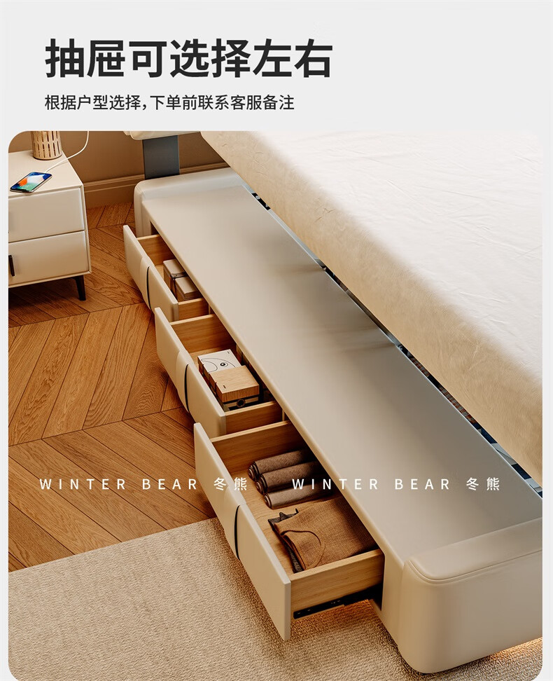 Dongxiong ultra-thin bedside side-opening storage three-drawer bed small apartment space-saving box with flush elephant ear leather bed first layer cowhide bed/full solid wood beech wood rib frame 1500mm*2000mm box side-opening three drawers