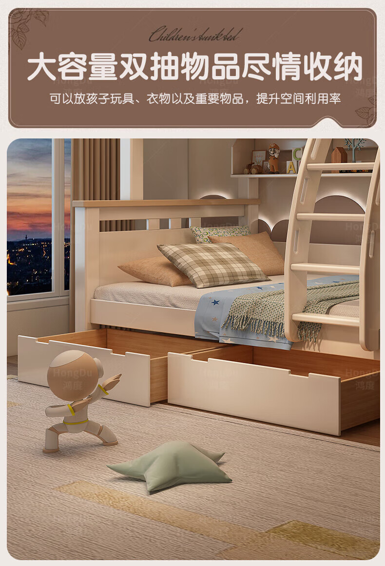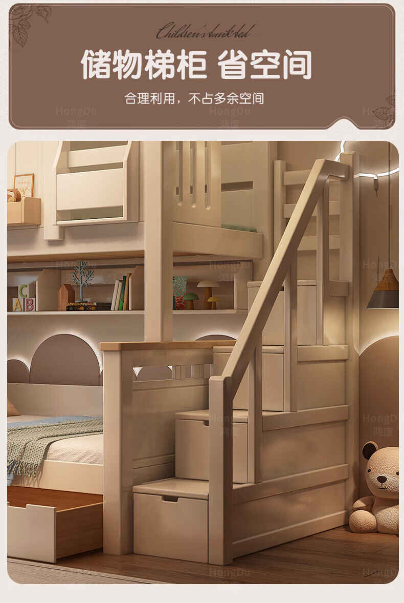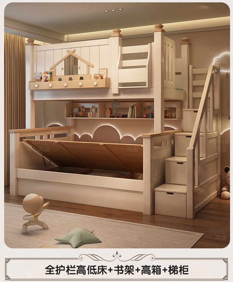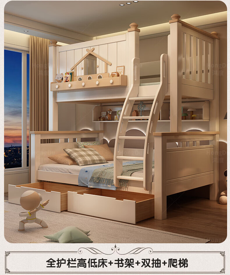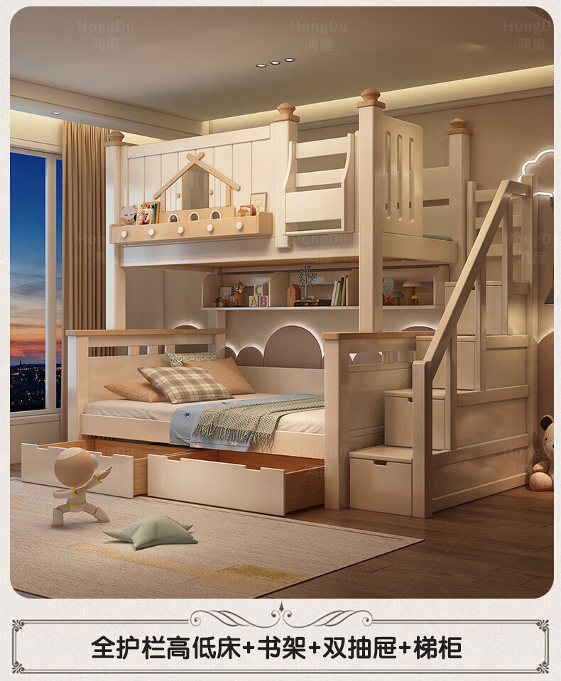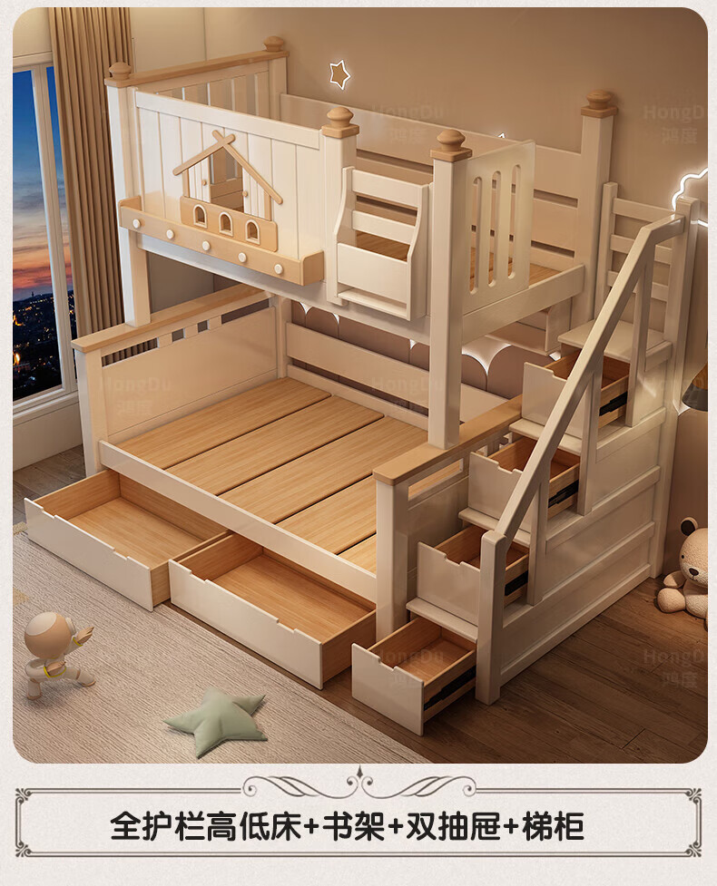 Fenlis all solid wood bed and bunk bed, children's bed, high and low beds do not interfere with each other, double bed and double bed with high guardrails, high and low bed + bookshelf + double drawers + ladder cabinet, bottom bunk 1.5*1.9 meters, upper bunk 1.2*1.9 meters