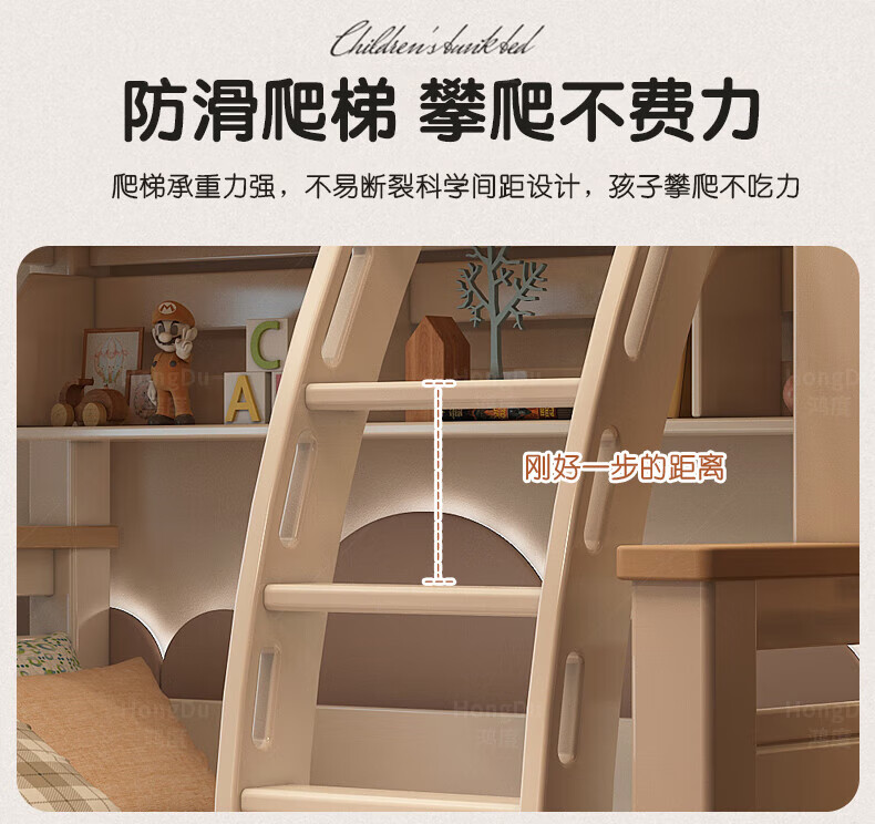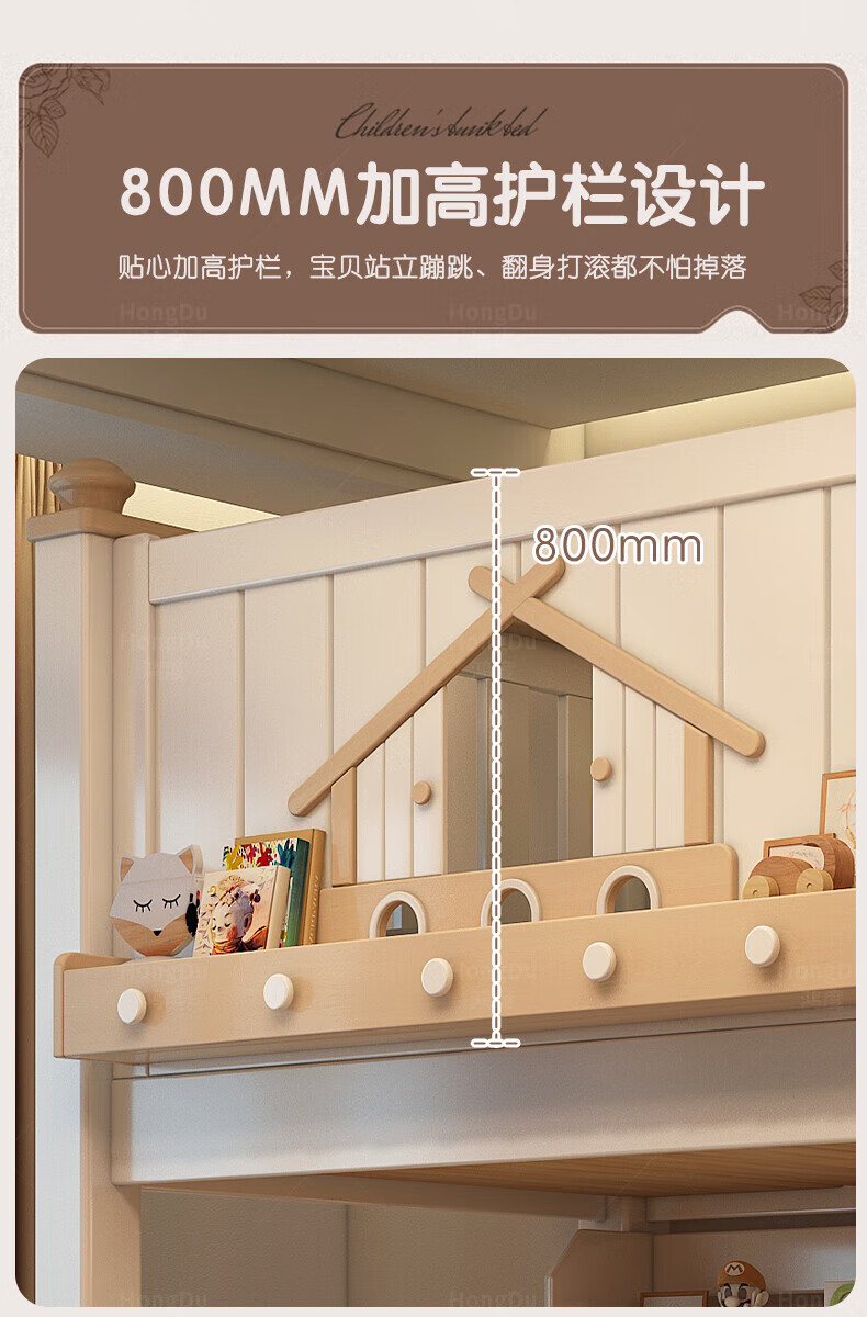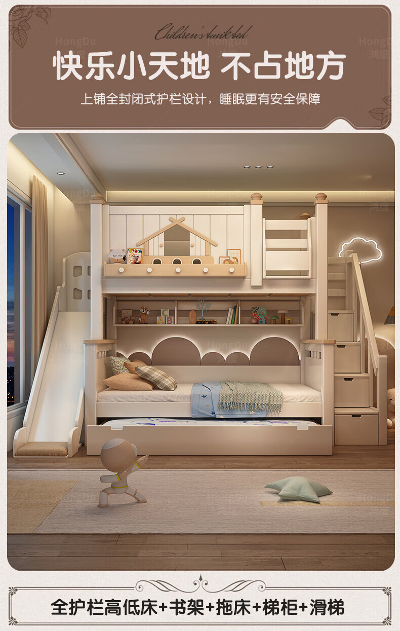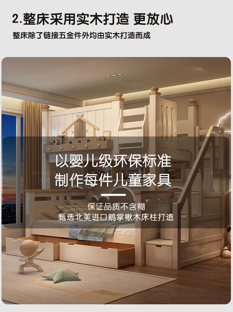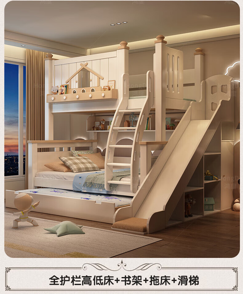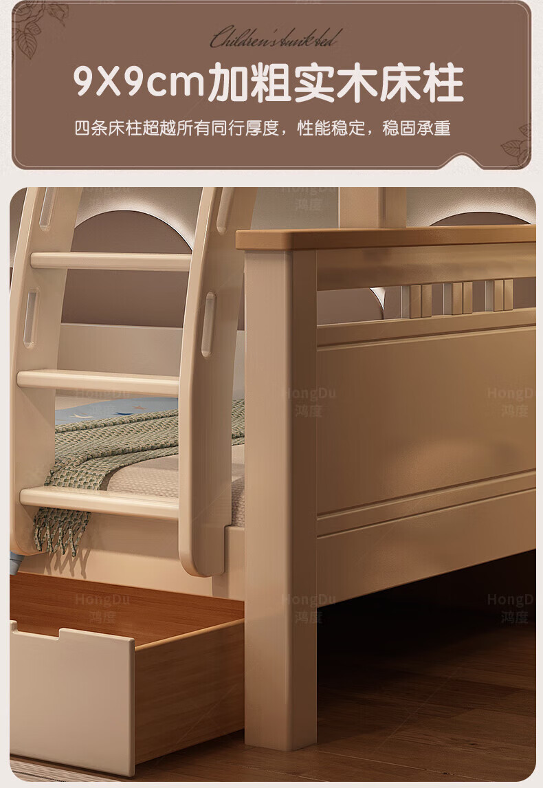Fenlis all solid wood bed and bunk bed, children's bed, high and low beds do not interfere with each other, double bed and double bed with high guardrails, high and low bed + bookshelf + double drawers + ladder cabinet, bottom bunk 1.5*1.9 meters, upper bunk 1.2*1.9 meters