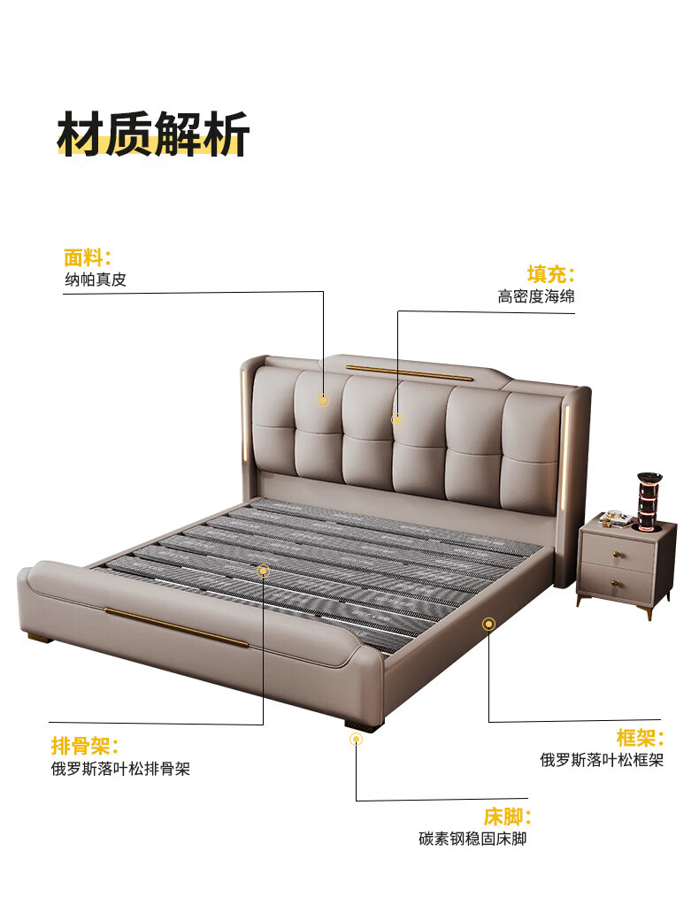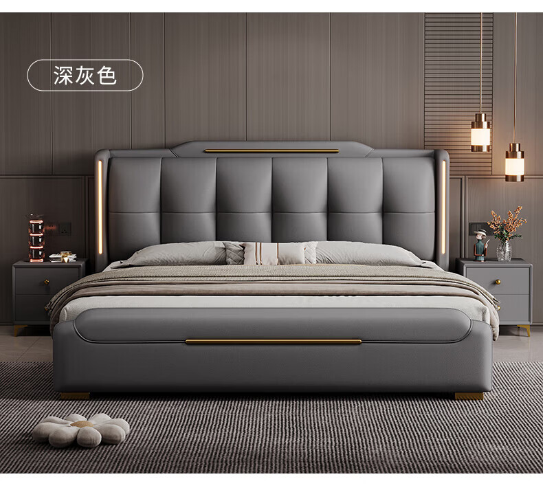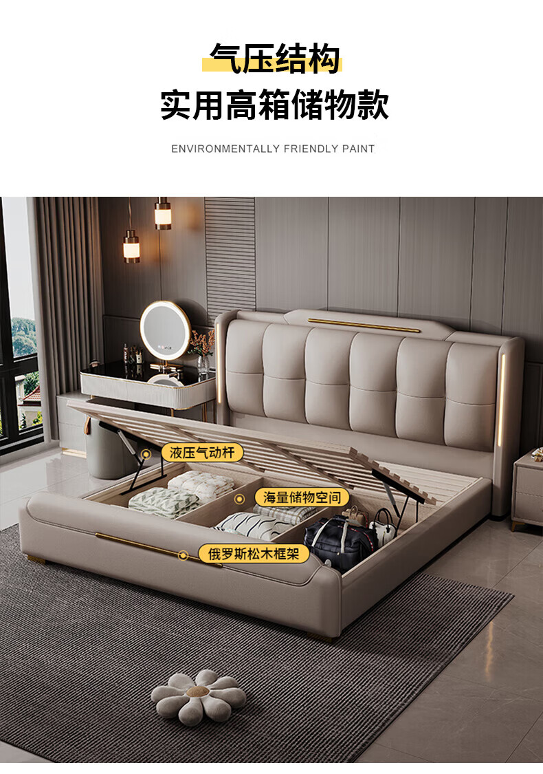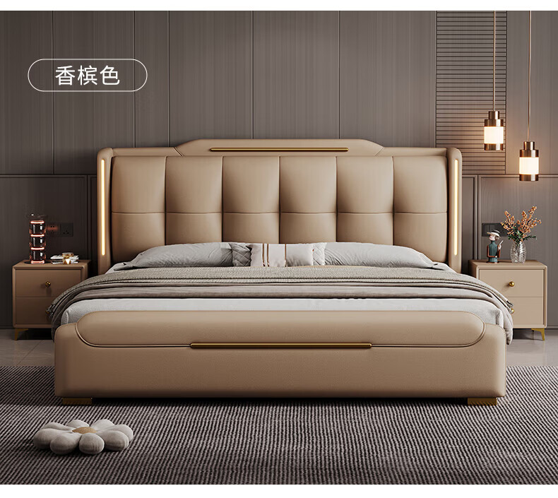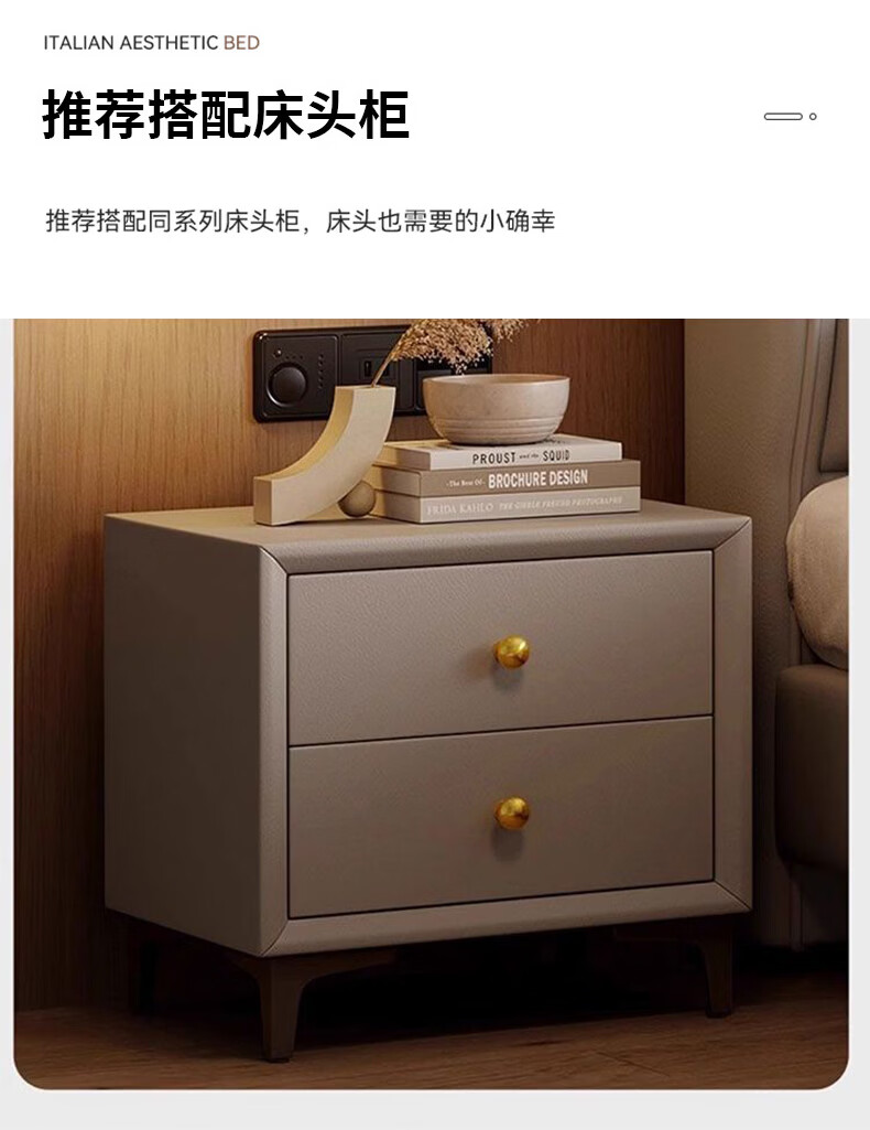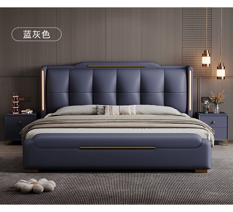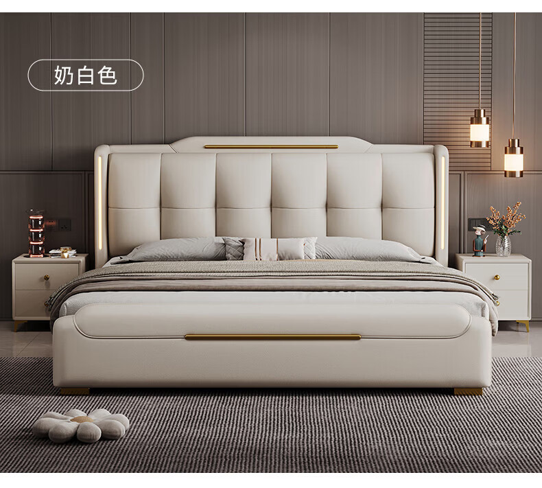 Light luxury style leather bed with light double bed 1m8 master bed 2m large bed wedding bed secondary bed 1m5 single bed bed + 5D honeycomb latex mattress + cabinet 1 + package installation 2.0*2.2m full bed bed frame