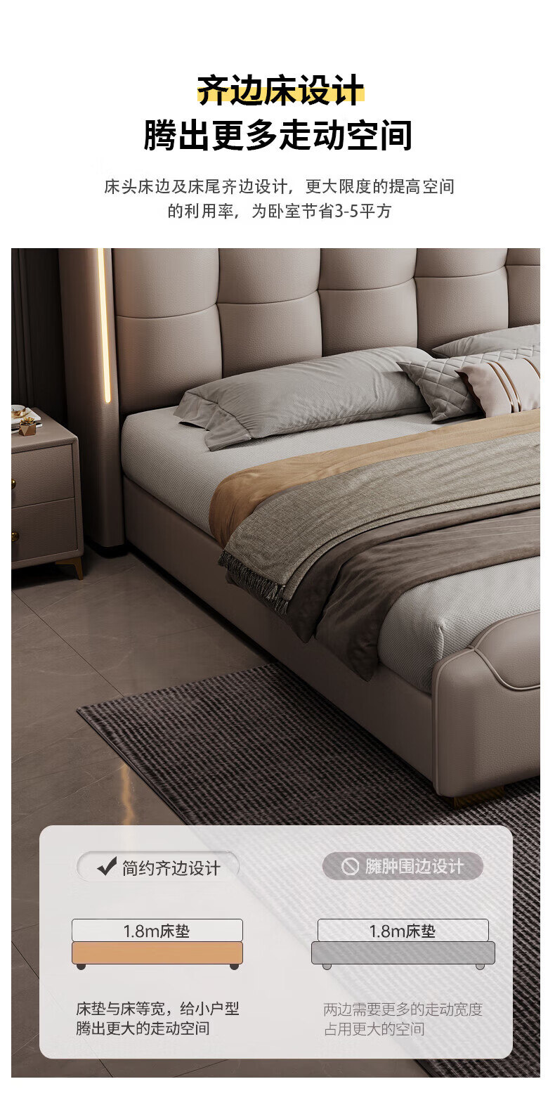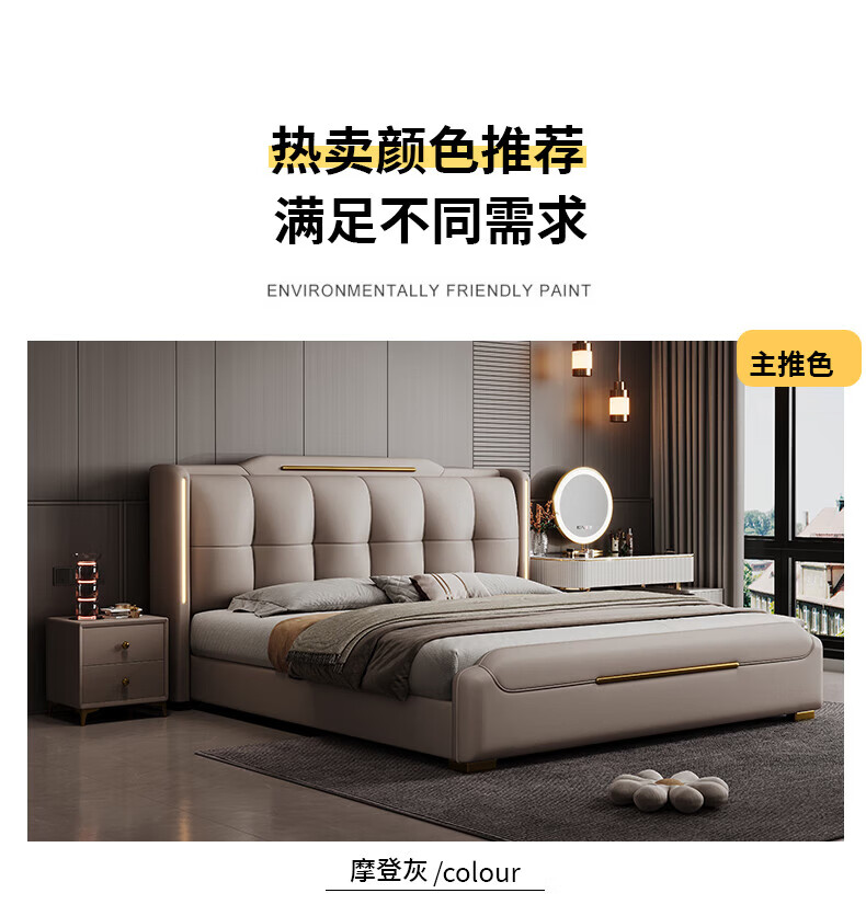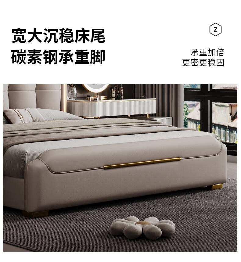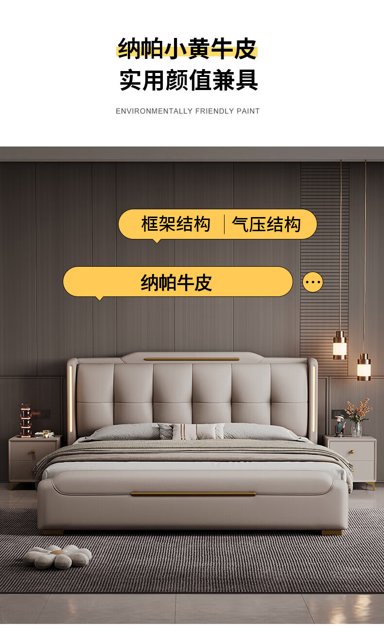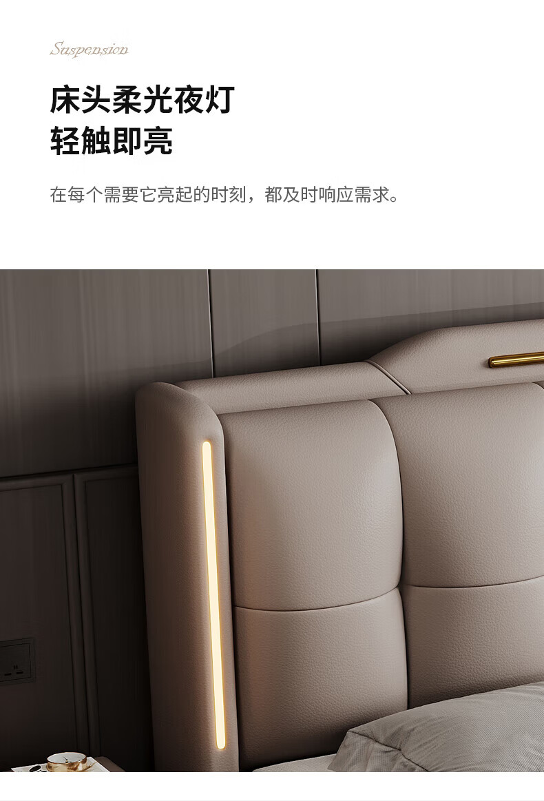 Light luxury style leather bed with light double bed 1m8 master bed 2m large bed wedding bed secondary bed 1m5 single bed bed + 5D honeycomb latex mattress + cabinet 1 + package installation 2.0*2.2m full bed bed frame