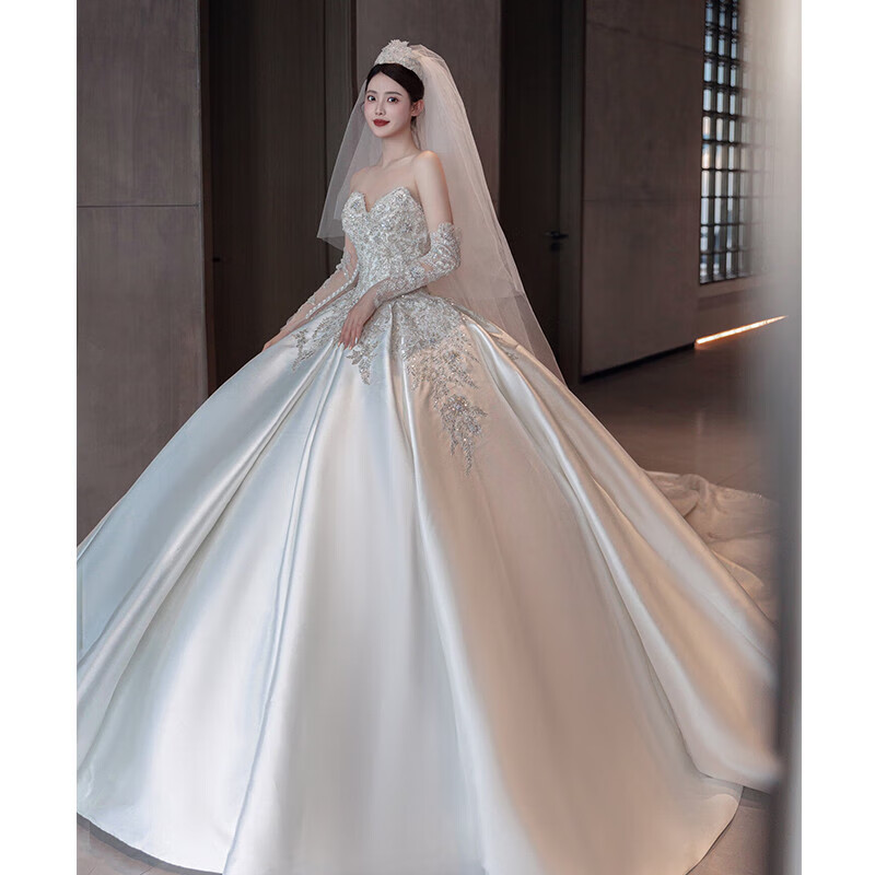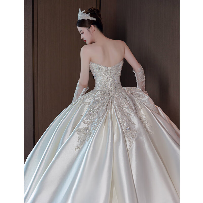 Ovivo satin wedding dress 2025 petite bride main yarn French retro tube top texture wedding dress white floor-length style <wedding dress + 3-piece set> M