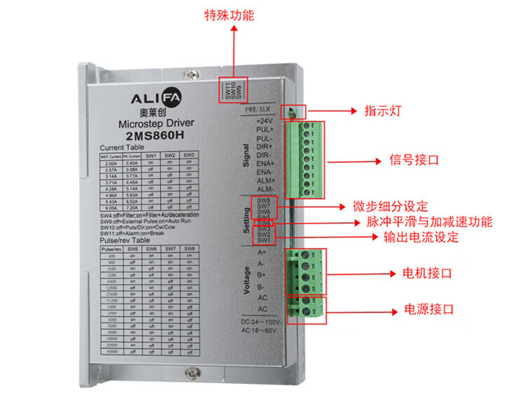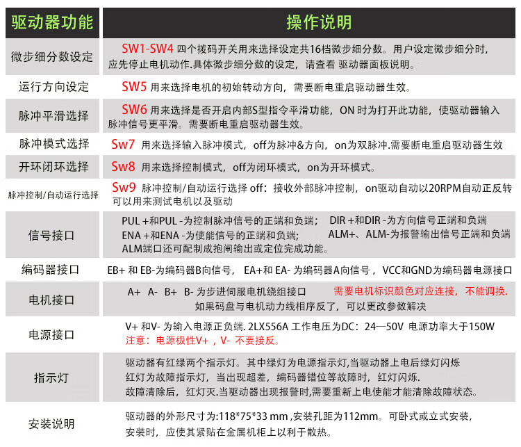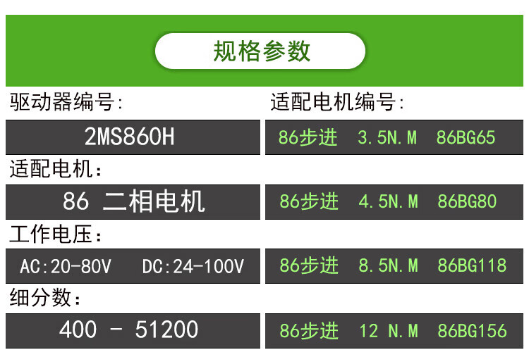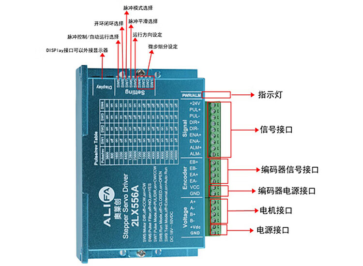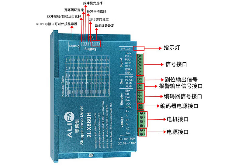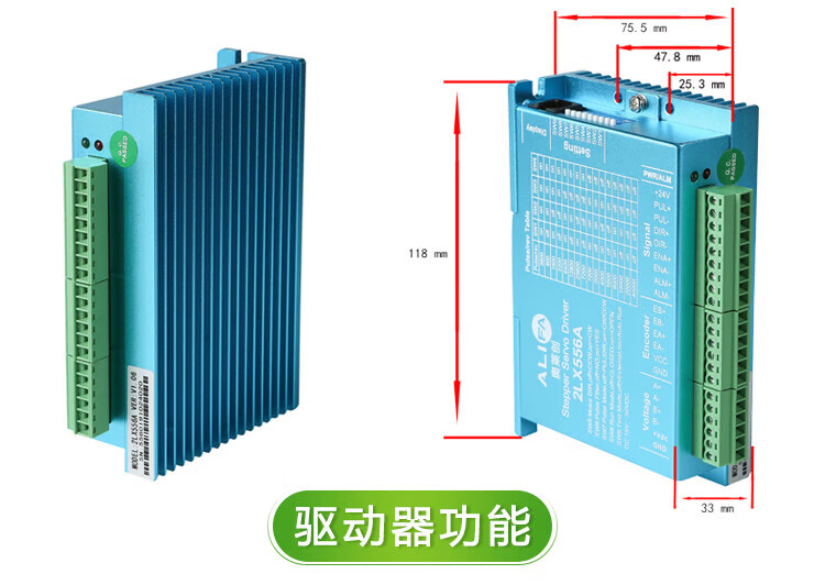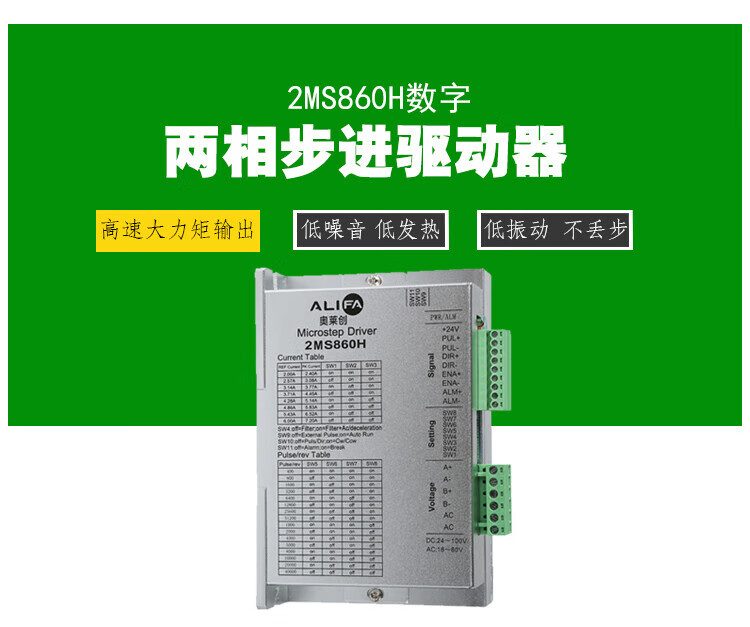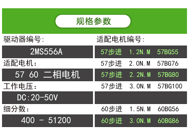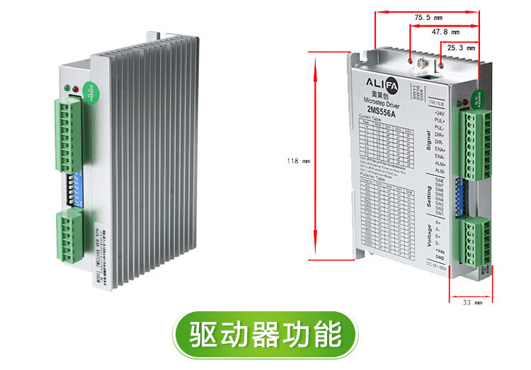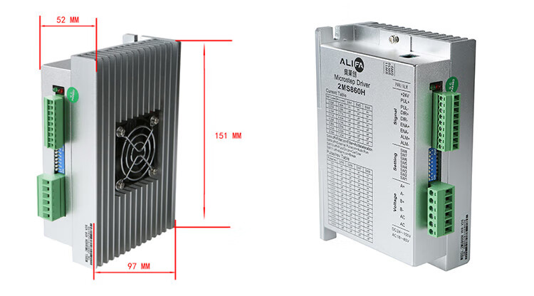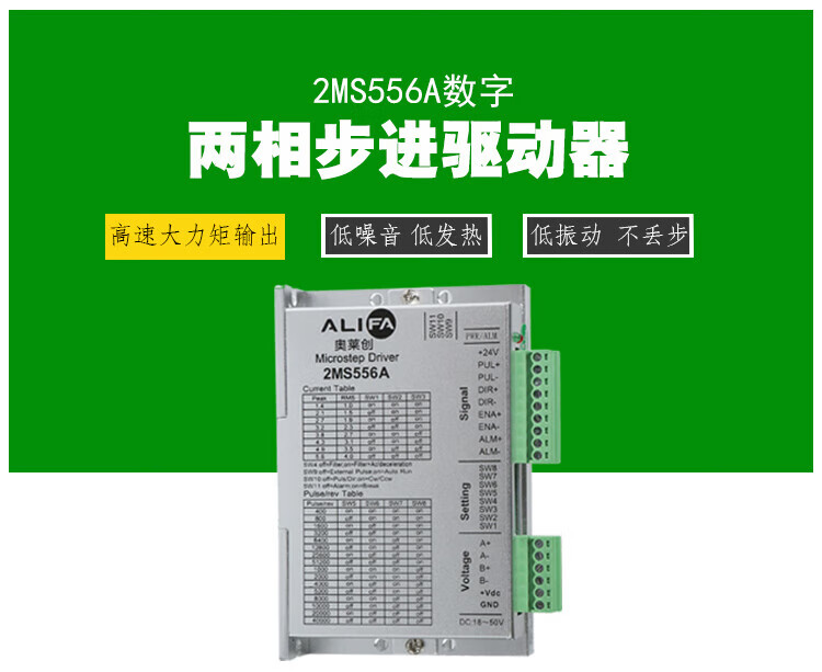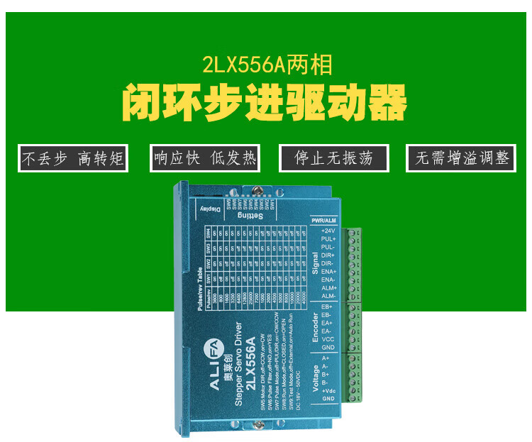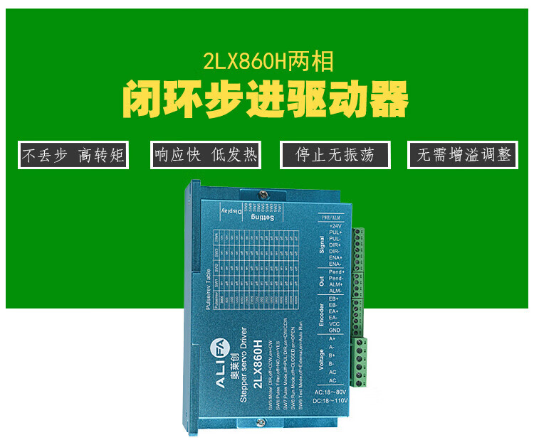 Contains Oletron 86 60 57 closed-loop stepper motor driver 2MS556A (2-phase 5.6A)