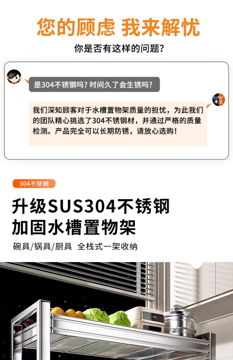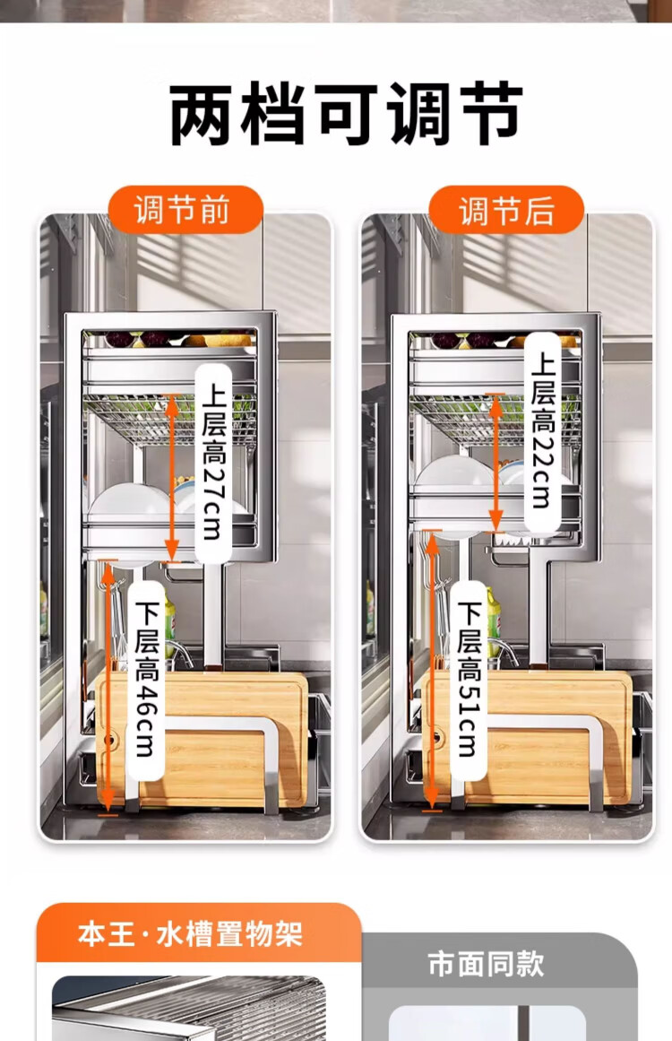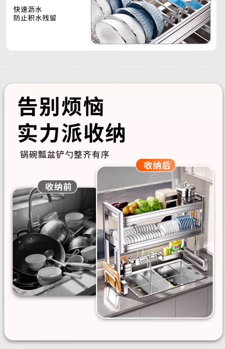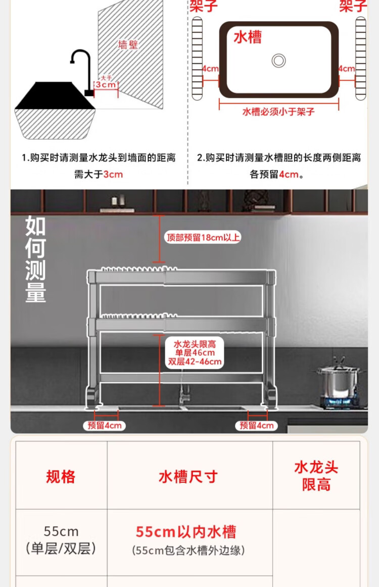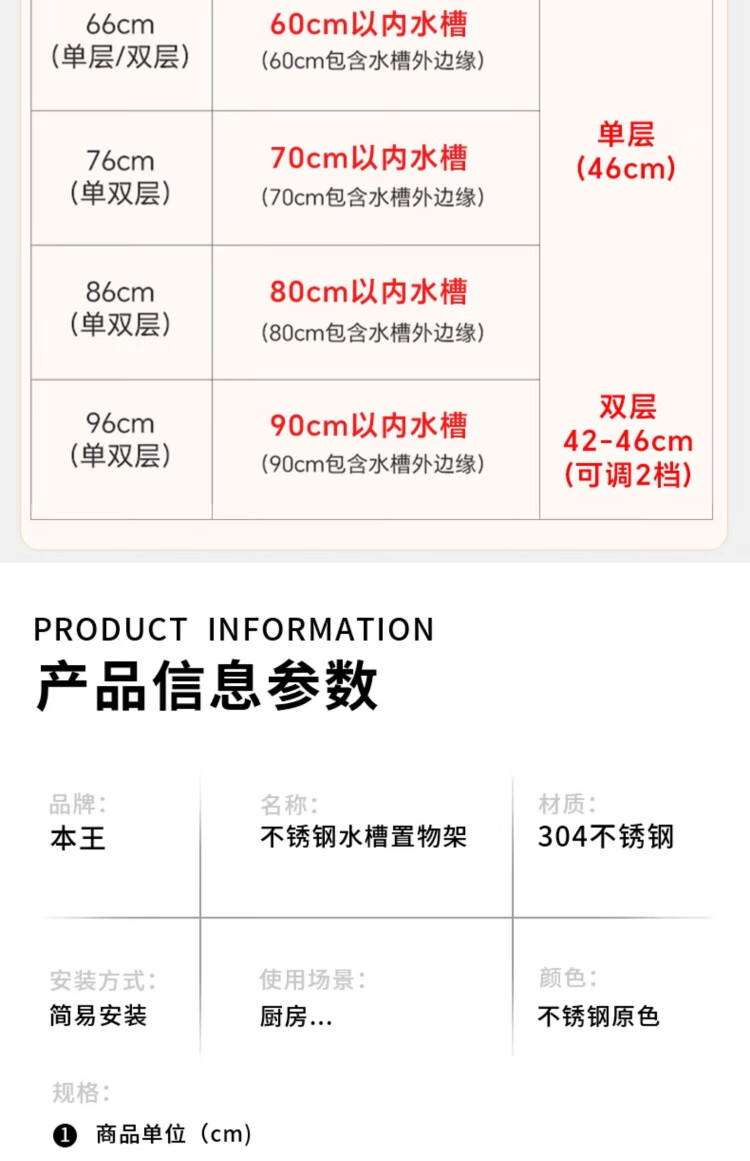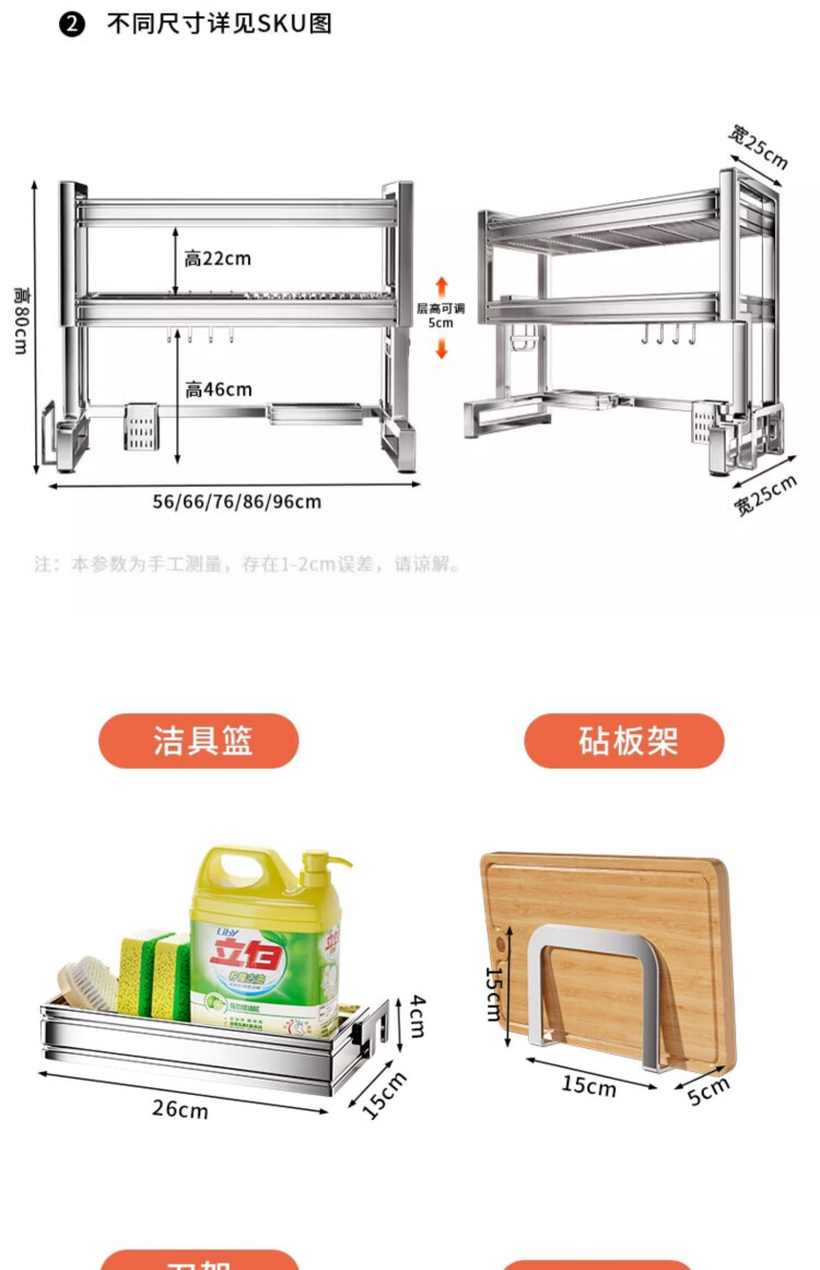 Benwang (BW) stainless steel thickened kitchen sink storage rack drain rack sink side drain basket countertop sink dish storage rack double layer thickened 304 stainless steel 66cm free five-piece set