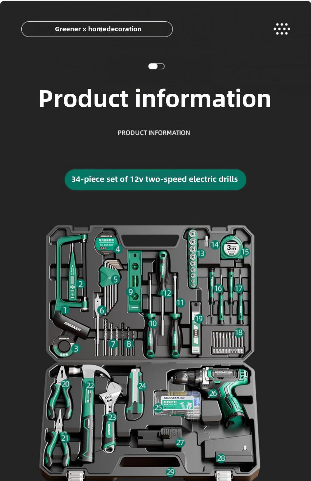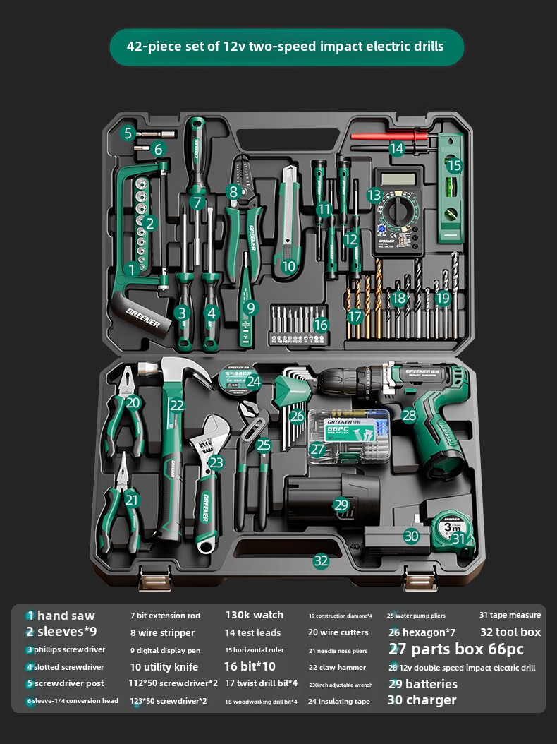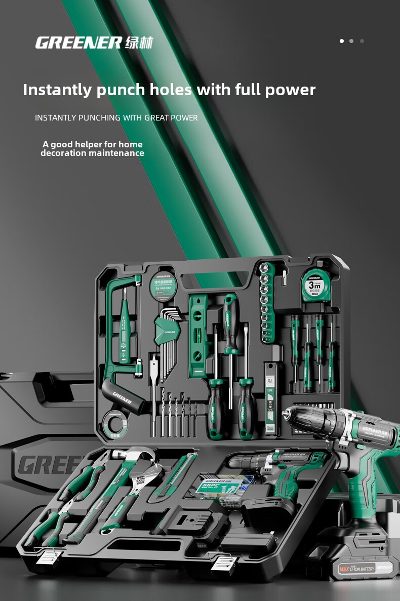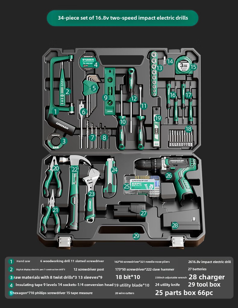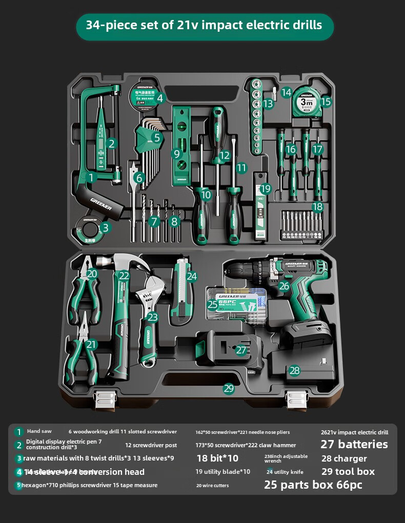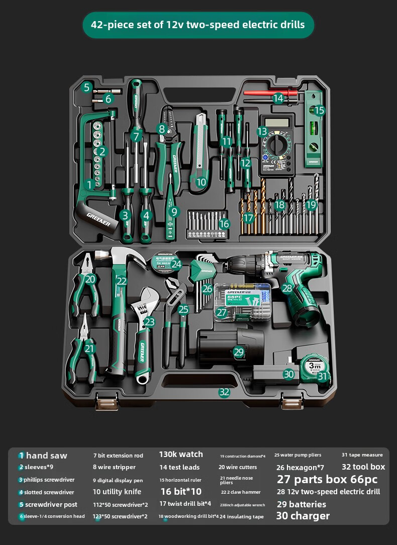 Green Forest Daily Home Hardware Tool Box Set Home Combination Electrician Special Maintenance Car Bracket Complete Set Drill Bit Set Free with Order 12V Dual Speed 34-piece Set