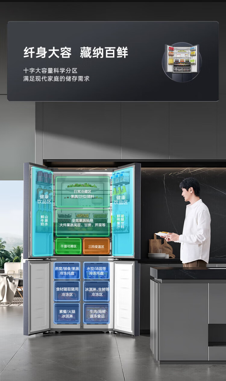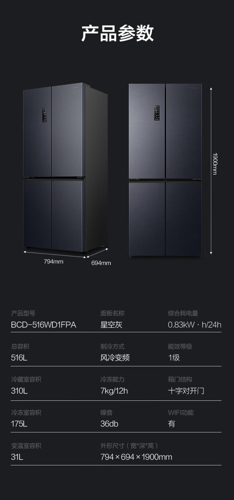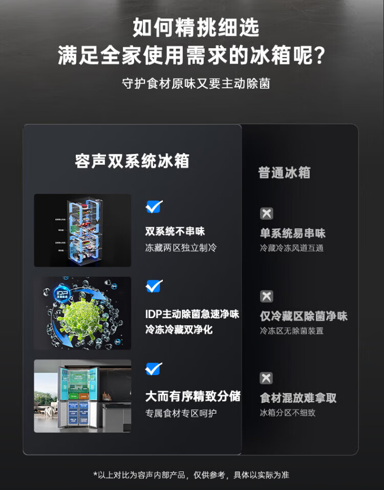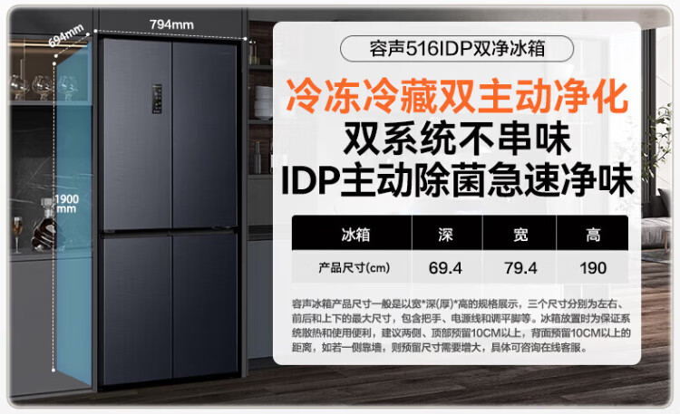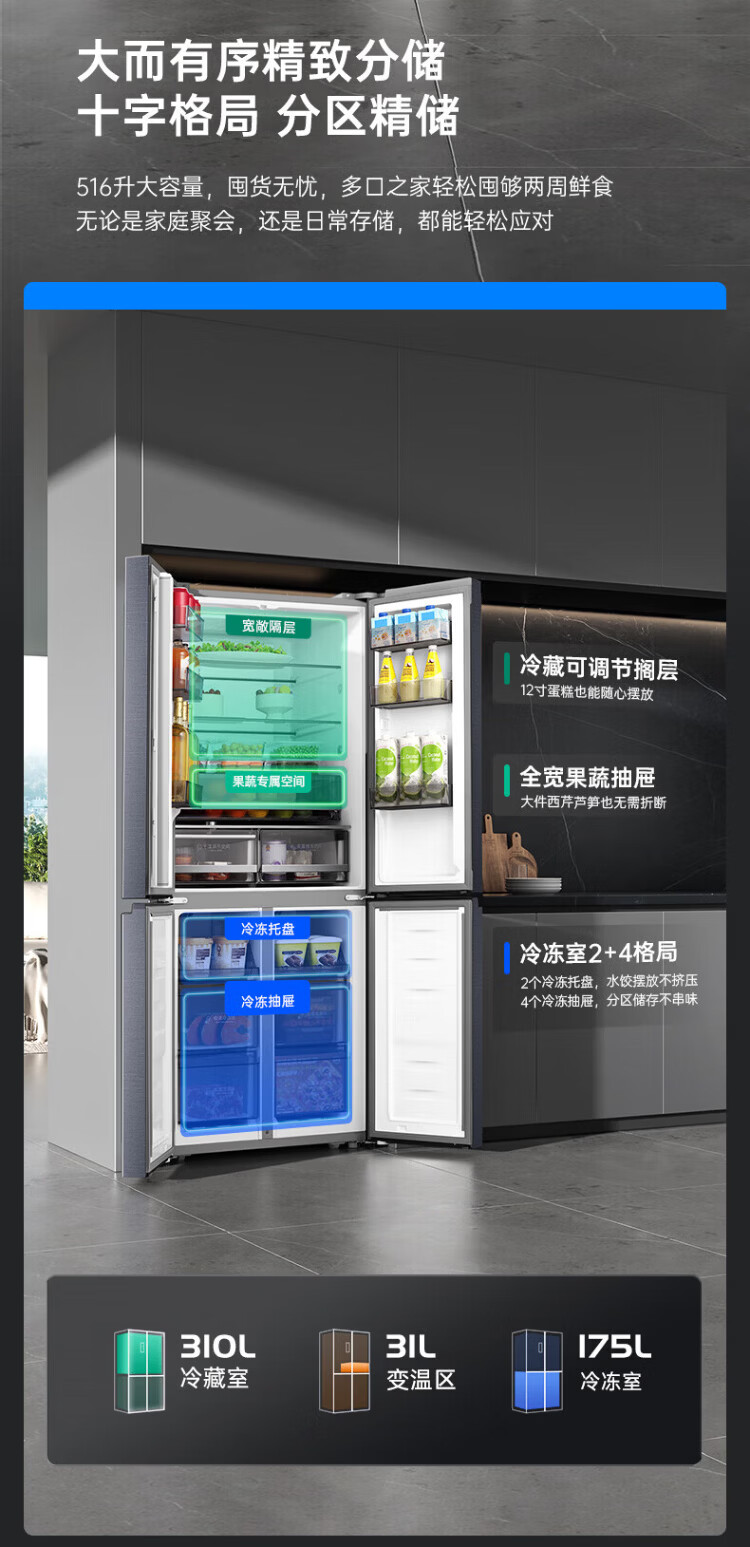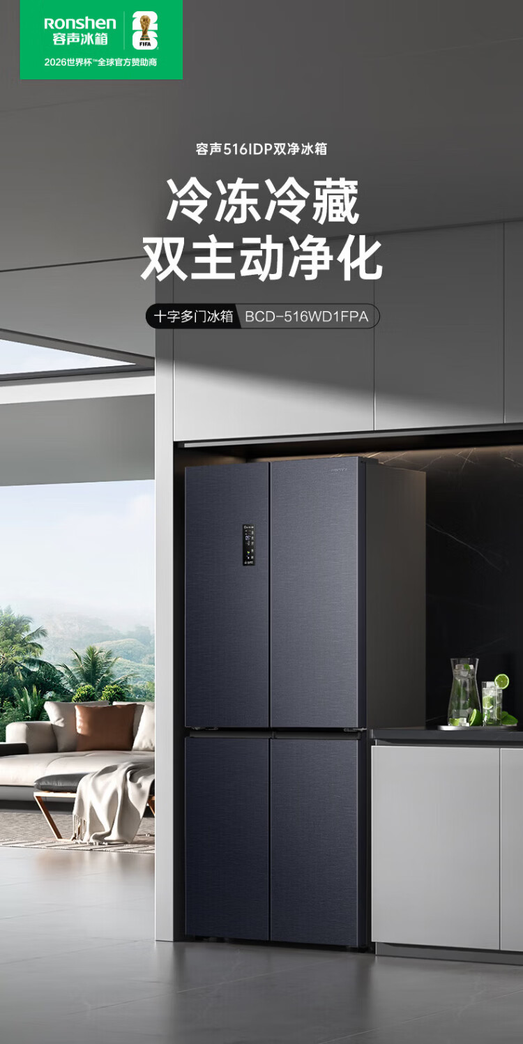 Rongsheng refrigerator 516 liter cross door refrigerator four door side by side dual system dual cycle refrigerator first class energy efficiency air-cooled frost-free frequency conversion energy-saving ultra-thin large capacity national subsidy 516L dual system active sterilization-BCD-516WD1FPA