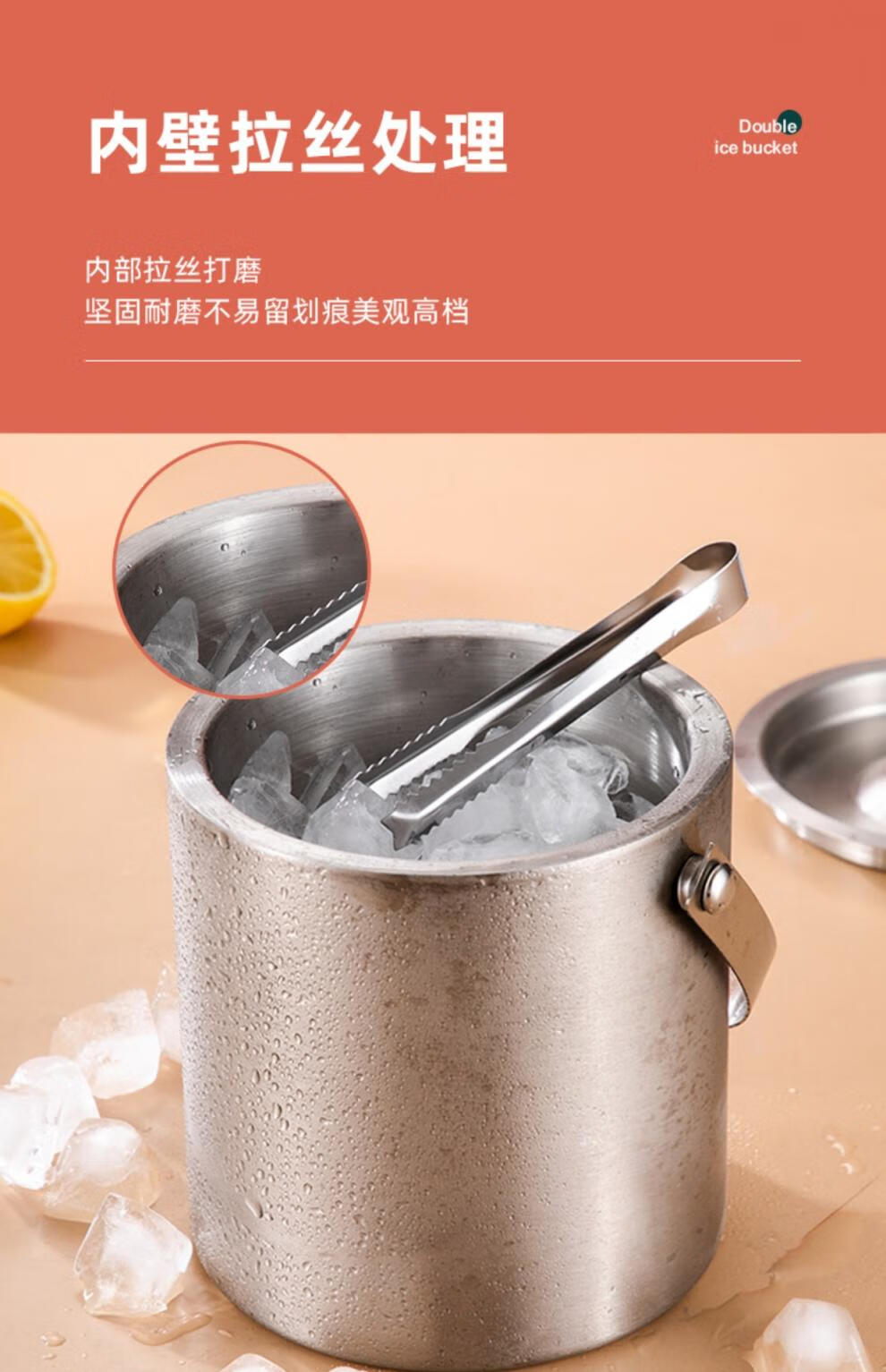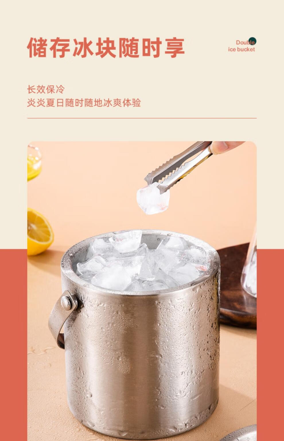 Fat Donglai's same ice storage bucket Internet celebrity 304 stainless steel ice bucket ice bucket bar commercial household small ice silver 304 stainless steel double-layer ice bucket 1.6L + clip