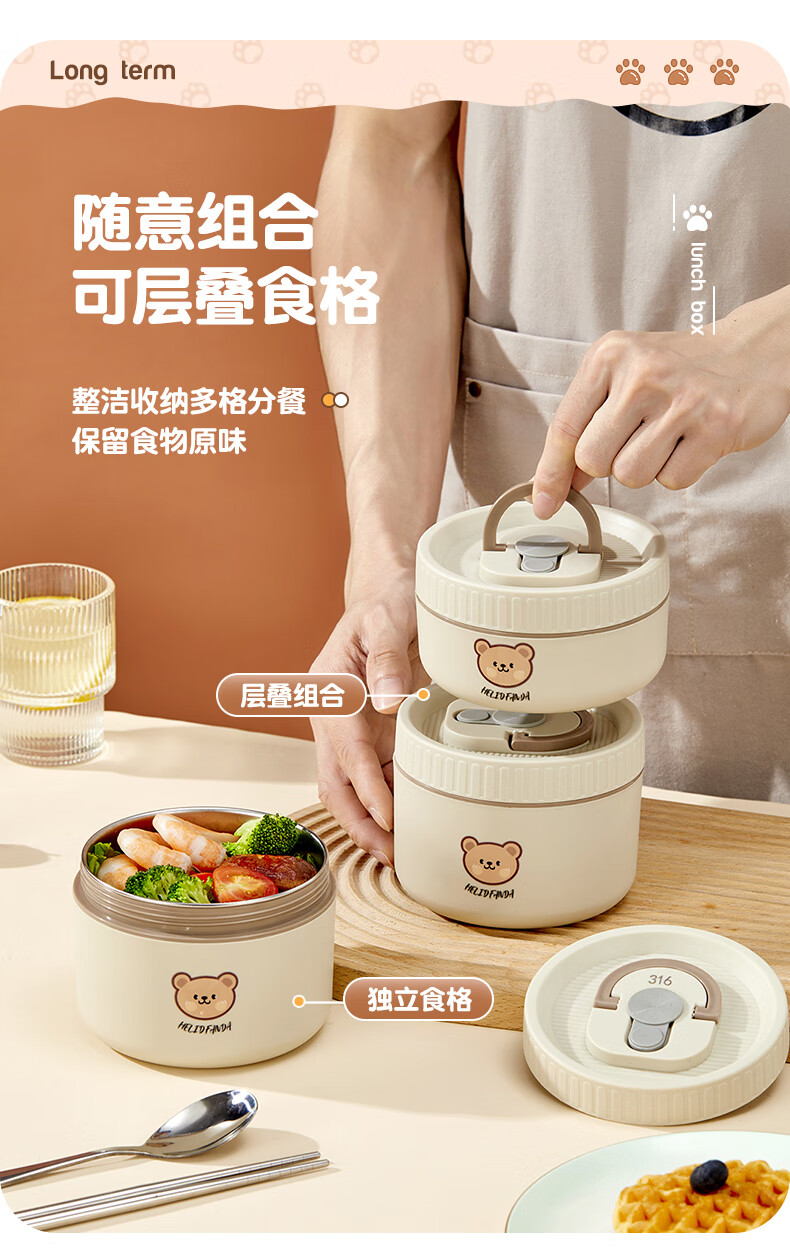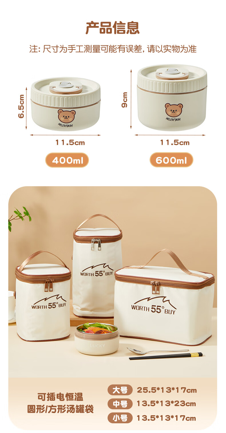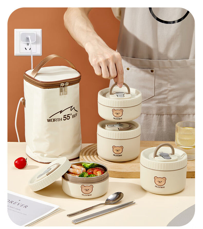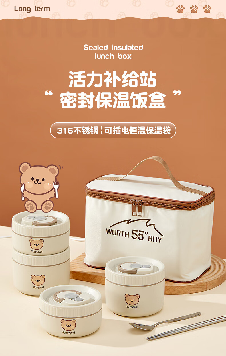 WORTHBUY 24-hour extra long insulated lunch box 316 stainless steel barrel office workers and students plug-in heated lunch box sealed box 304 rice white (1000ml) large + small + tableware + constant temperature bag