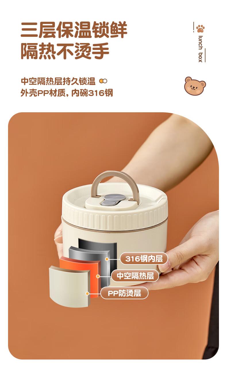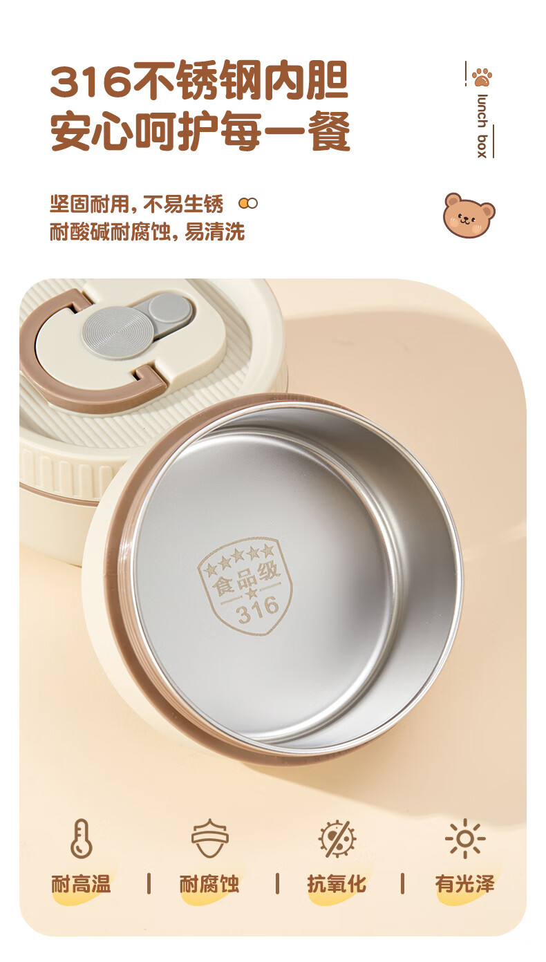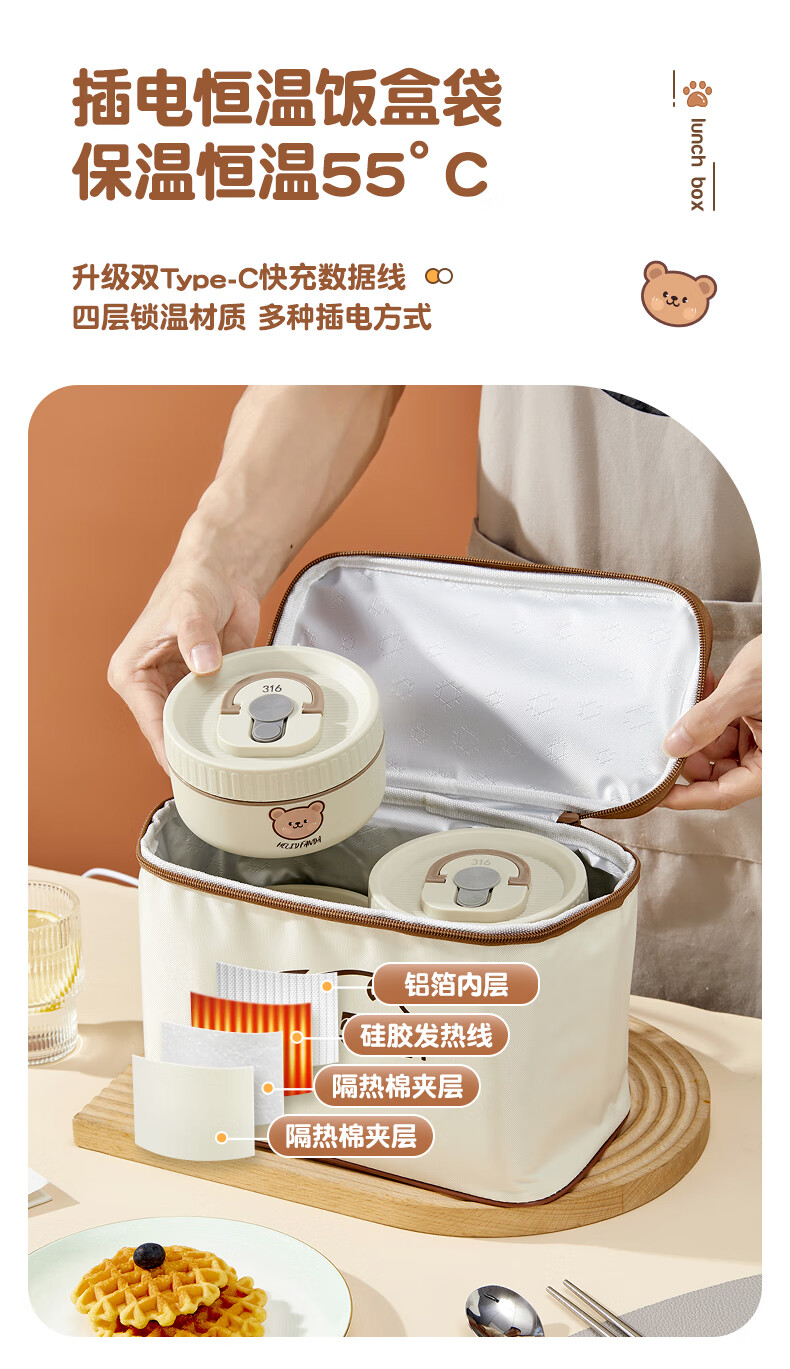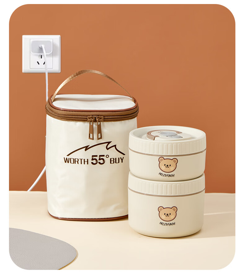 WORTHBUY 24-hour extra long insulated lunch box 316 stainless steel barrel office workers and students plug-in heated lunch box sealed box 304 rice white (1000ml) large + small + tableware + constant temperature bag