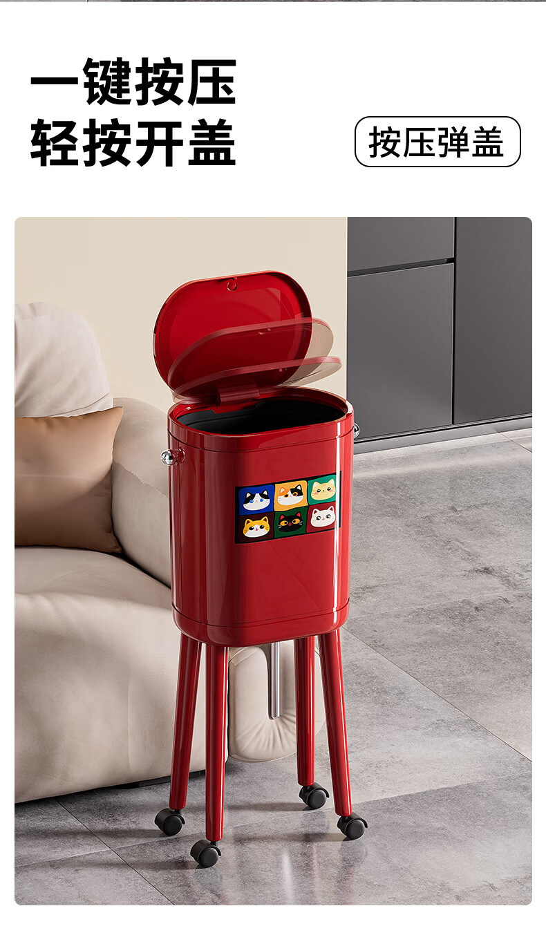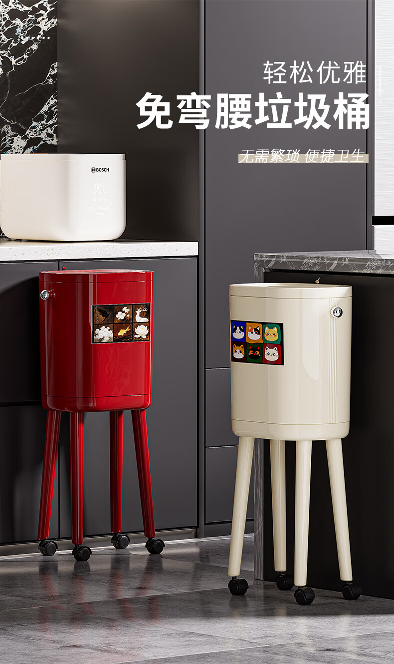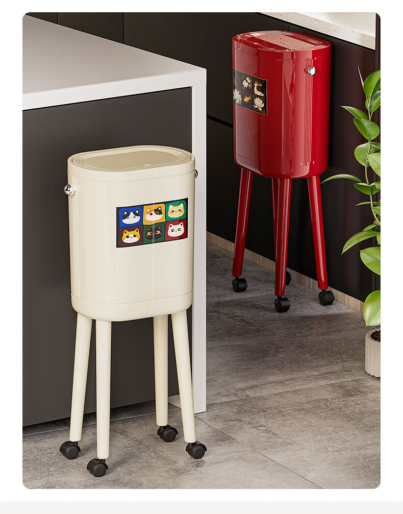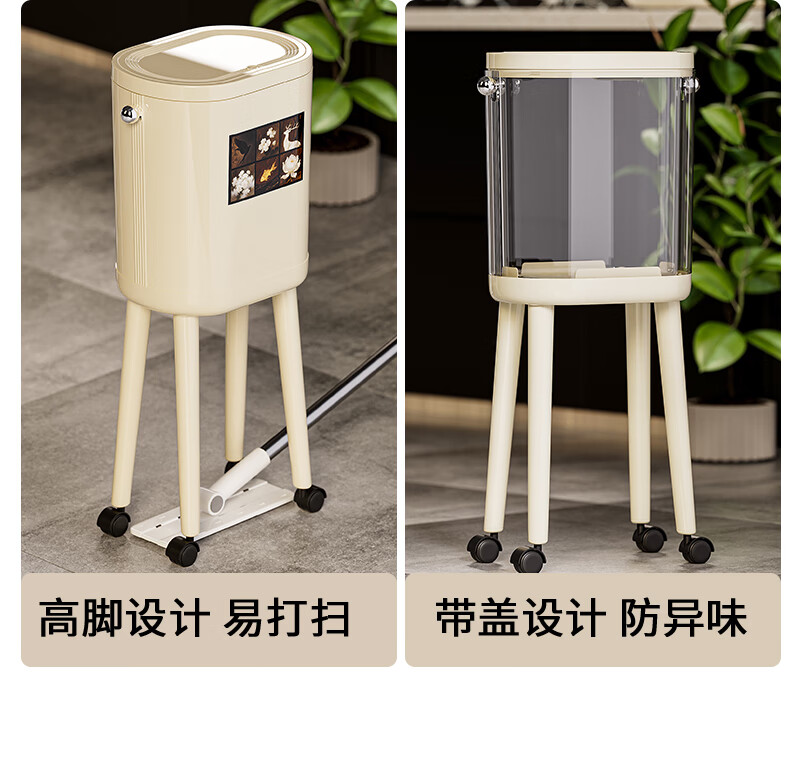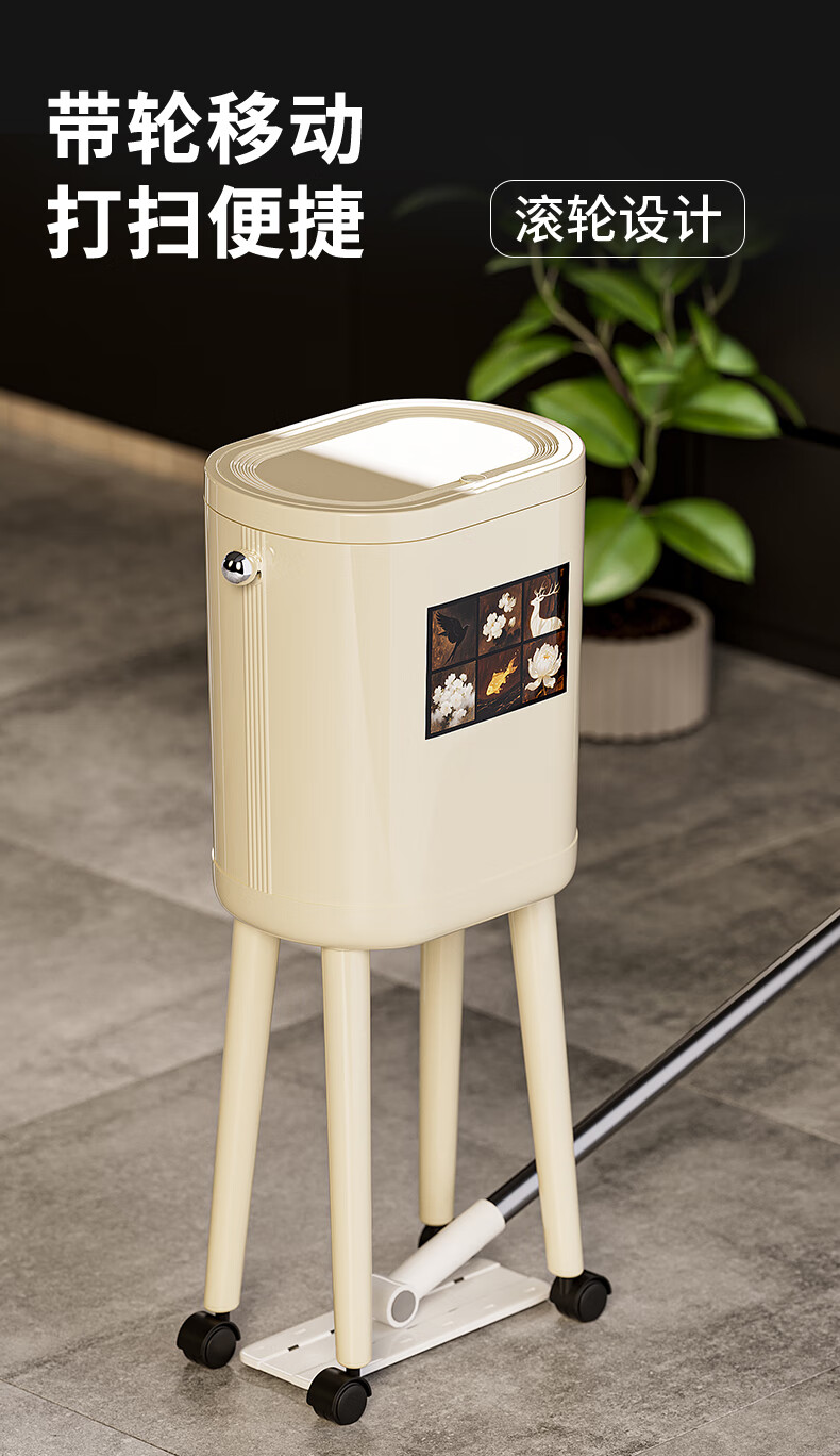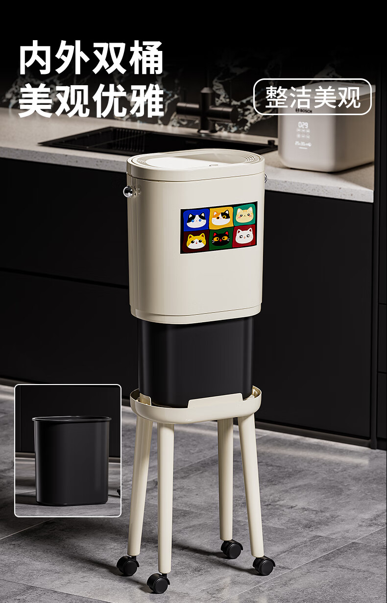 ASCOR household trash can 2025 new model without bending, high appearance, high-foot kitchen push-type large capacity with wheels, removable, cream white 16L, cat style, double buckets inside and outside | with universal wheels