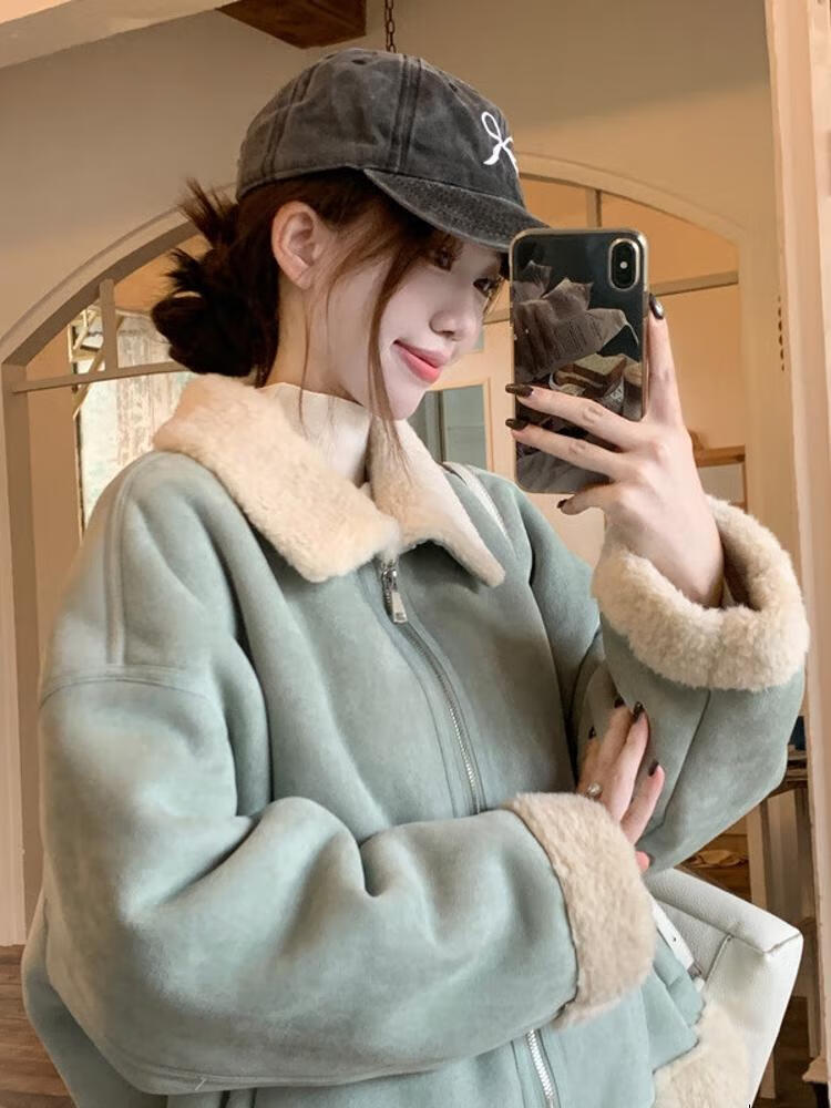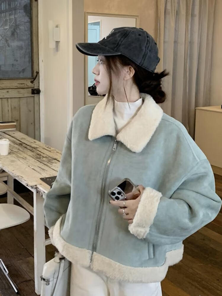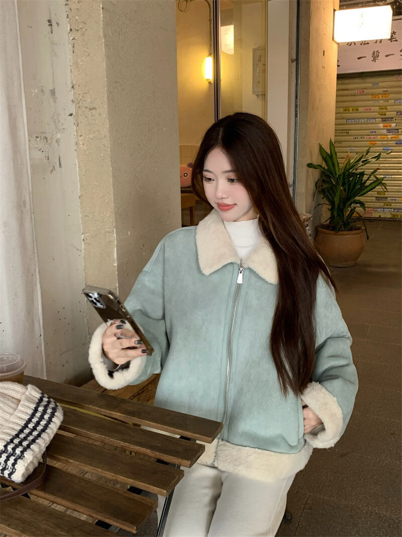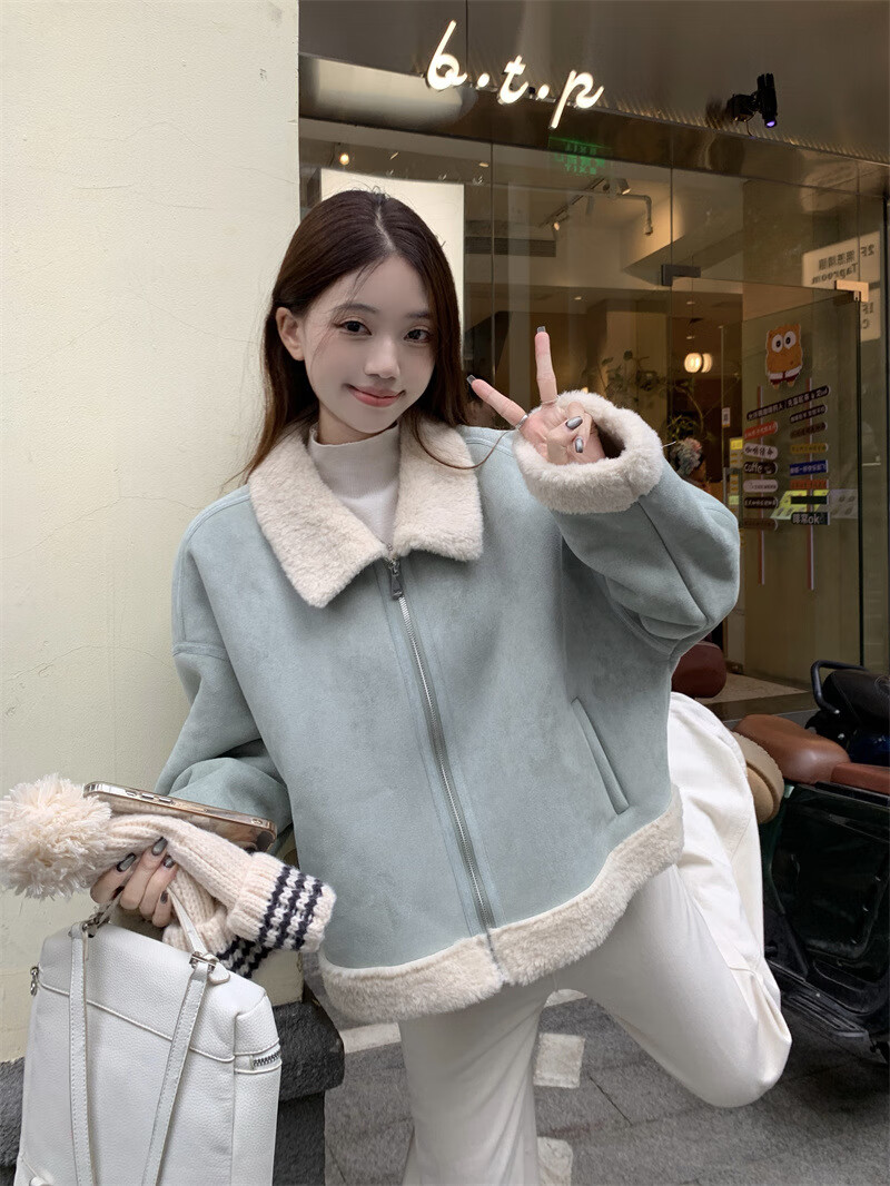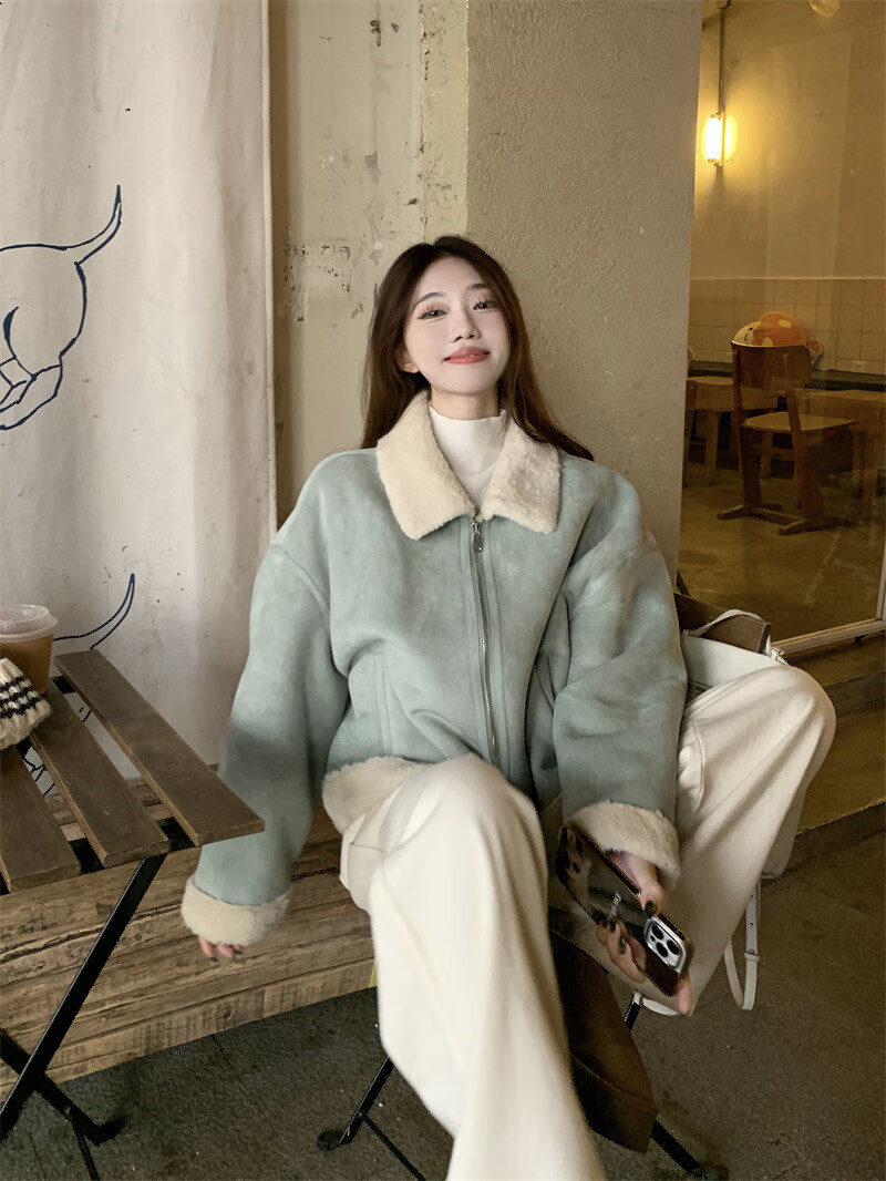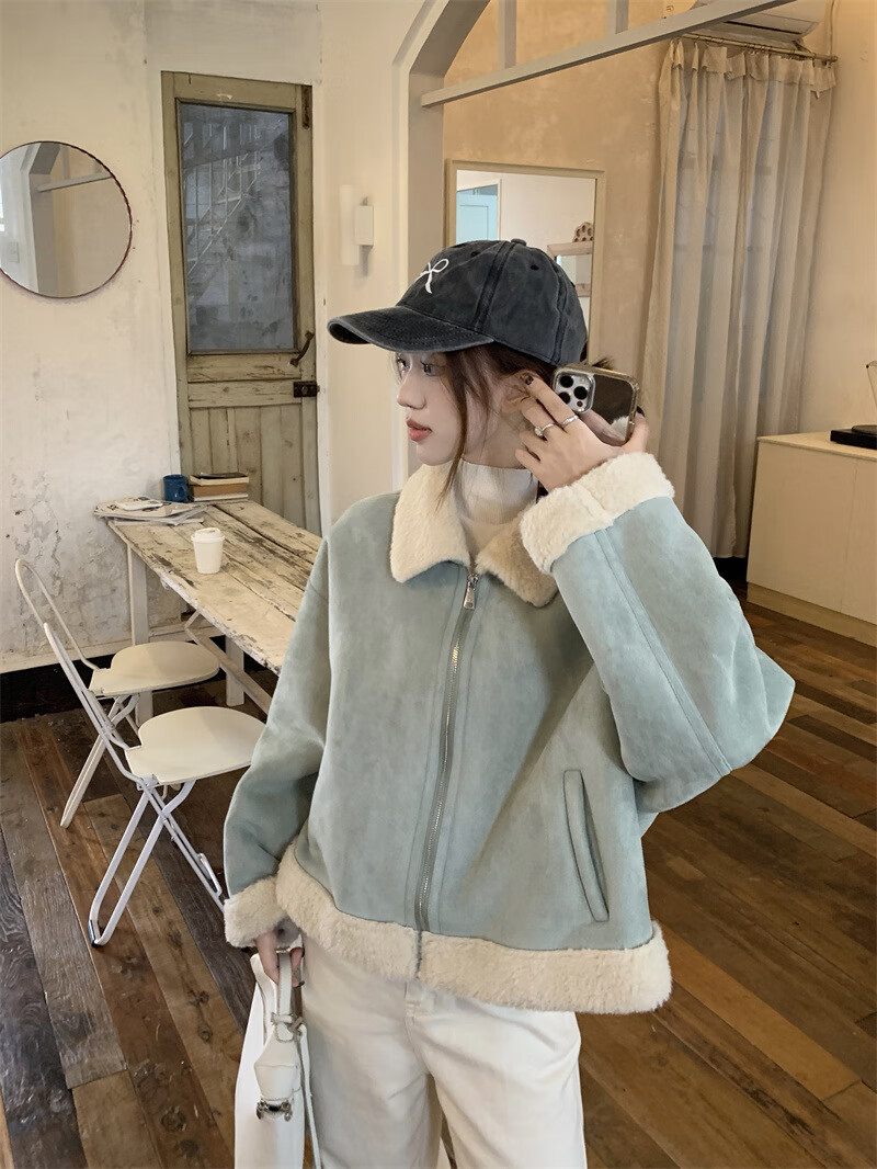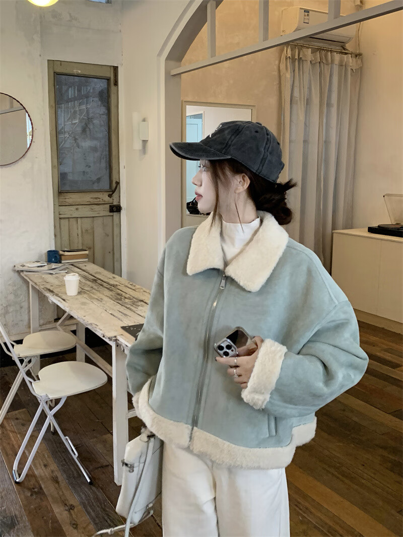 Miao Yijia imitation lamb wool coat for women autumn and winter women's small fragrant style coat top jacket plus velvet coat warm cotton coat Xiaoxiangfeng short imitation lamb wool coat light blue S (recommended 80-100 pounds)