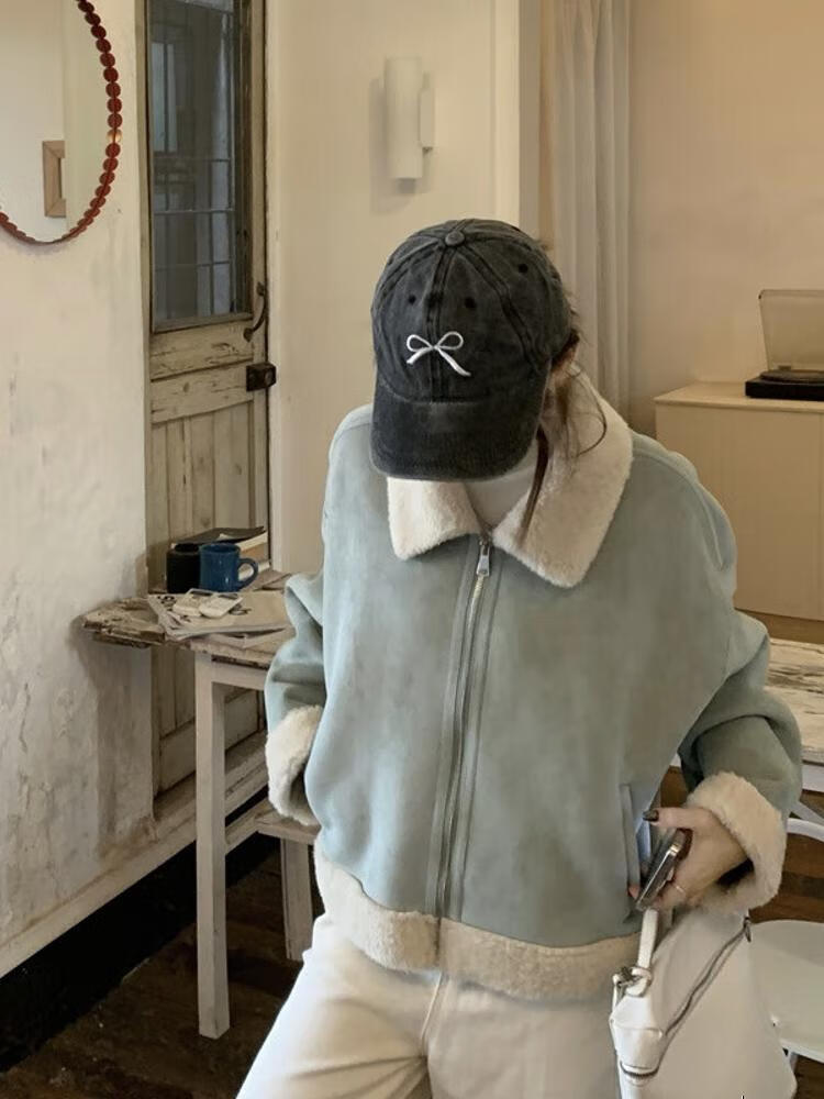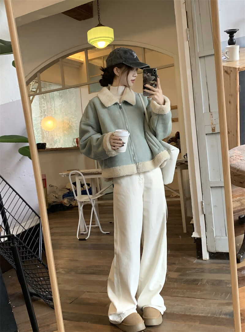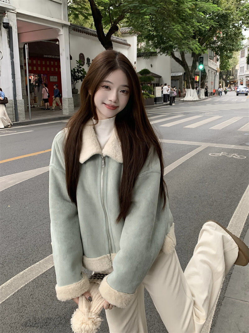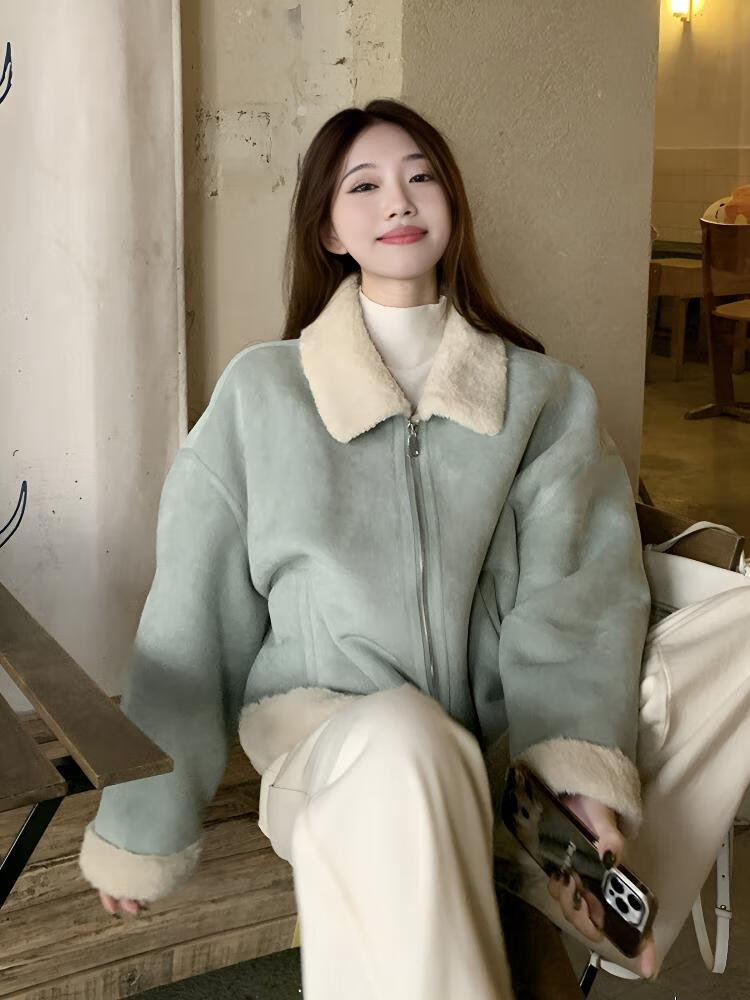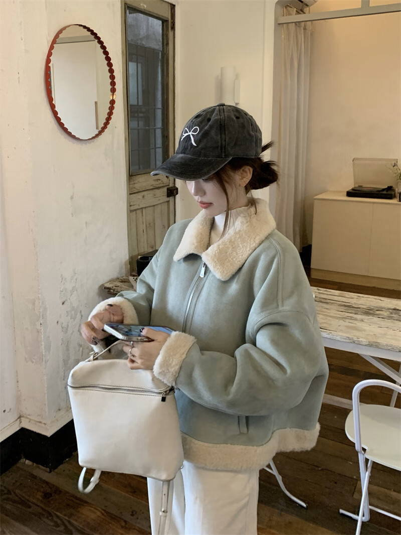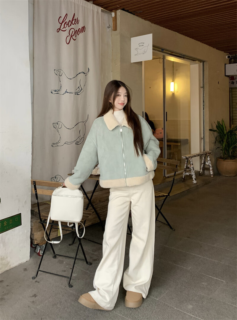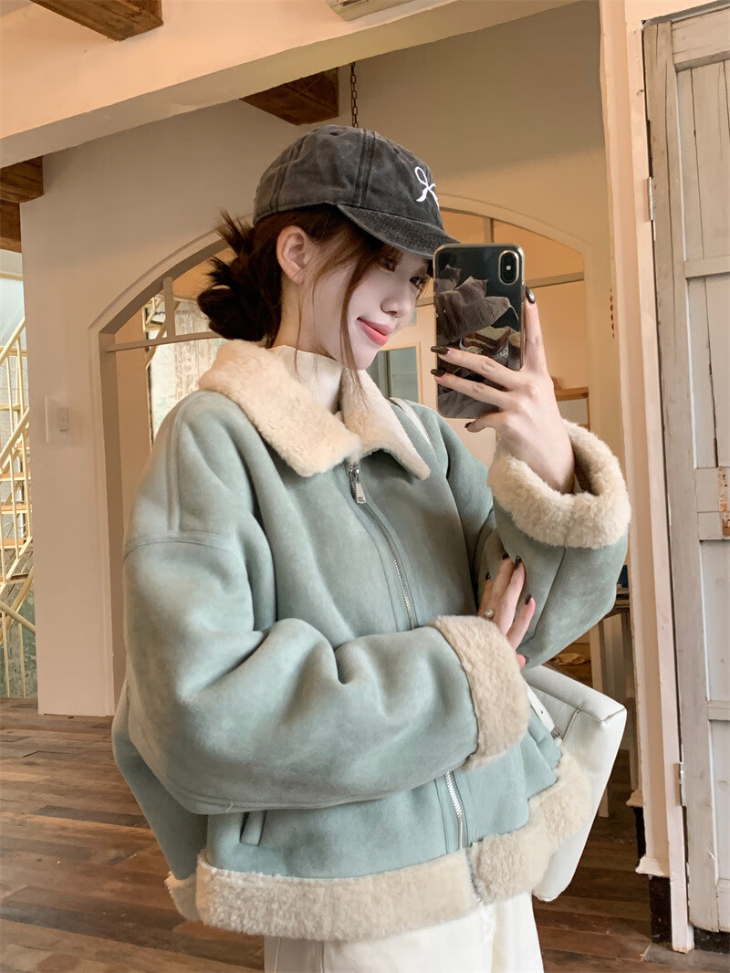 Miao Yijia imitation lamb wool coat for women autumn and winter women's small fragrant style coat top jacket plus velvet coat warm cotton coat Xiaoxiangfeng short imitation lamb wool coat light blue S (recommended 80-100 pounds)