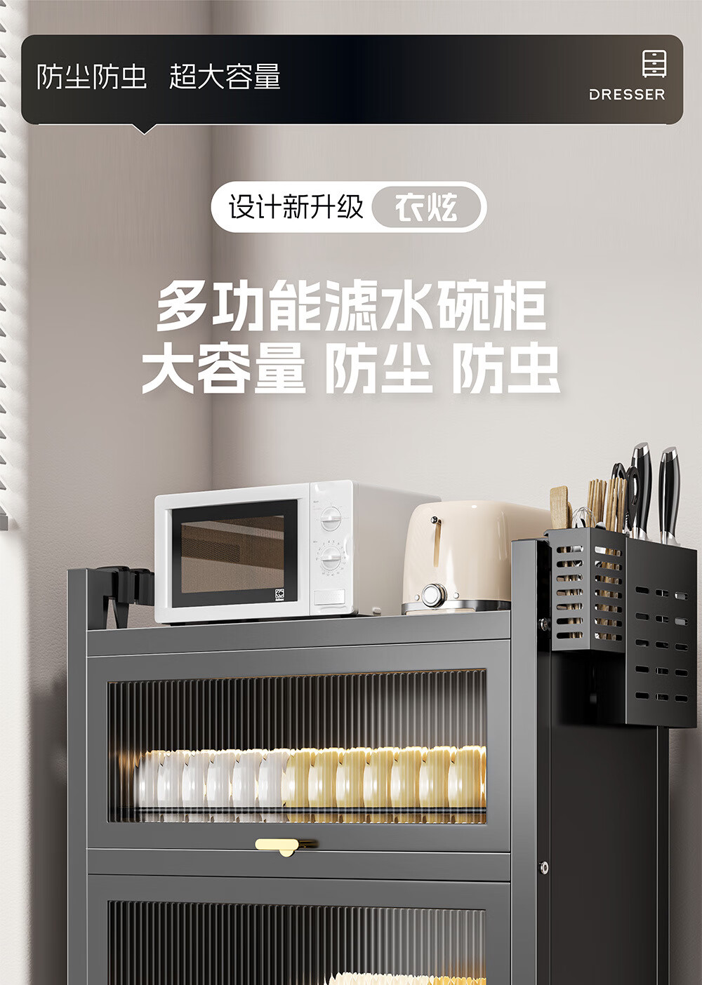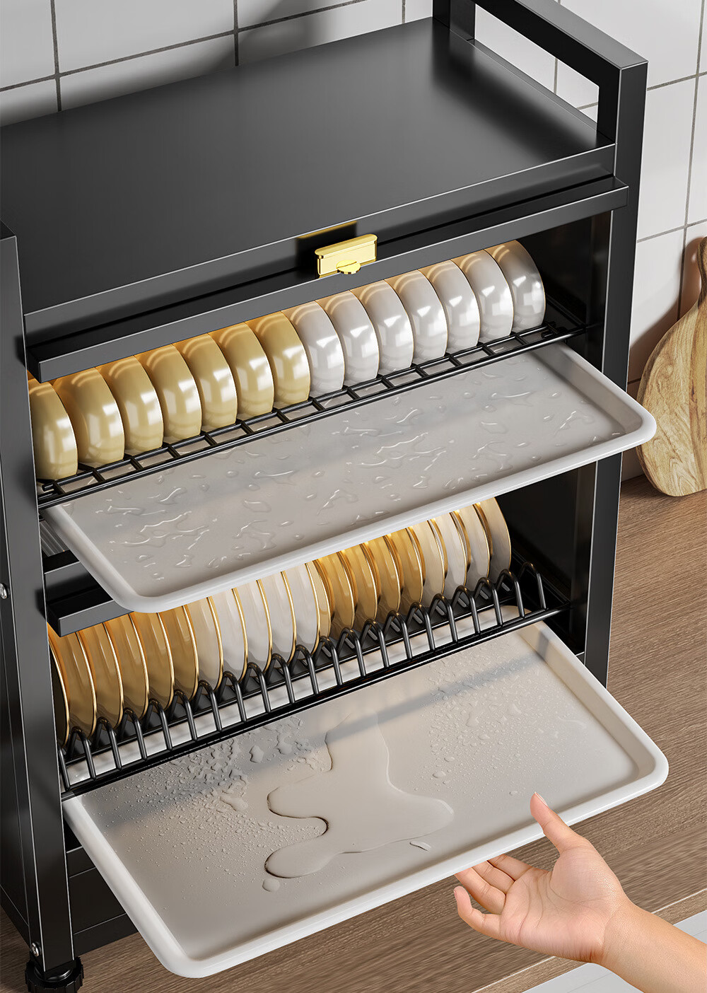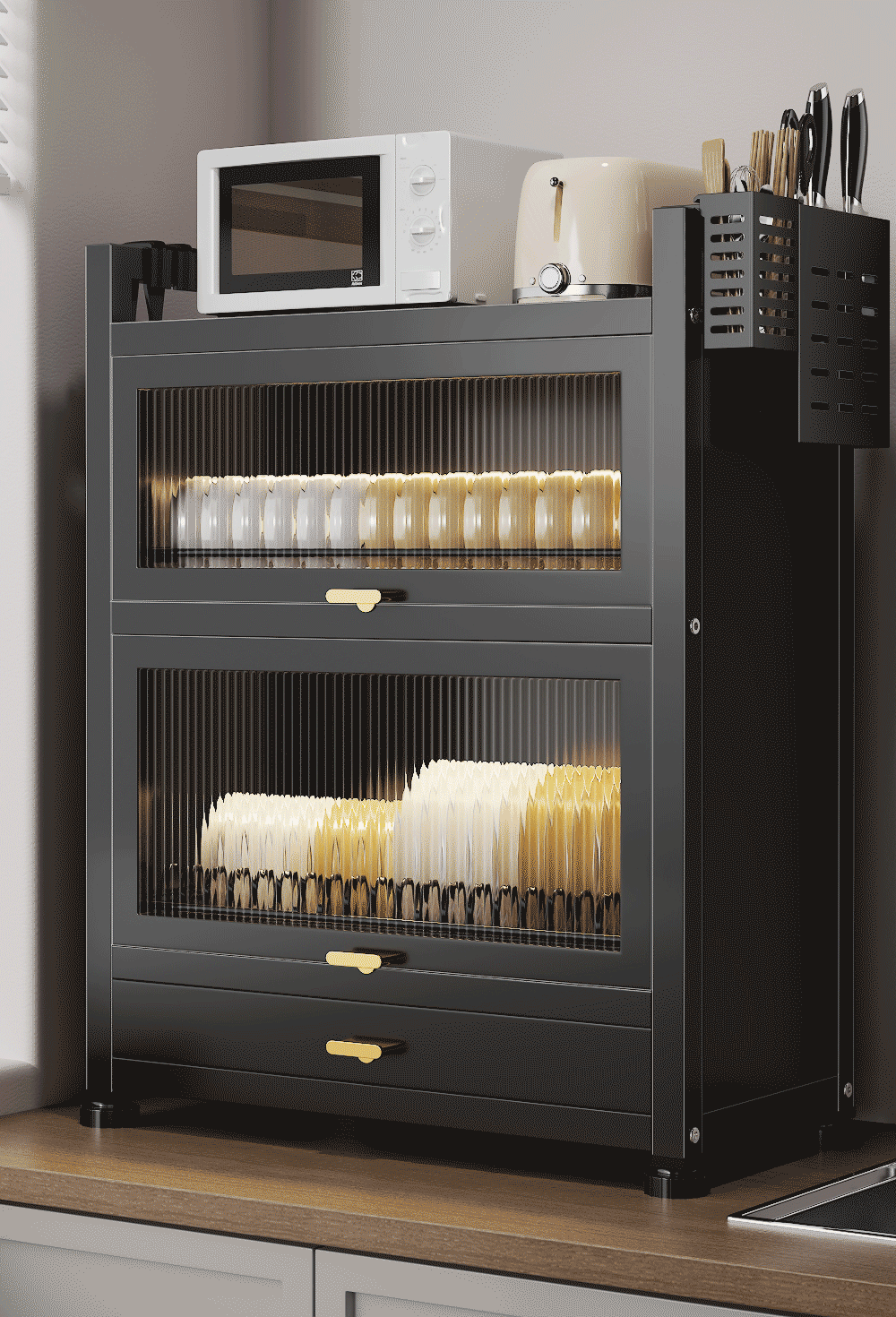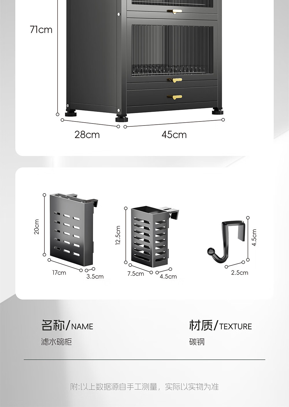 Dish drain rack cupboard household multi-functional cabinet double layer dish draining cabinet kitchen dish storage cabinet 44cm black knife holder+chopstick barrel+hook*4