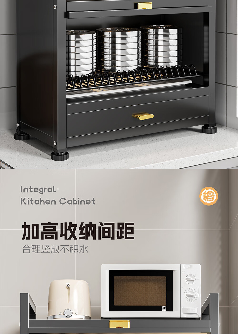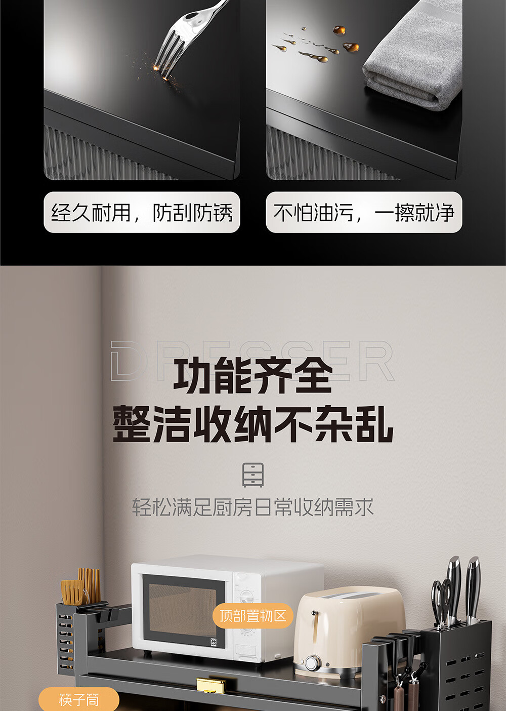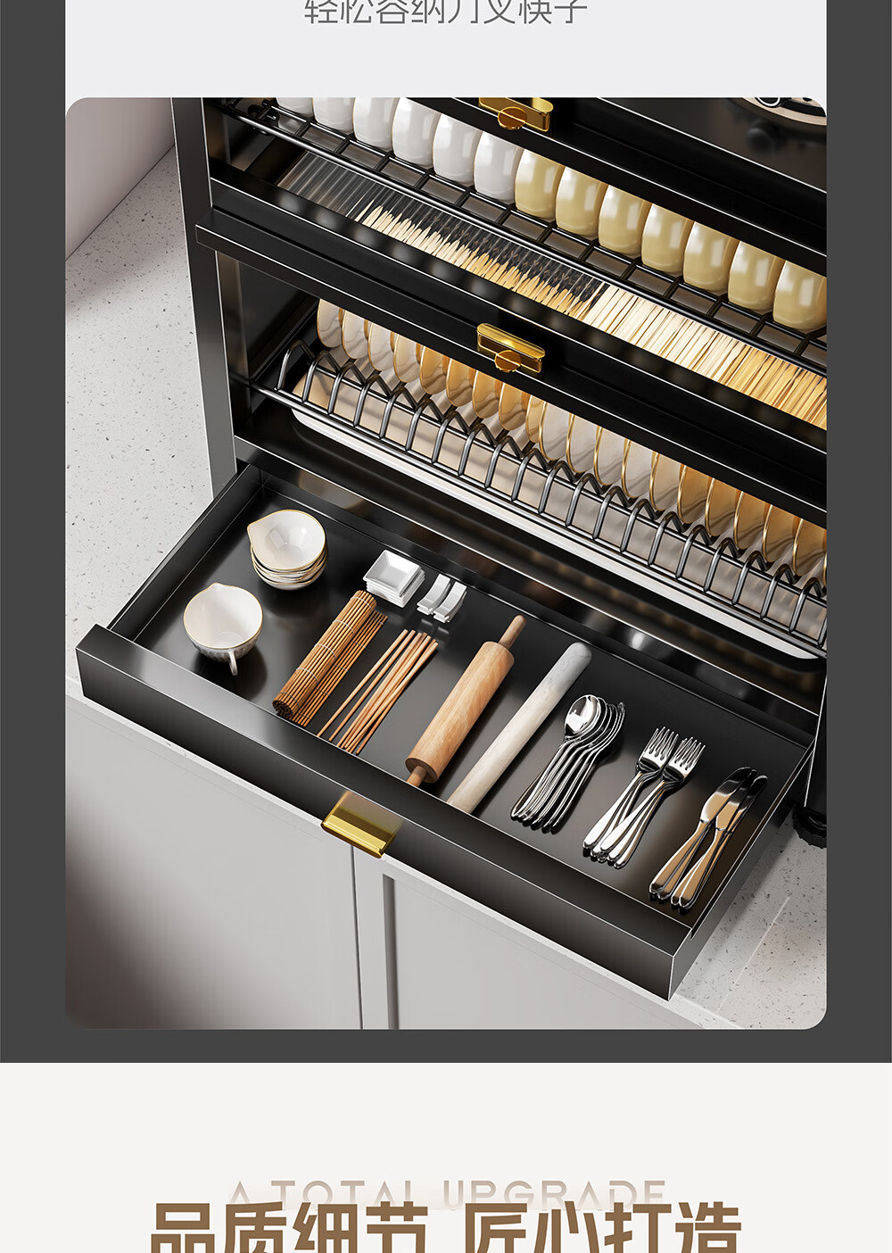 Dish drain rack cupboard household multi-functional cabinet double layer dish draining cabinet kitchen dish storage cabinet 44cm black knife holder+chopstick barrel+hook*4