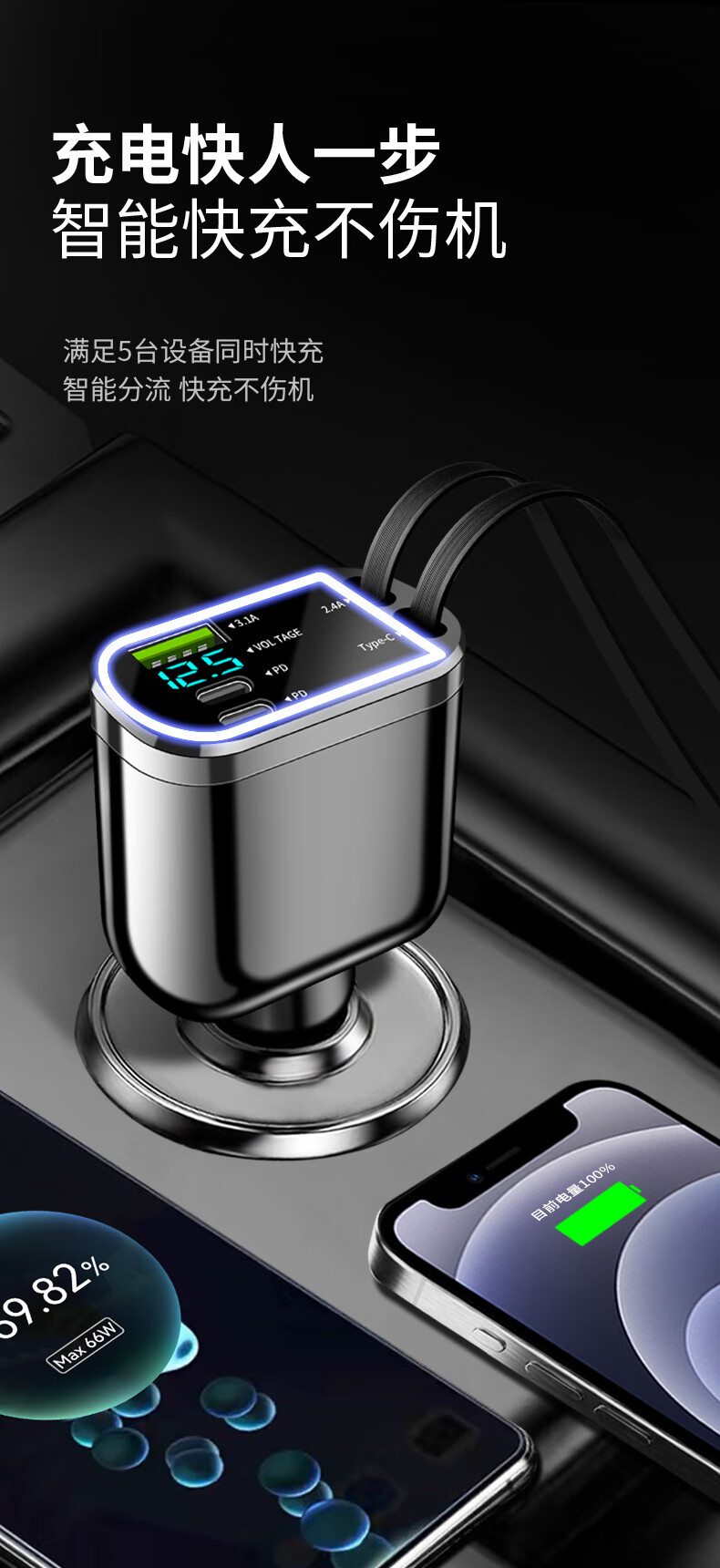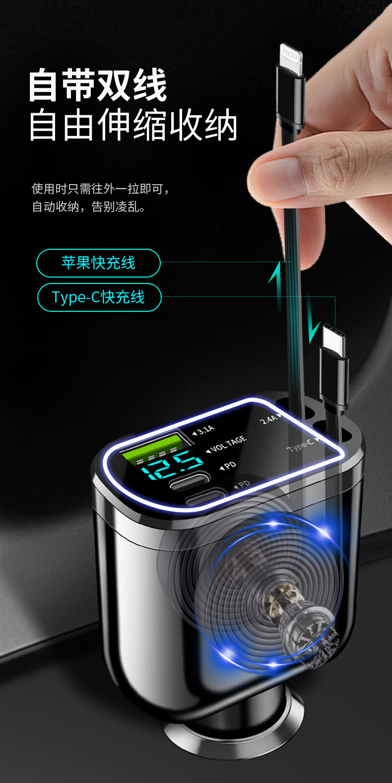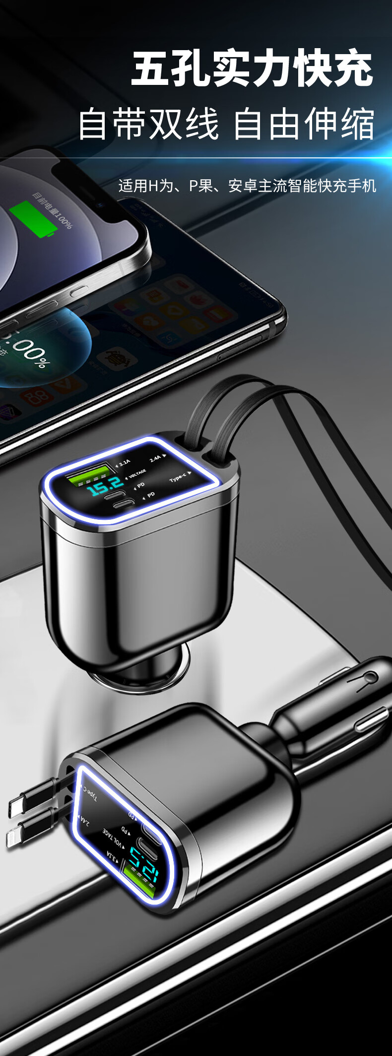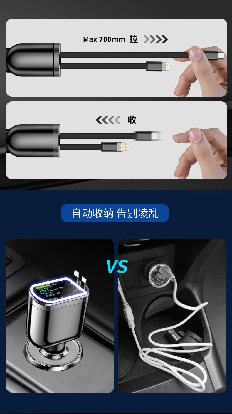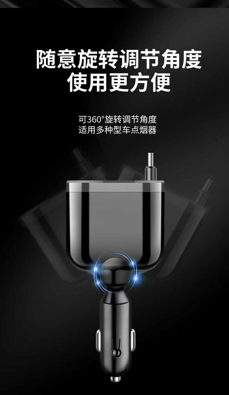 Car charger, super fast charging for mobile phones, built-in retractable wire, ambient light cigarette lighter conversion plug, universal for mobile phones, 240W, built-in retractable double wire, double flat mouth wire, ambient light
