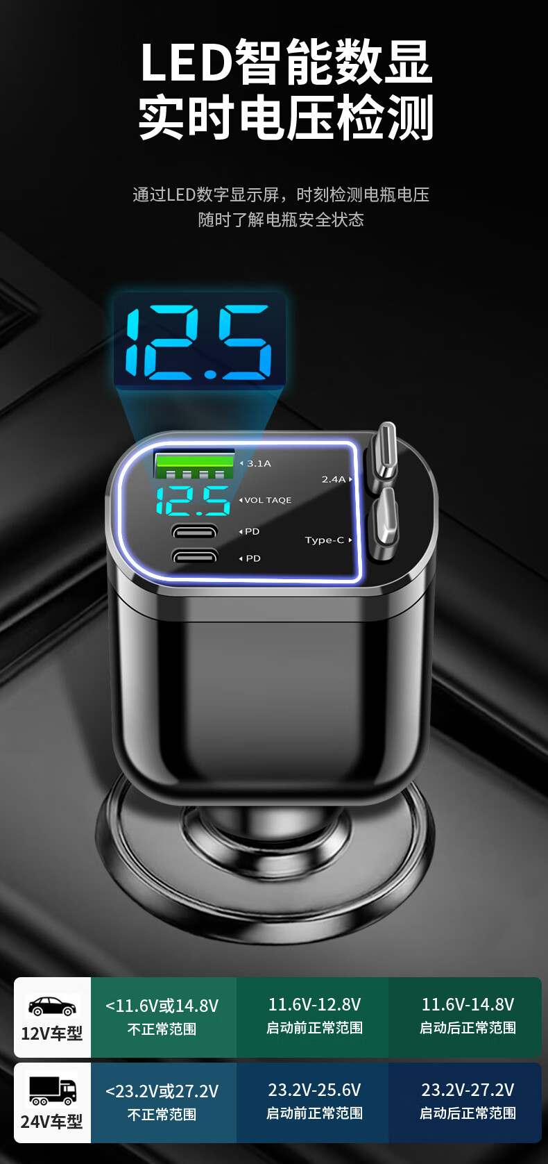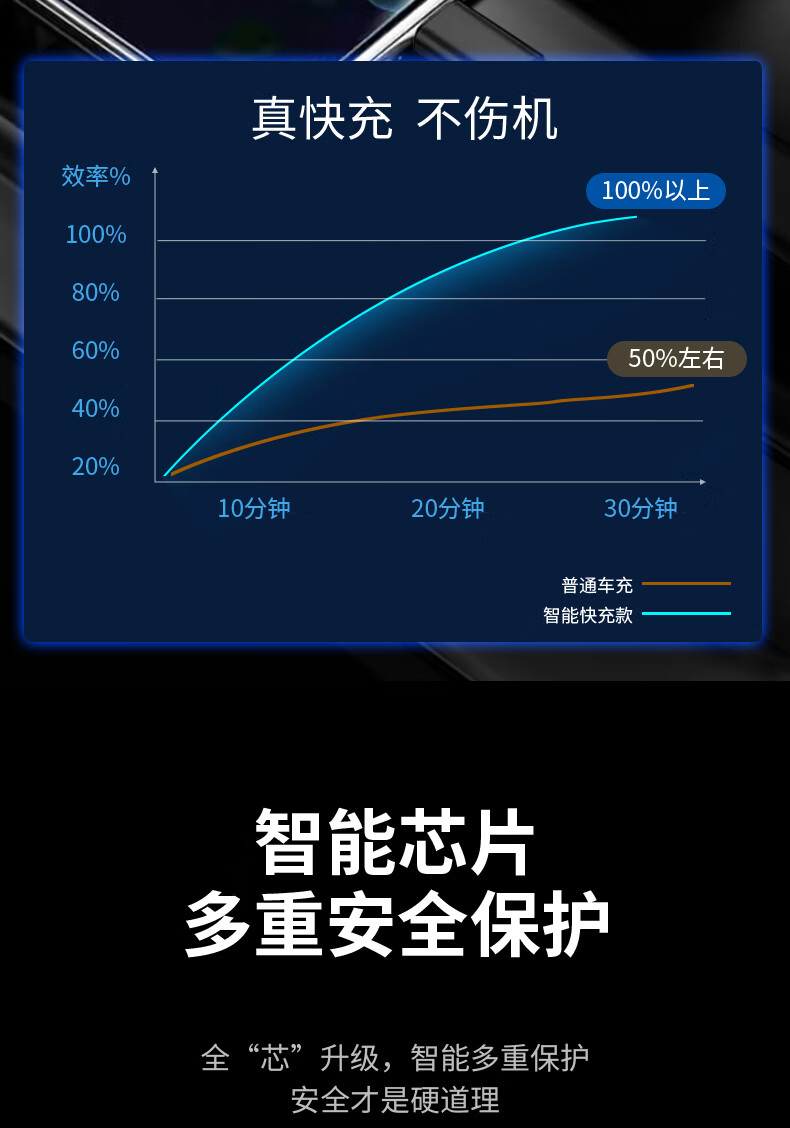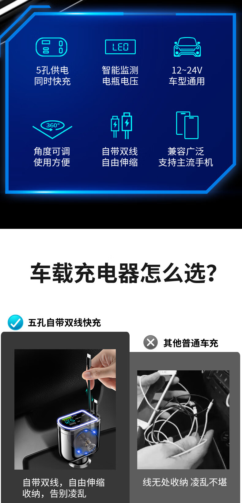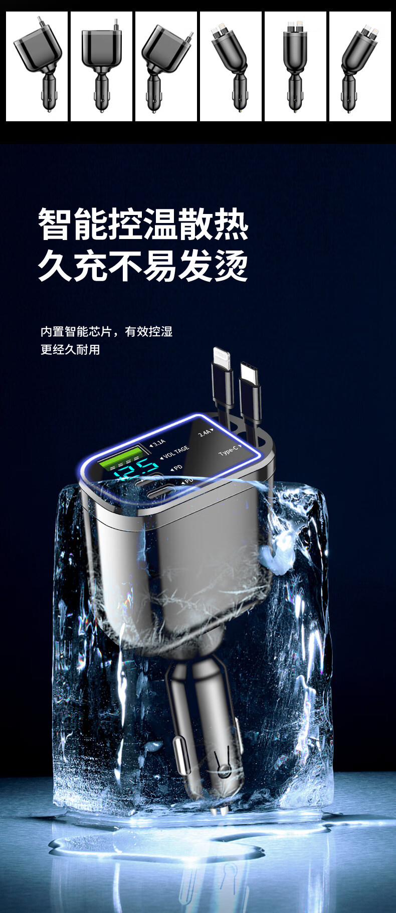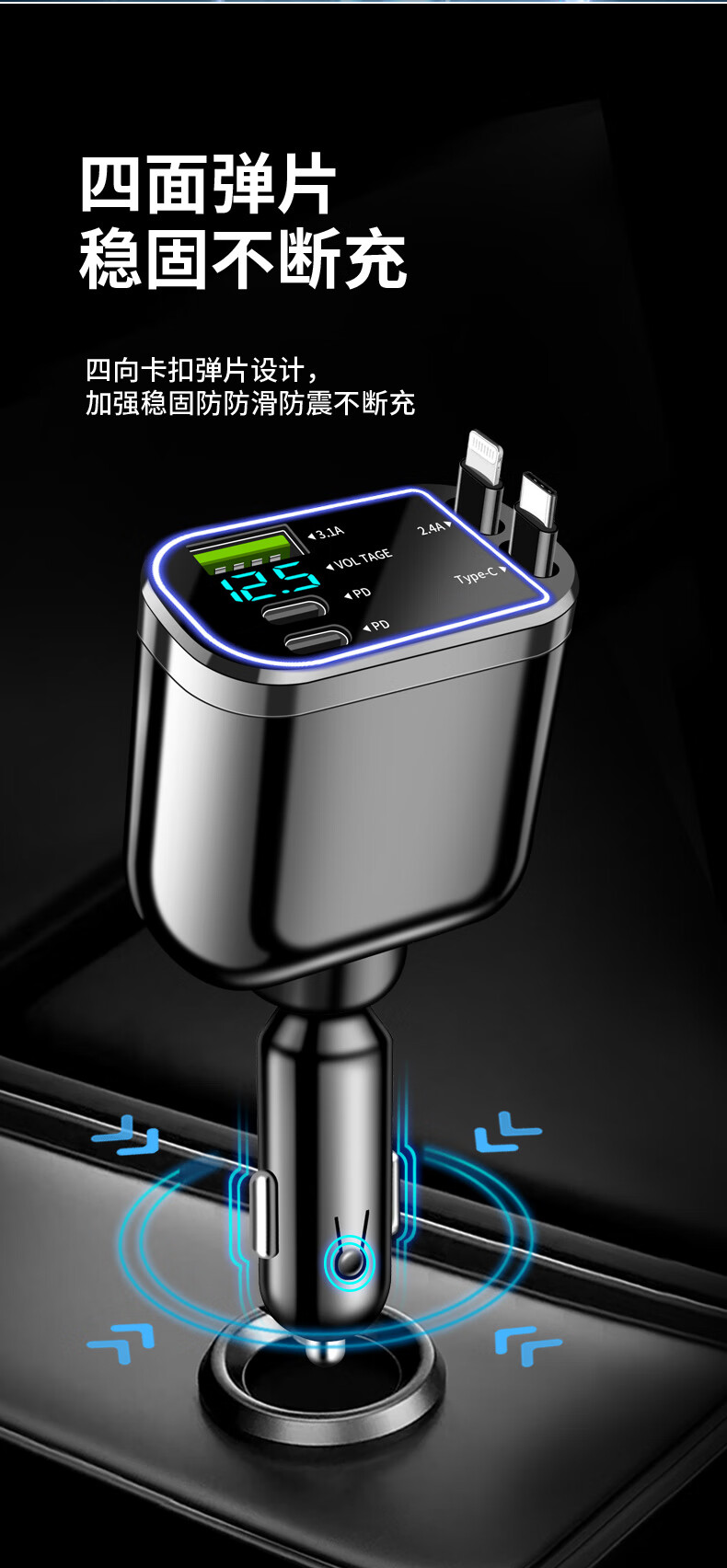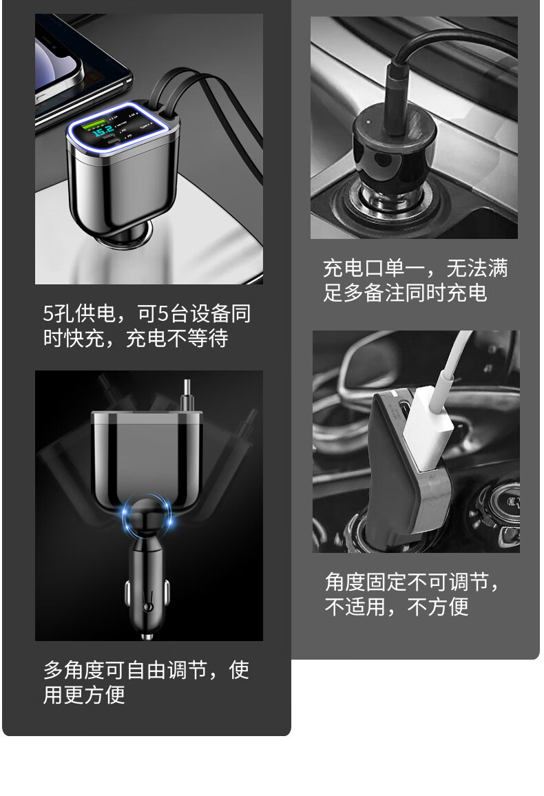 Car charger, super fast charging for mobile phones, built-in retractable wire, ambient light cigarette lighter conversion plug, universal for mobile phones, 240W, built-in retractable double wire, double flat mouth wire, ambient light