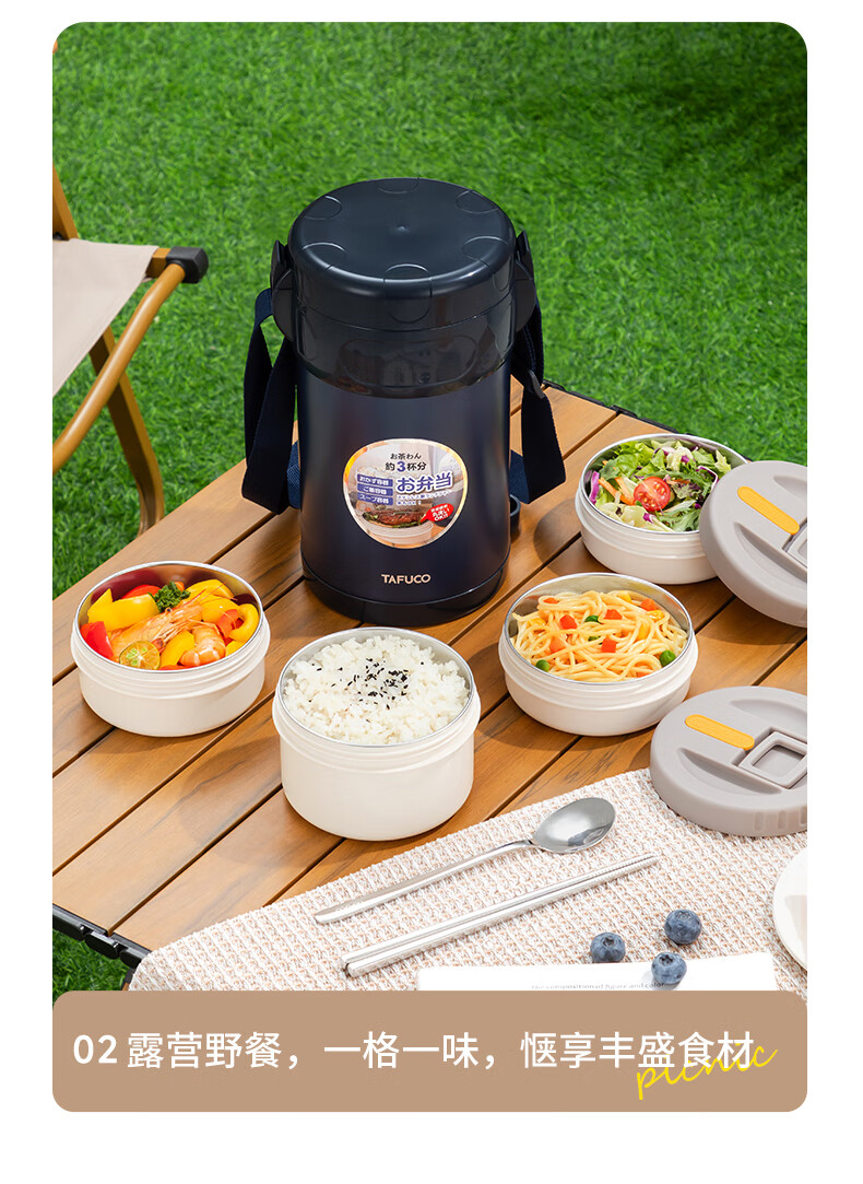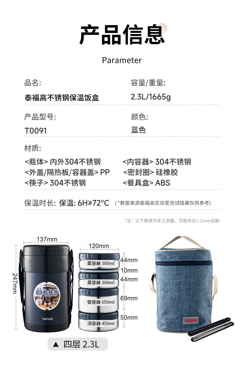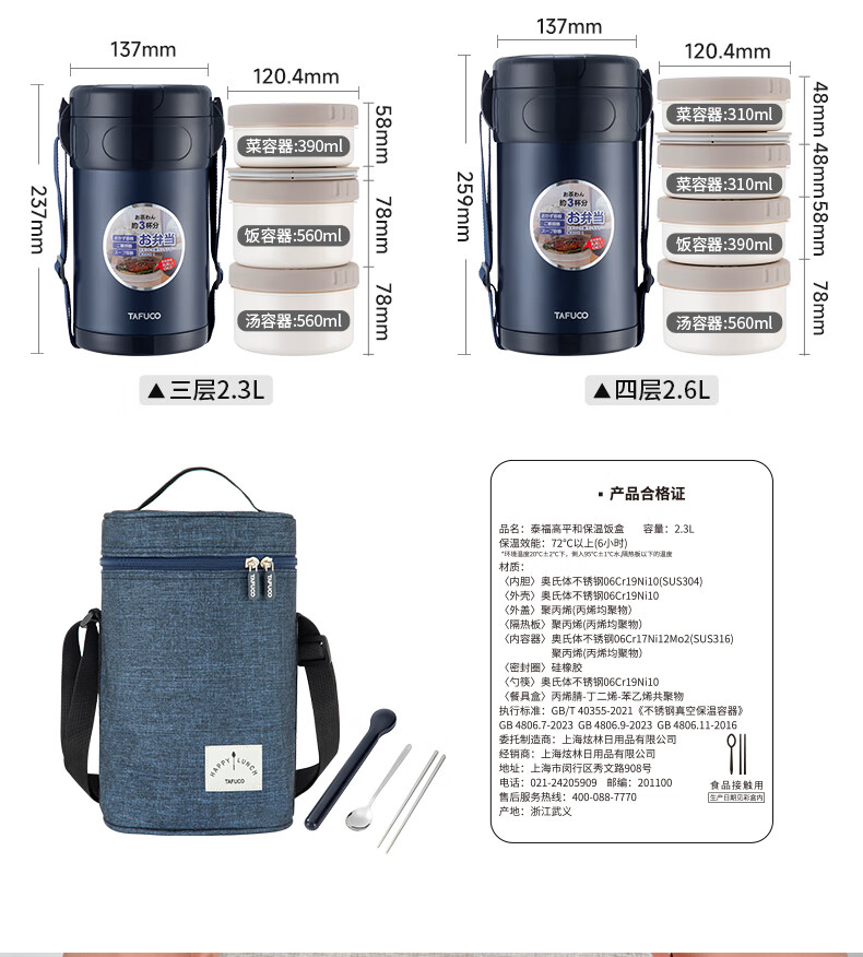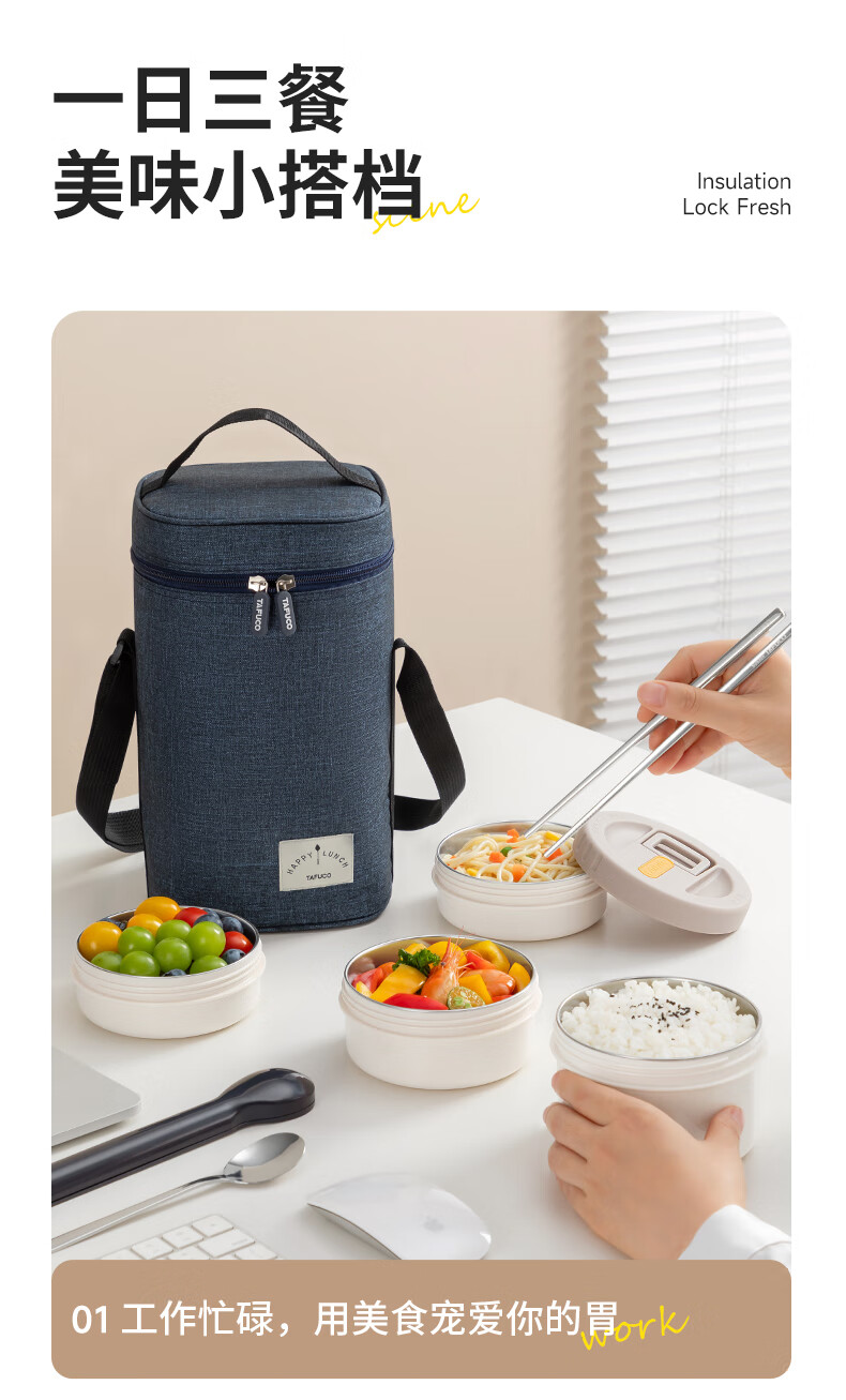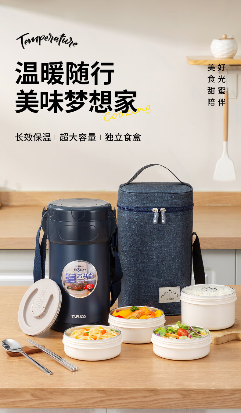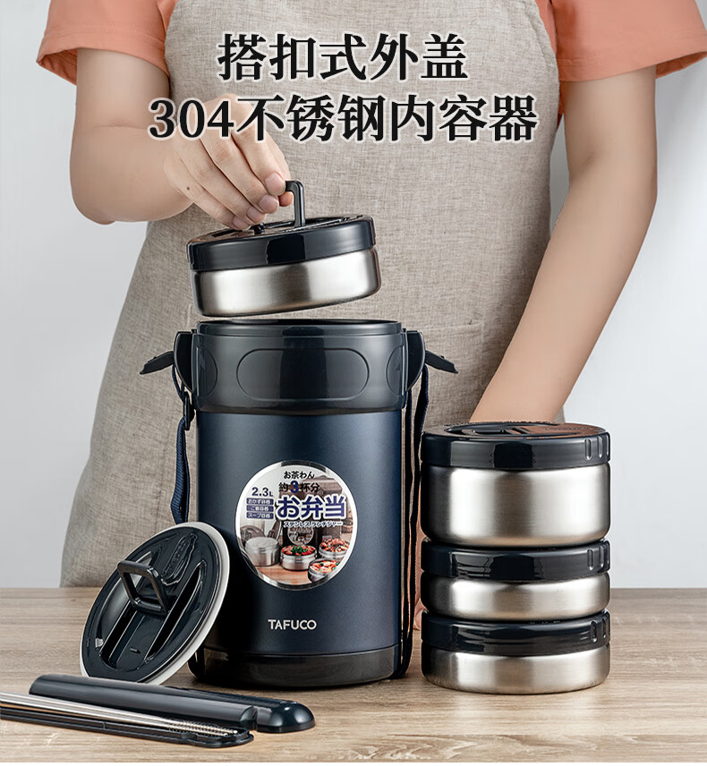 TAFUCO stainless steel insulated lunch box student work portable lunch box multi-layer lunch box winter insulated bucket T0091-dark blue 4 layers_2.3L + insulated bag tableware