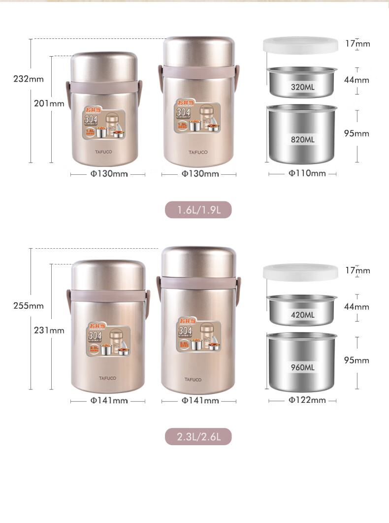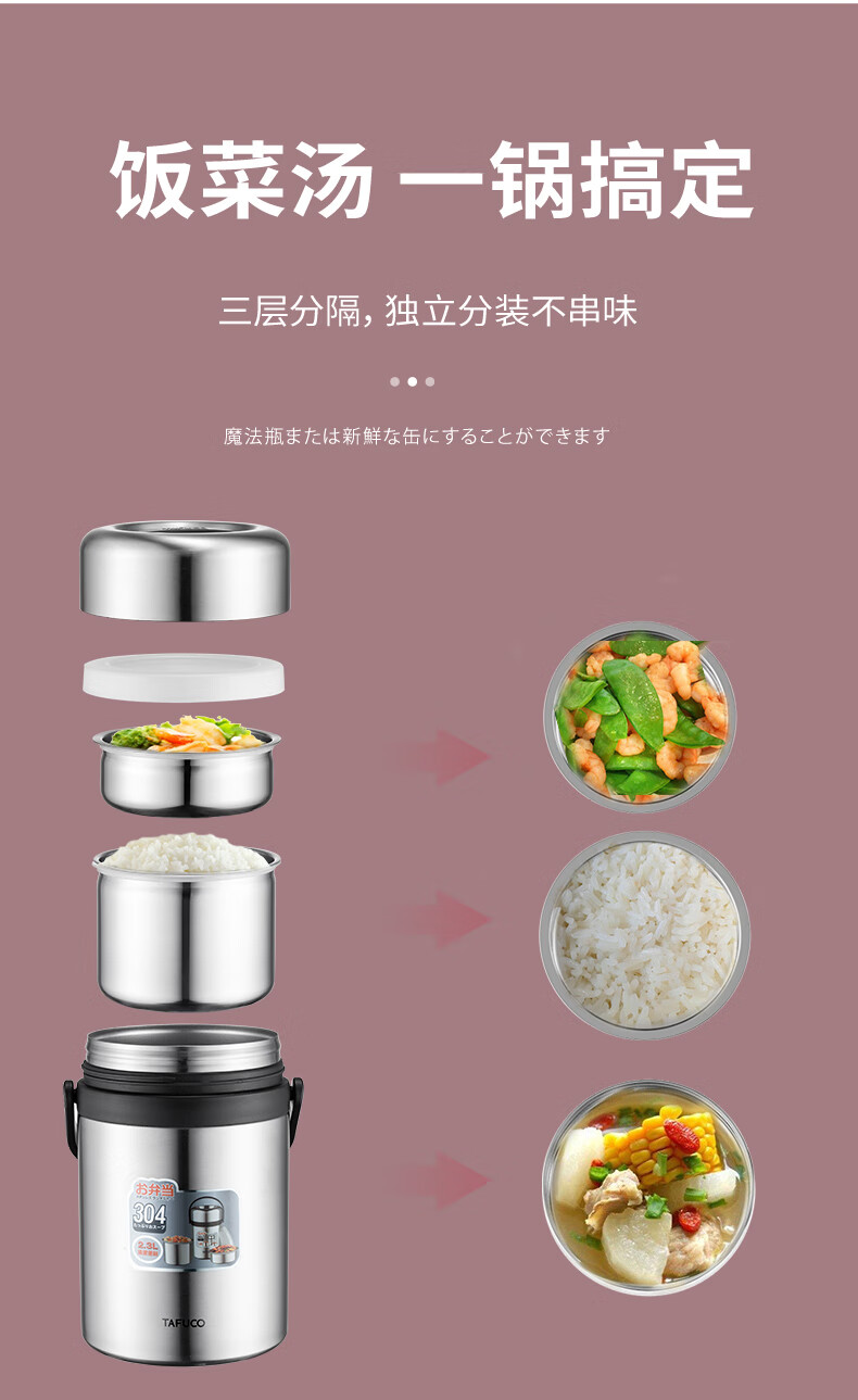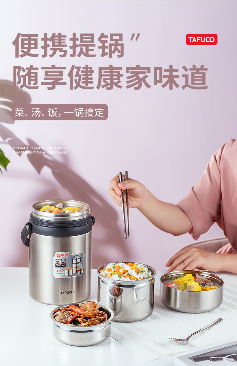 TAFUCO 304 stainless steel insulated lunch box, large-capacity work lunch box, winter day pot insulated bucket, 2.6L stainless steel color, 12 hours heat preservation + insulation bag + tableware_T03