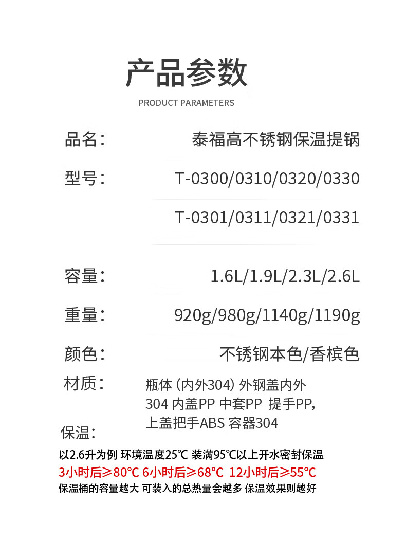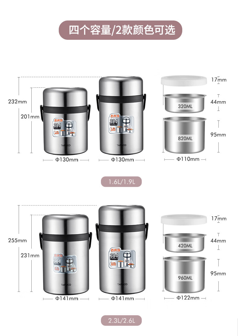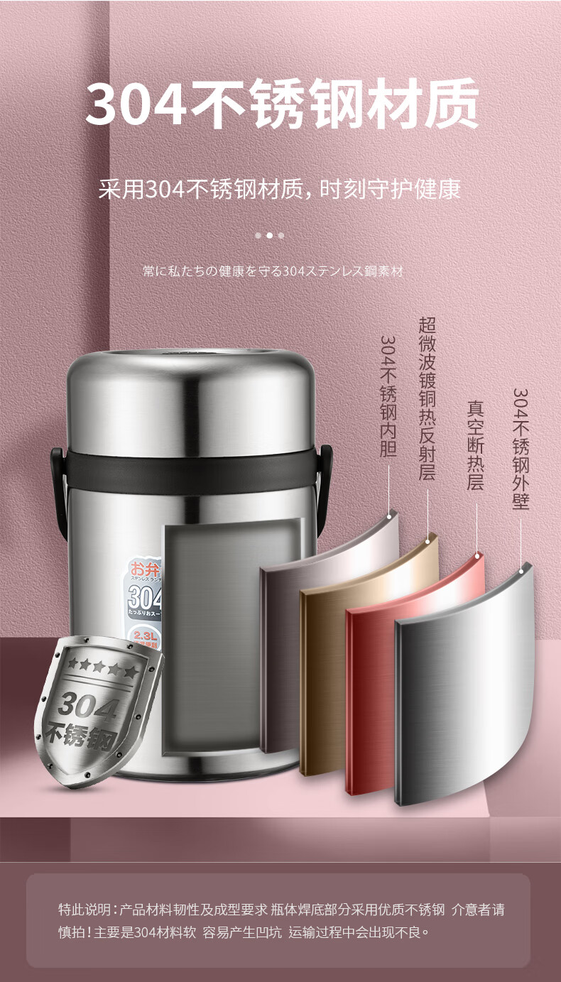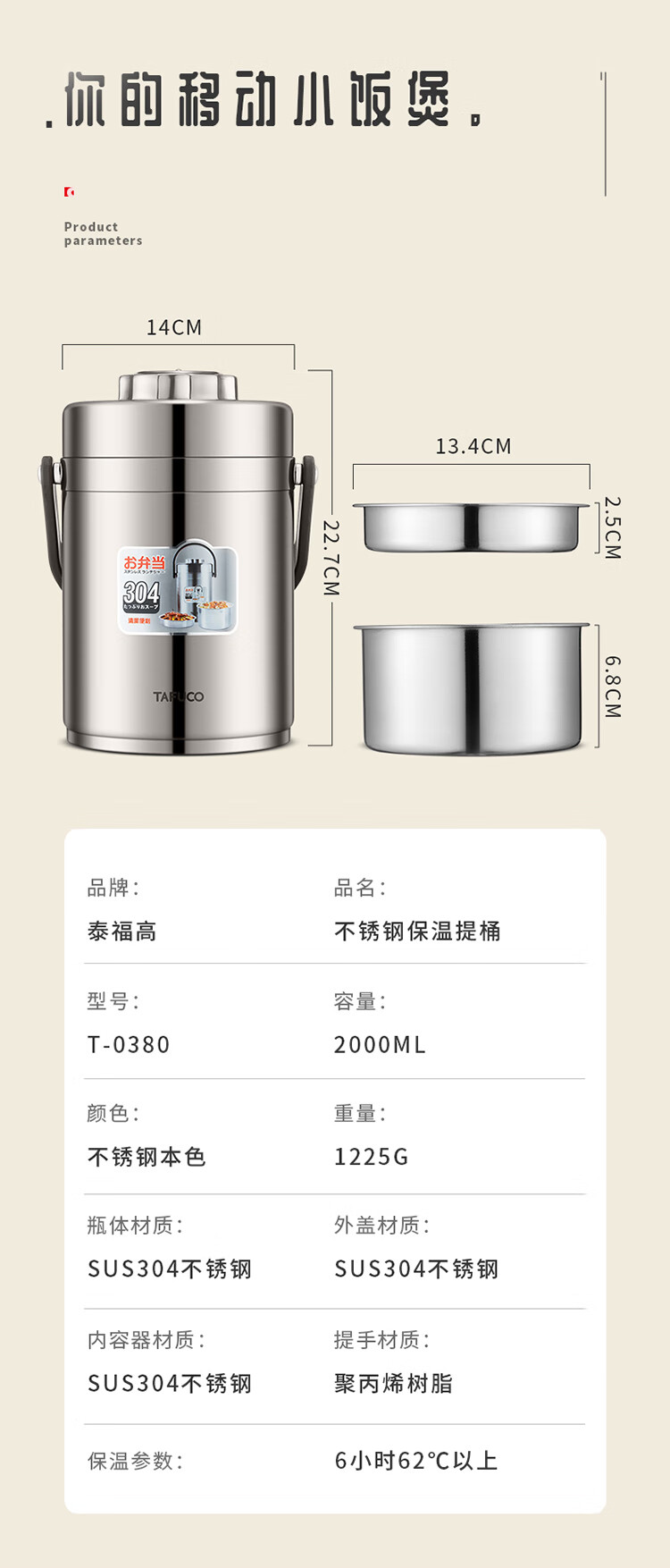 TAFUCO 304 stainless steel insulated lunch box, large-capacity work lunch box, winter day pot insulated bucket, 2.6L stainless steel color, 12 hours heat preservation + insulation bag + tableware_T03