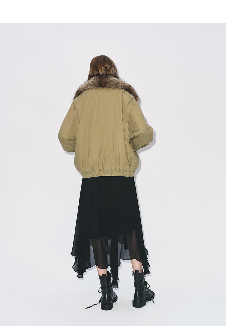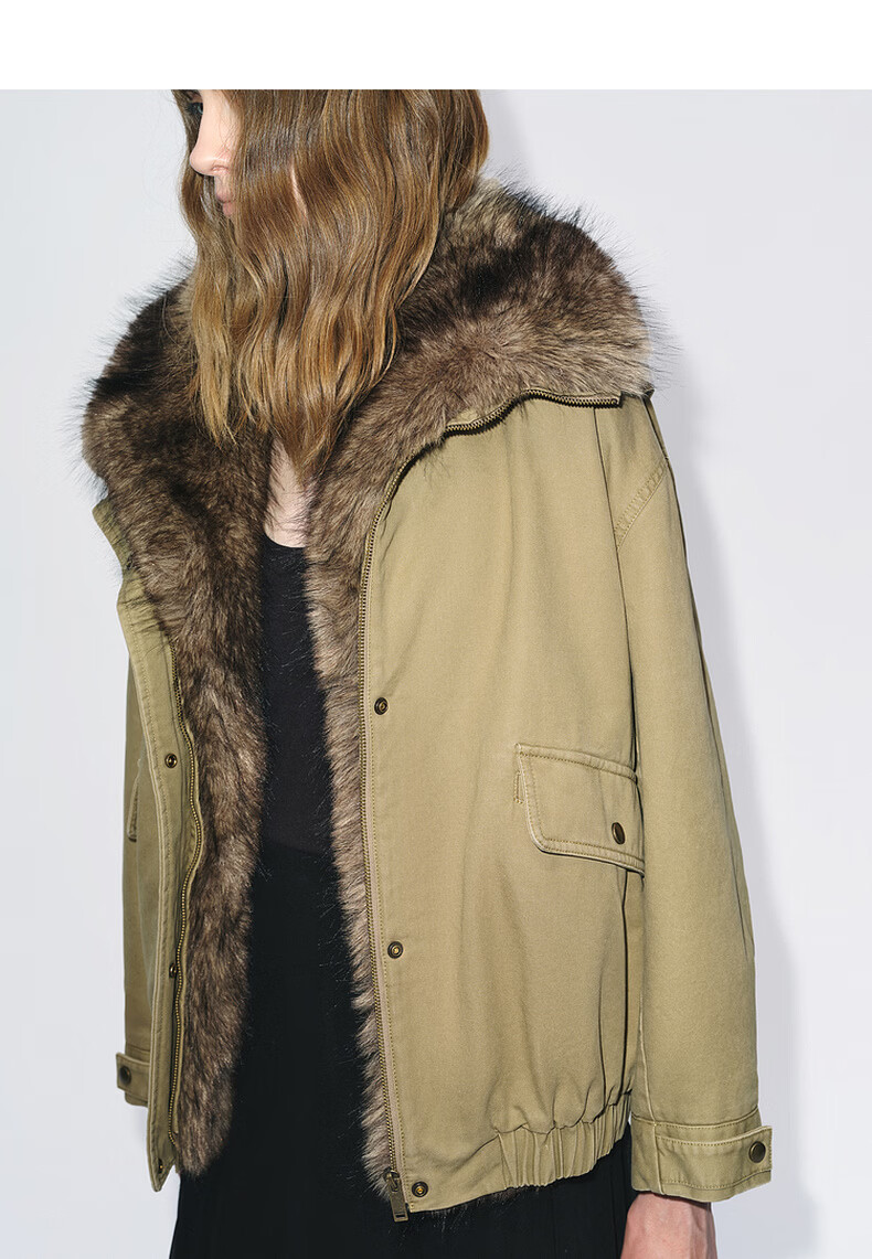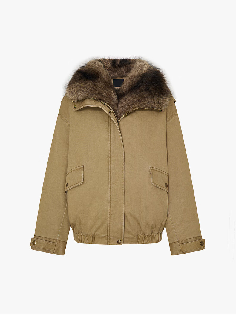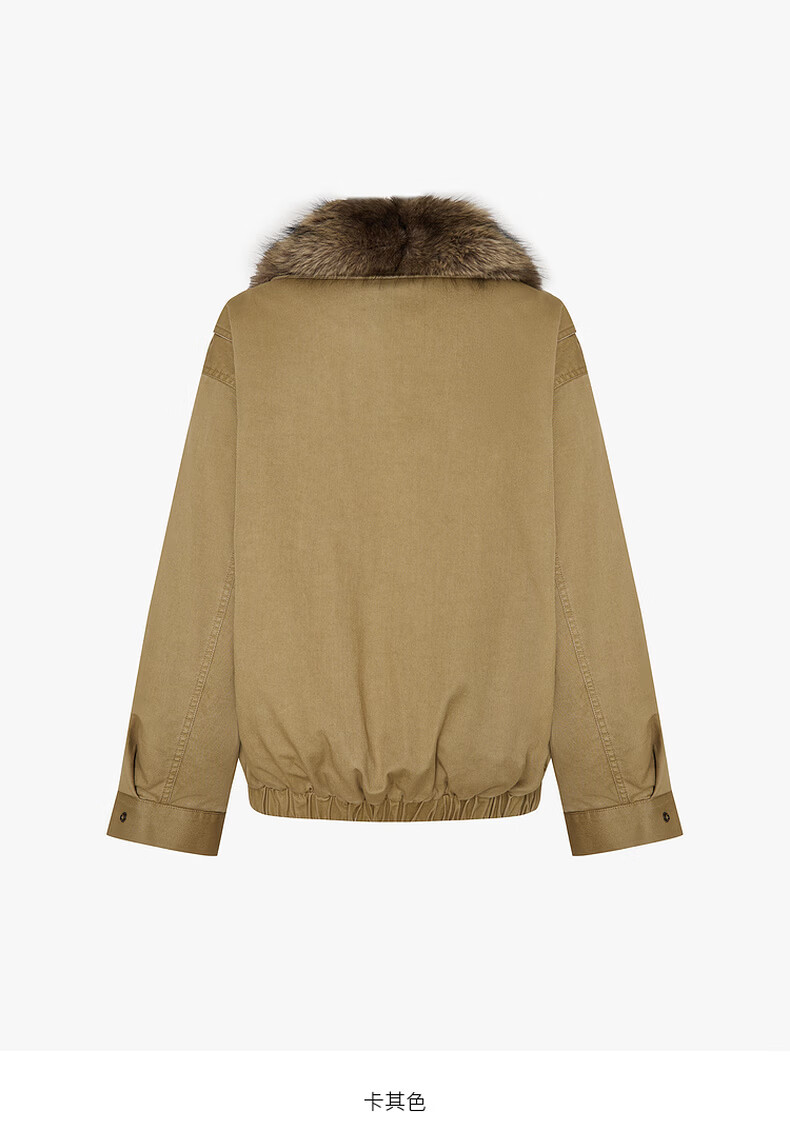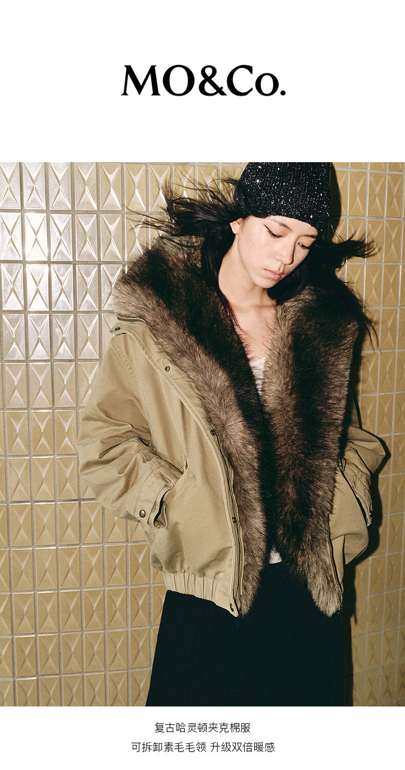 MO&Co. Jacket Filled 2025 Winter New Product Detachable Fur Collar Assute Dyed Khaki Harrington Jacket MBE4COT020 Khaki S /160