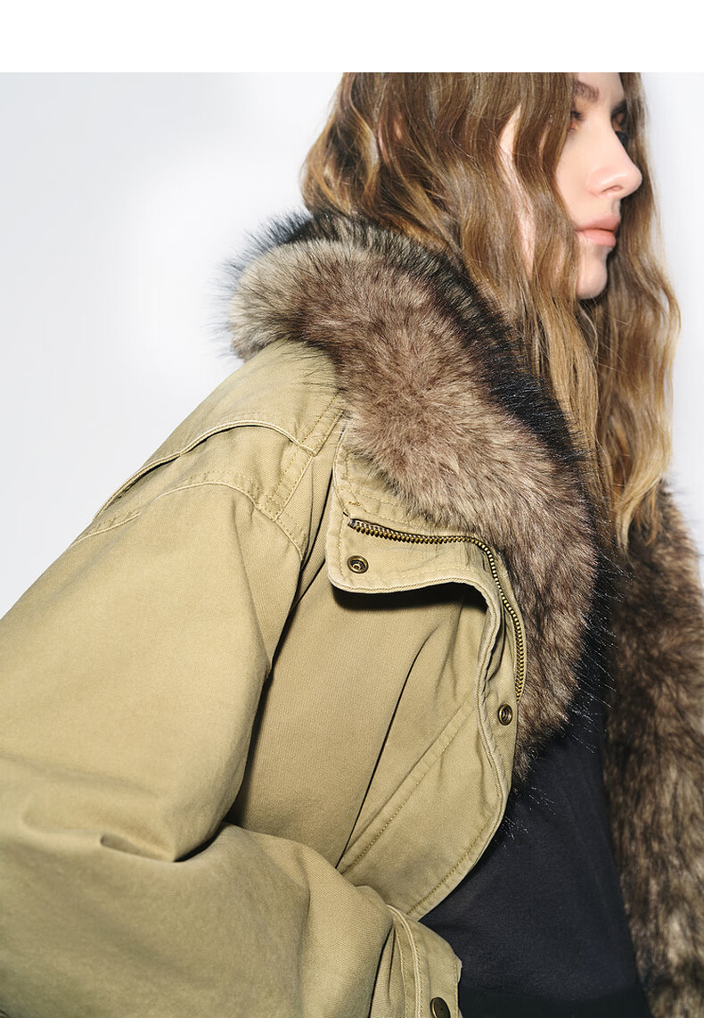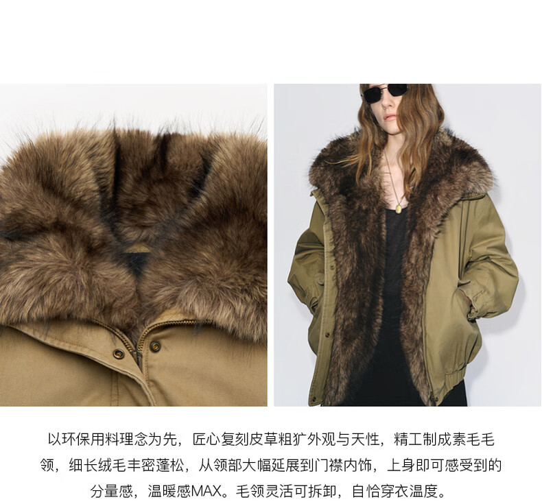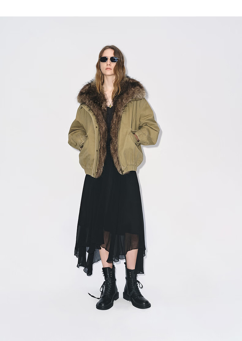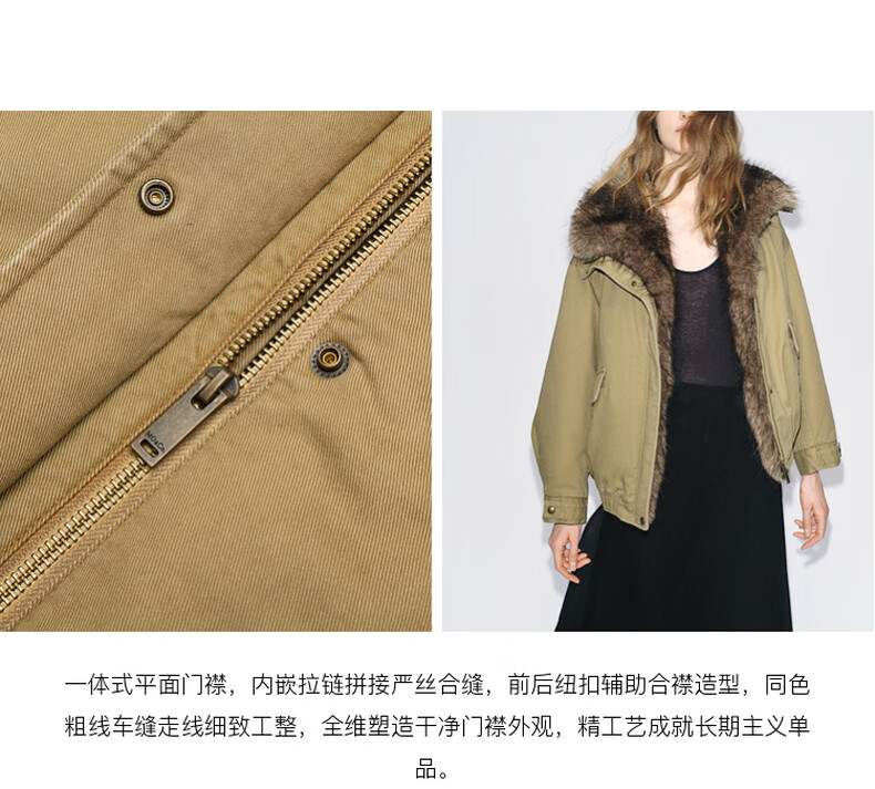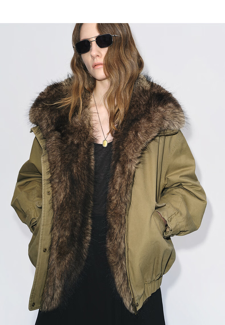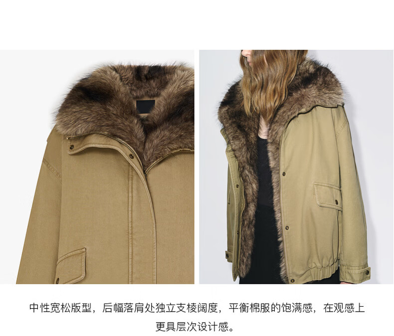 MO&Co. Jacket Filled 2025 Winter New Product Detachable Fur Collar Assute Dyed Khaki Harrington Jacket MBE4COT020 Khaki S /160