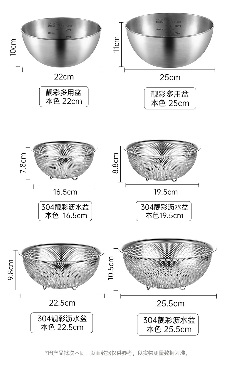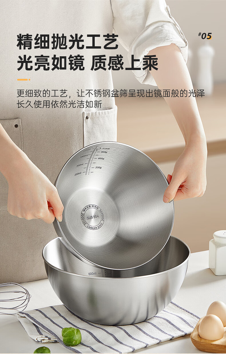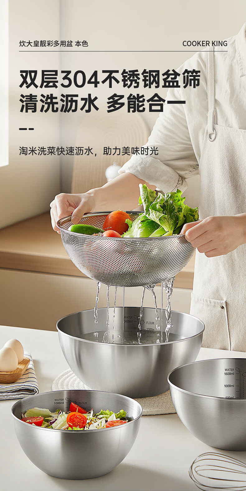 COOKER KING 304 stainless steel basin, vegetable basin, drain basket, egg beater and basin, new rice filter for home kitchen, 304 stainless steel mixed color medium size 4-piece set, basin + drain basket