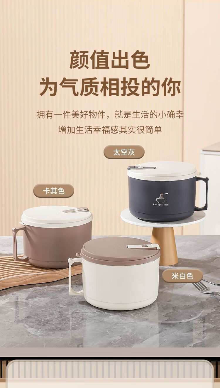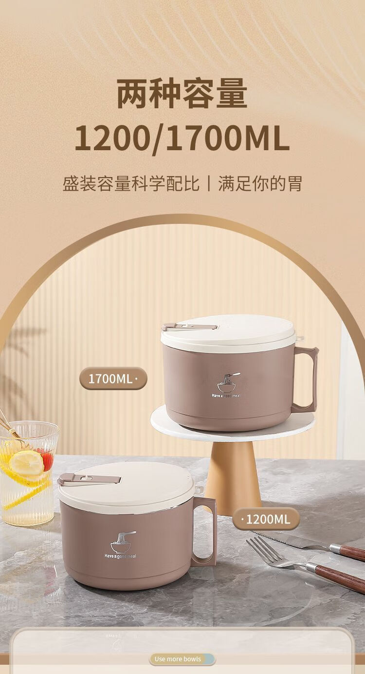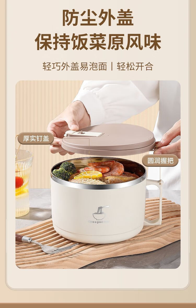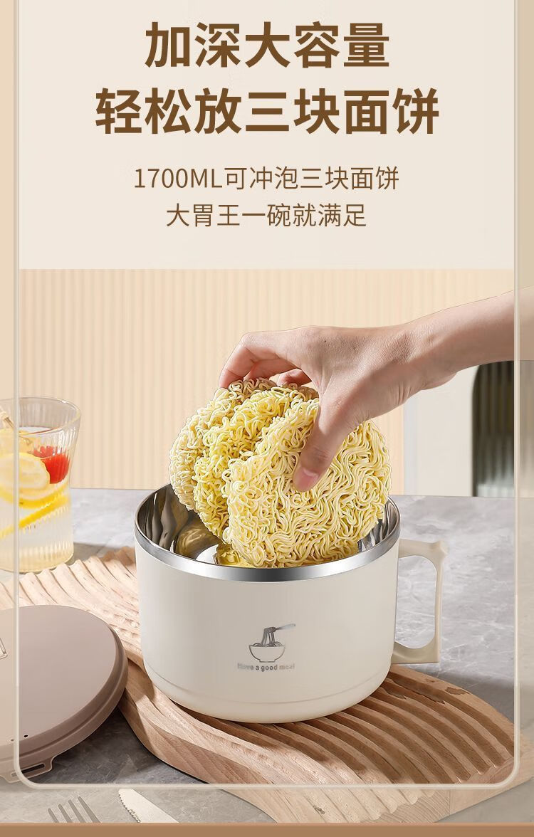 Nikki Bear instant noodle bowl, large student dormitory with lid, large capacity 304 stainless steel fast food cup for one person, canteen meal, thickened off-white, 304 liner, 1700ML