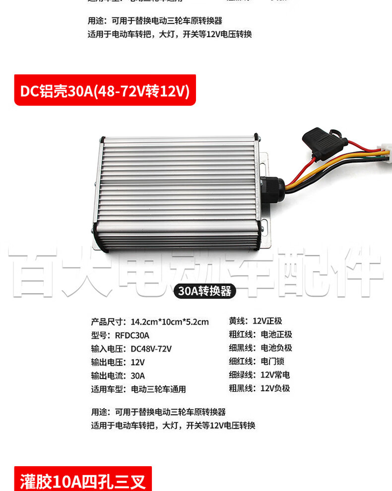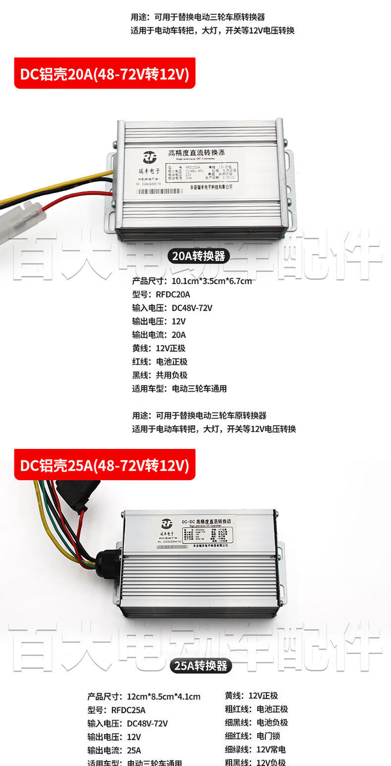 Electric Vehicle DC Converter Electric Tricycle DC High Power Voltage Converter 48V60V72V to 12V Aluminum Shell (Flat Mouth Three Plug) 20A
