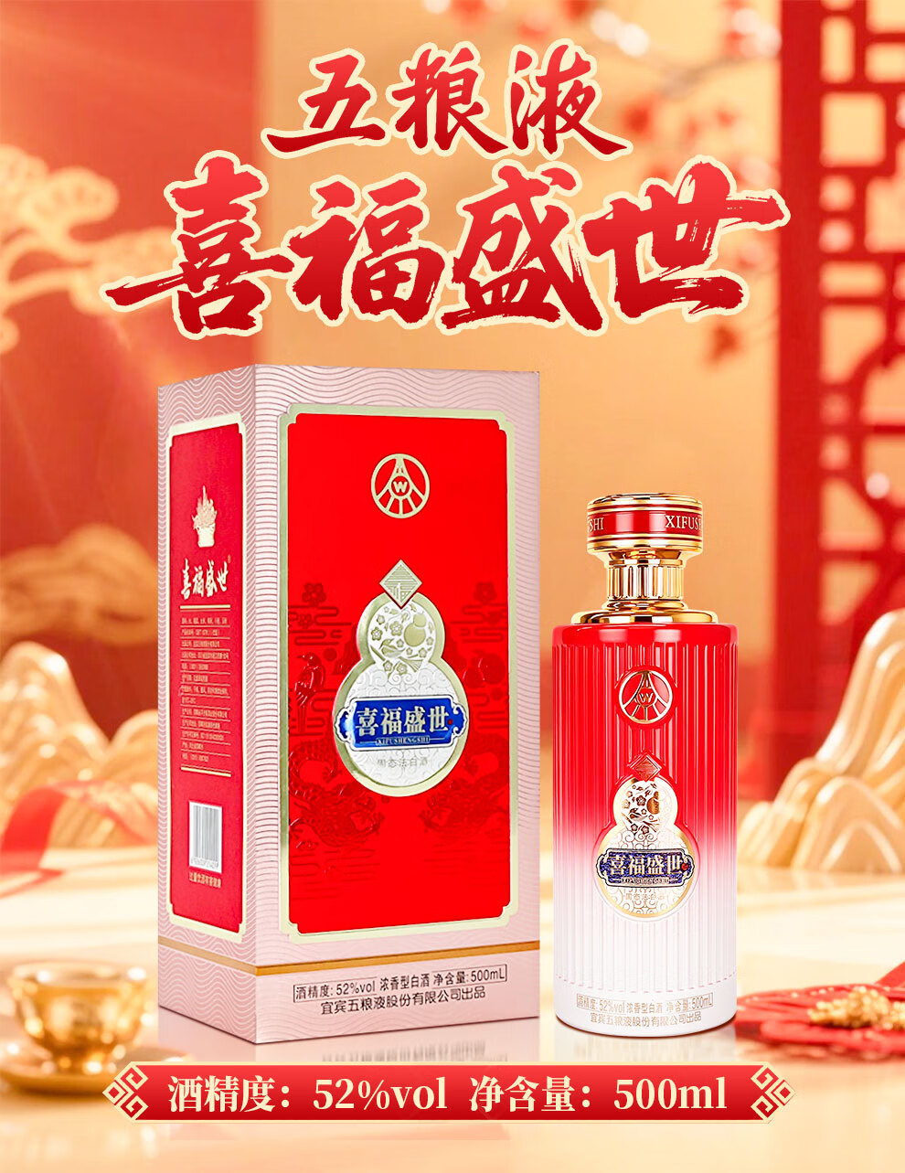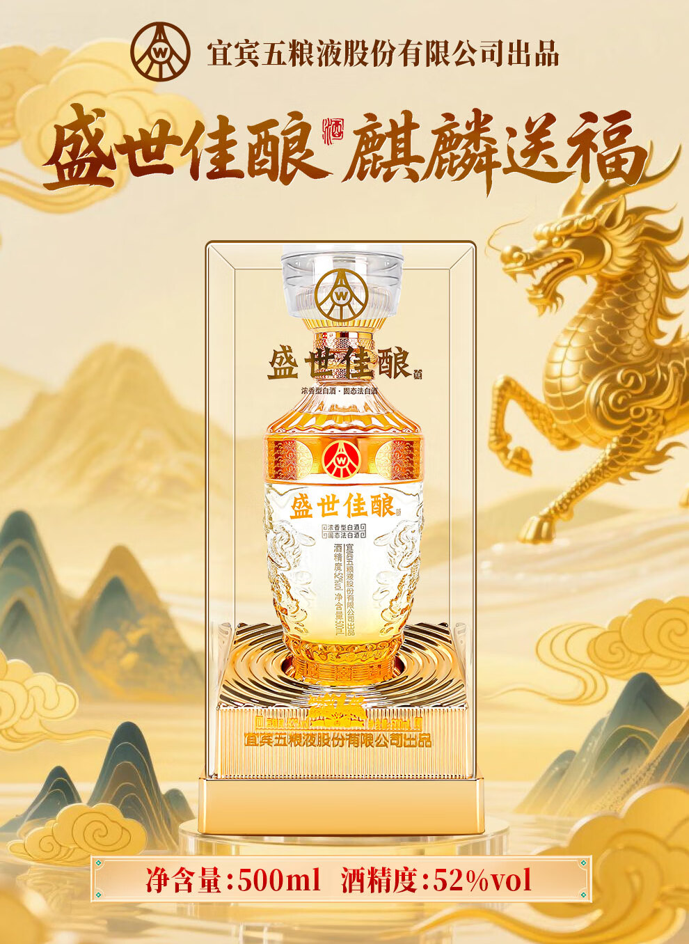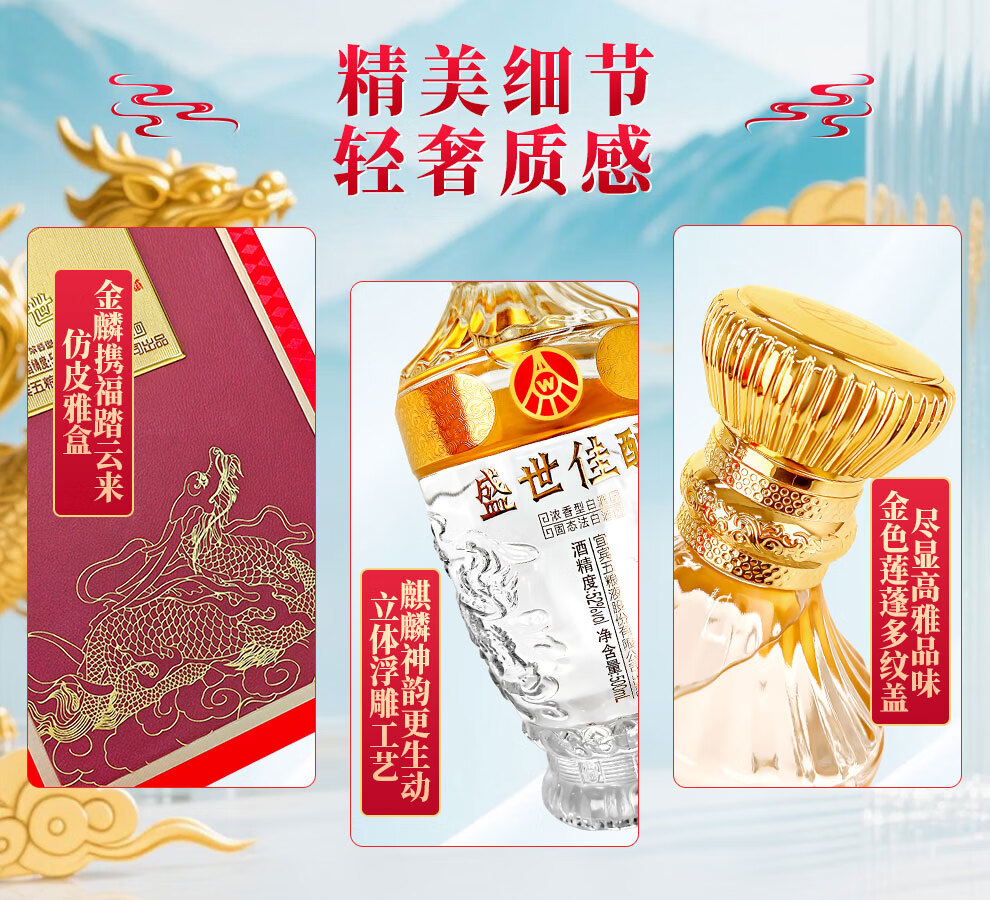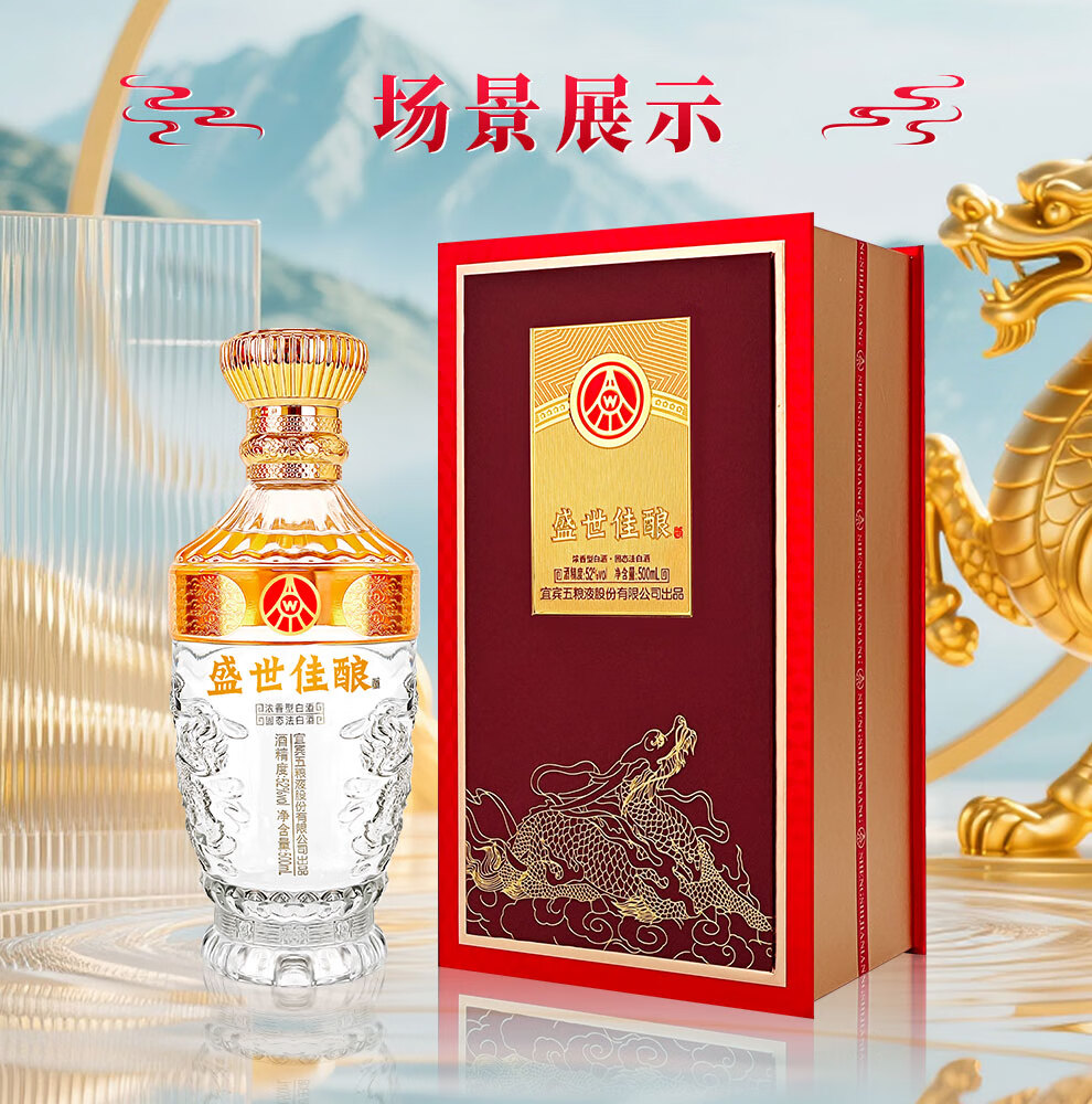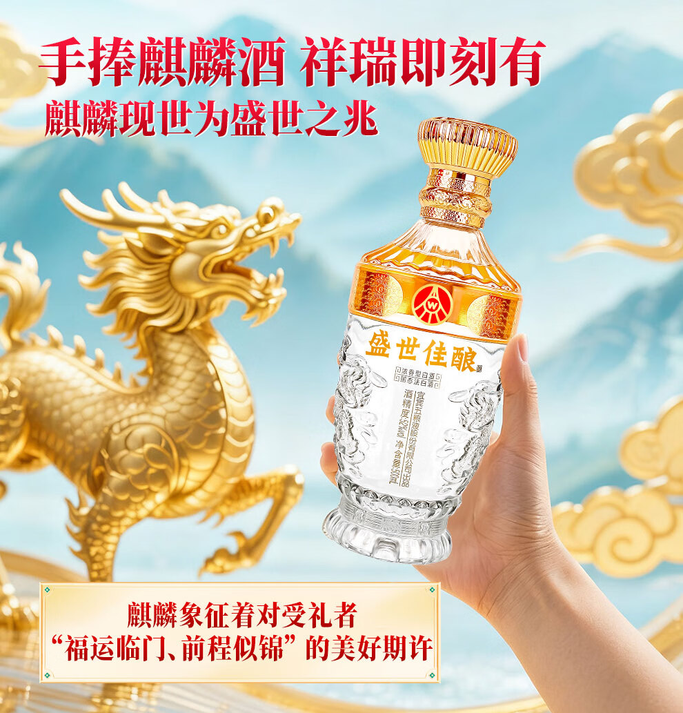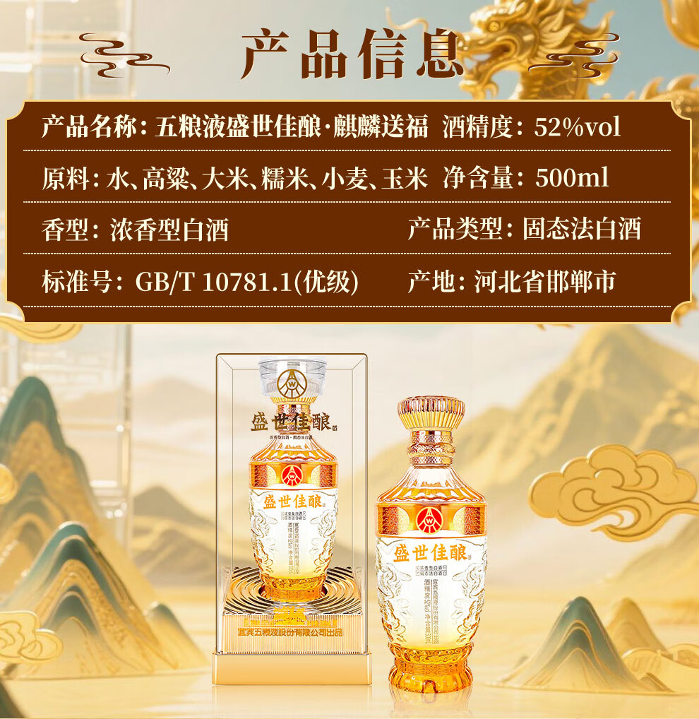 Produced by Wuliangye Co., Ltd. Luzhou-flavor liquor grain solid fermentation ration wine wedding banquet gift wine 52 degrees 500mL 1 bottle Shengshi fine wine Kirin blessing