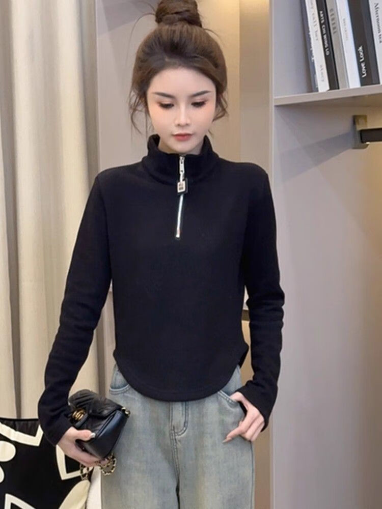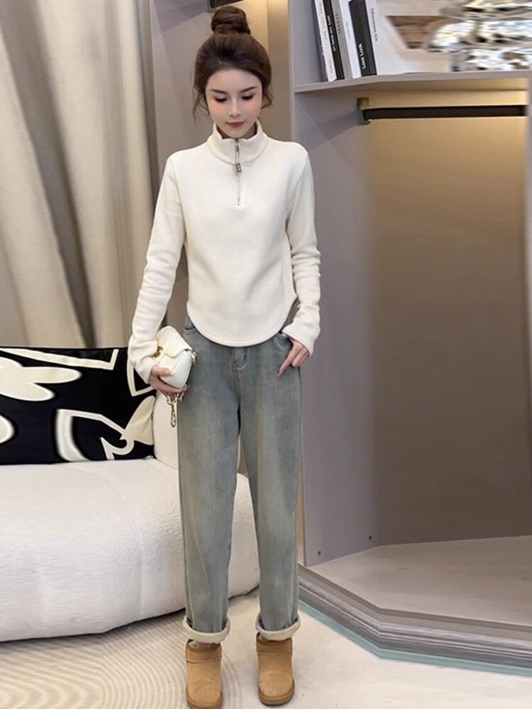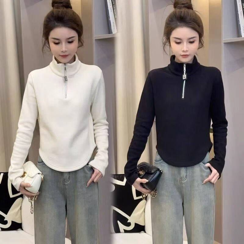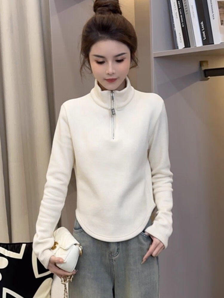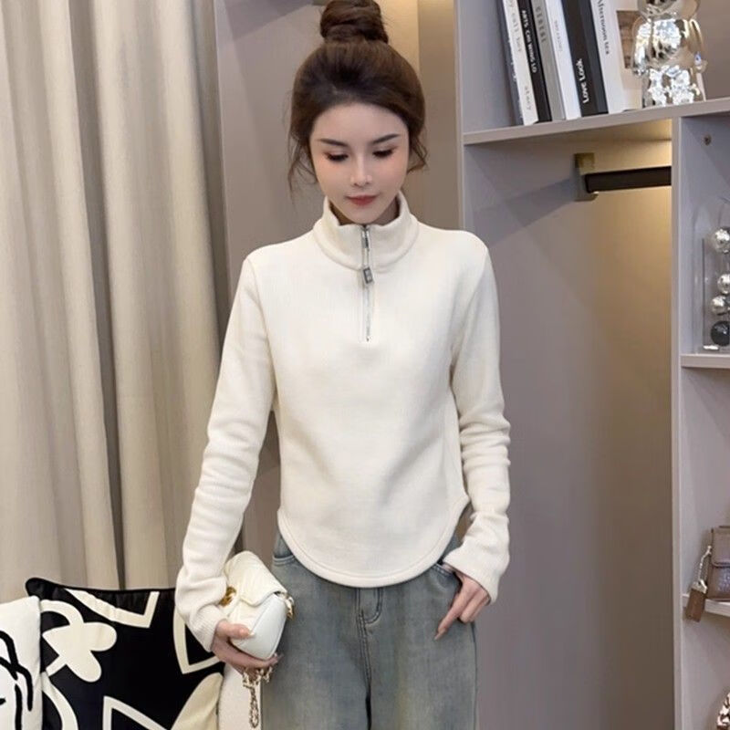 Pierre Cardin velvet thickened temperament zipper half turtleneck German velvet bottoming shirt for women with versatile design top commuting long-sleeved T-shirt white German velvet fabric M recommended within 95 pounds