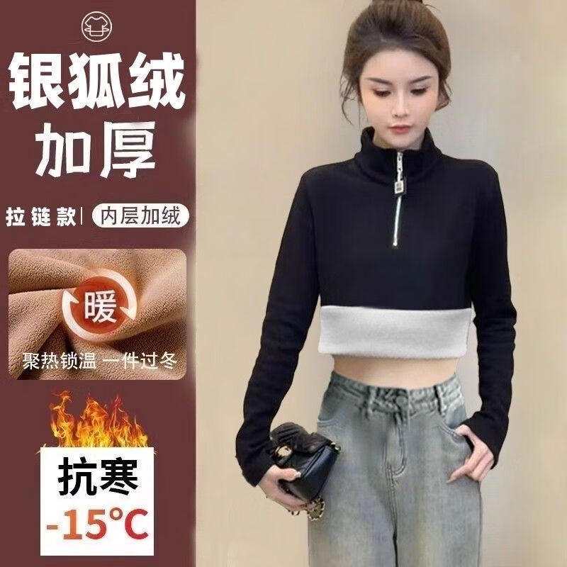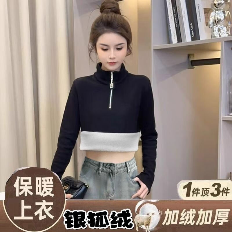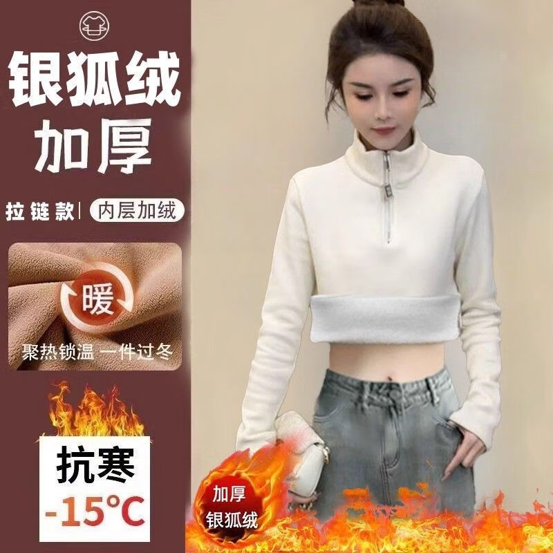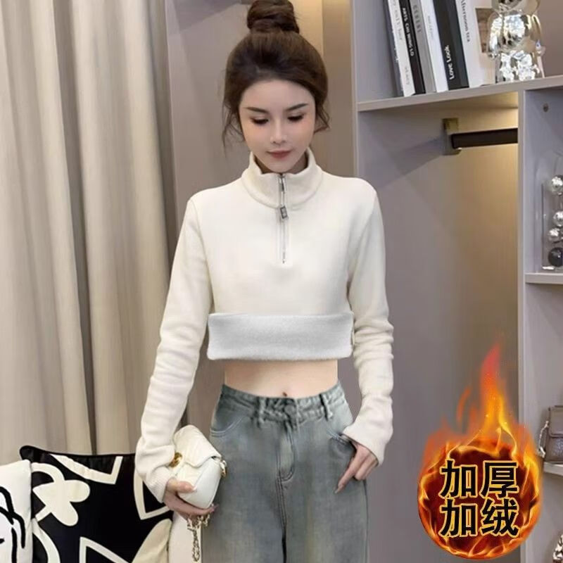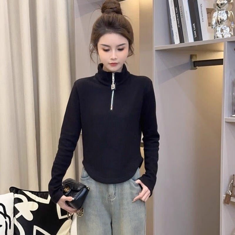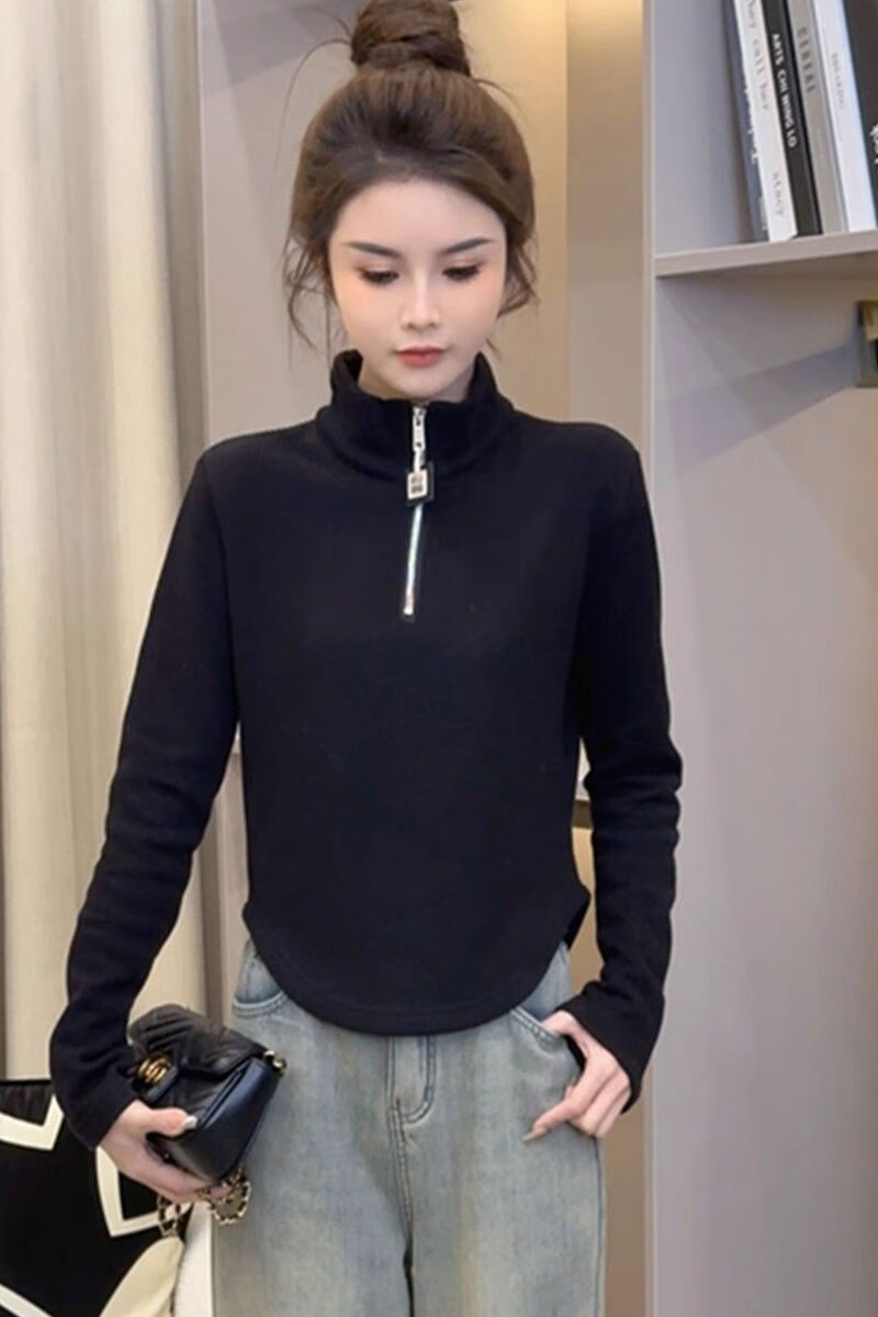 Pierre Cardin velvet thickened temperament zipper half turtleneck German velvet bottoming shirt for women with versatile design top commuting long-sleeved T-shirt white German velvet fabric M recommended within 95 pounds