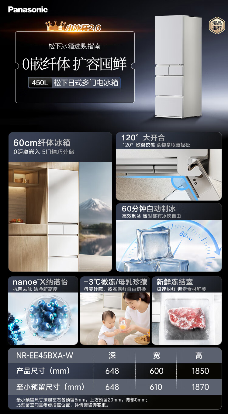 Panasonic Little Sorbet 2.0 French multi-door small apartment refrigerator 450 household ultra-thin air-cooled frost-free automatic ice making first-class energy efficiency NR-EE45BXA-W