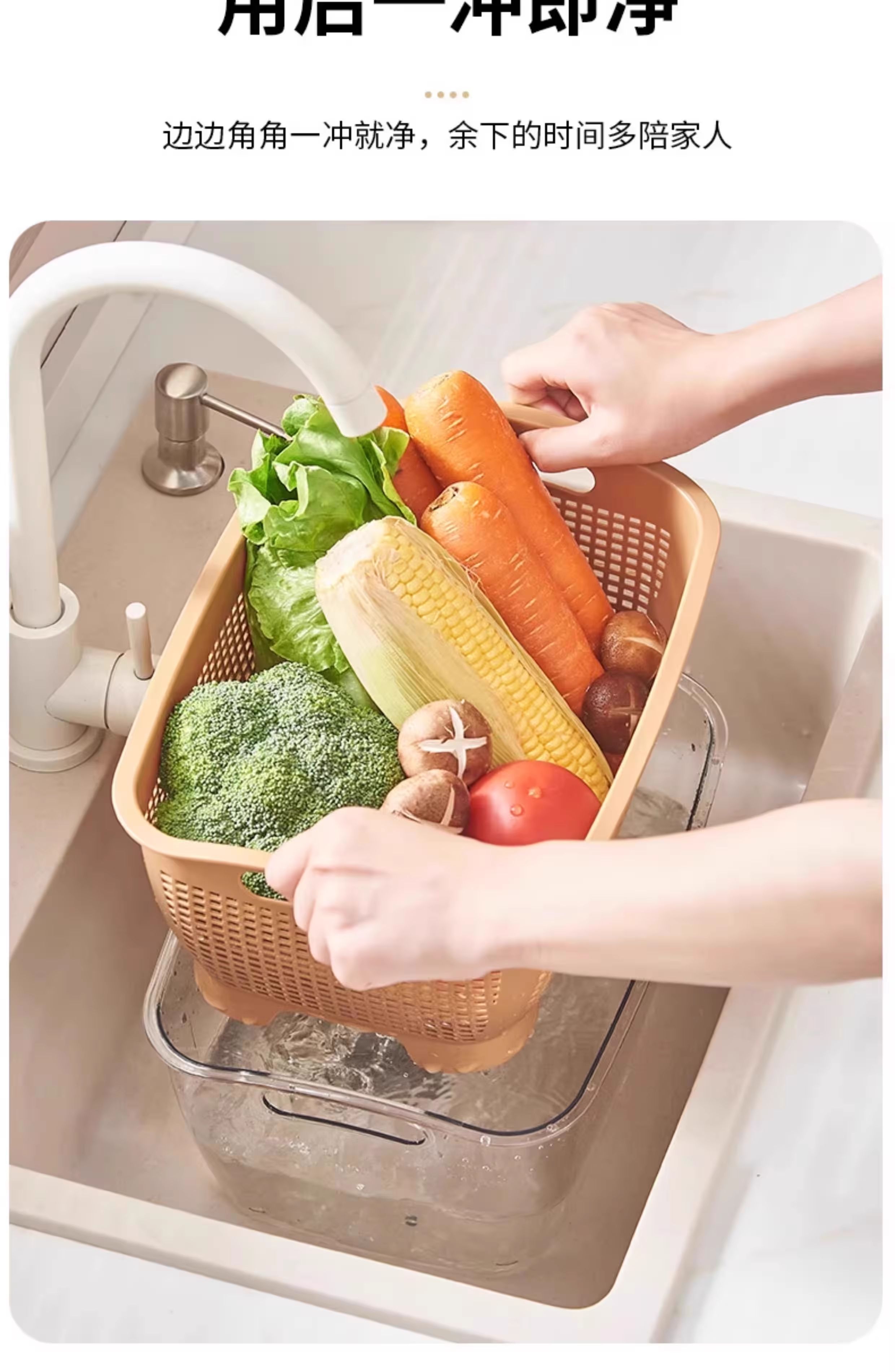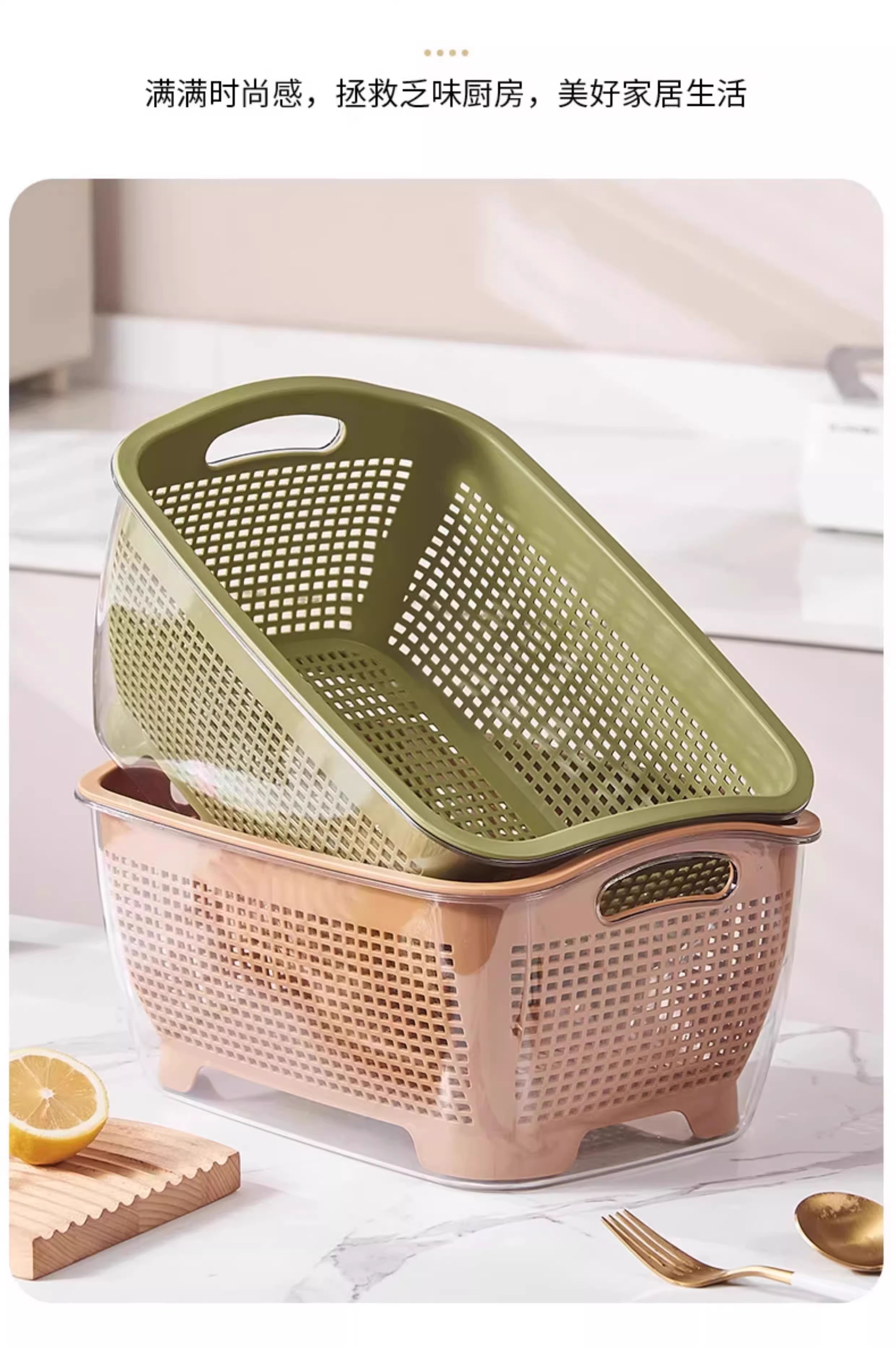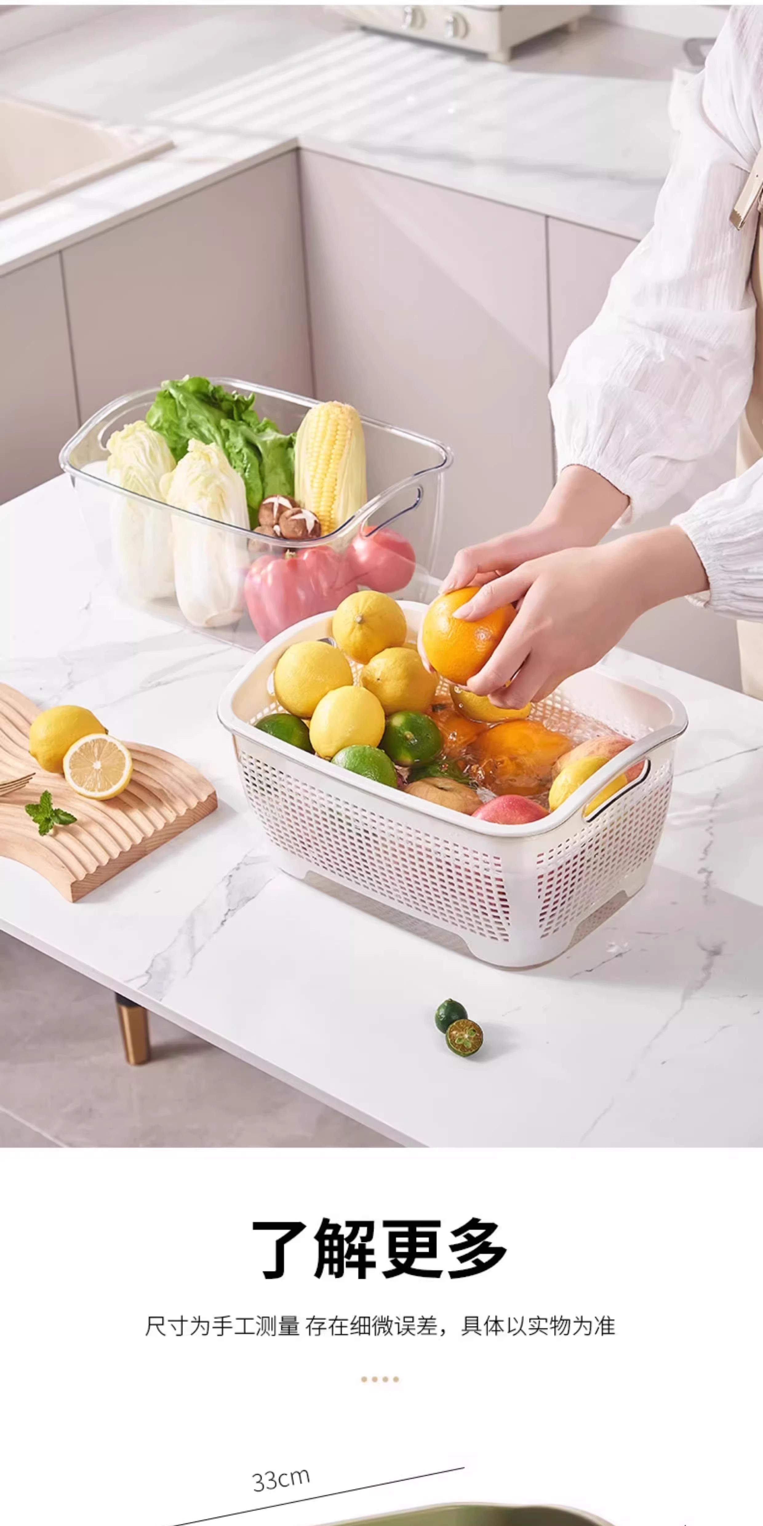 FVFH German household double-layer thickened kitchen drain basket sink living room fruit plate vegetable basket high-looking fruit basket rectangular large size Nordic white weight 730 grams