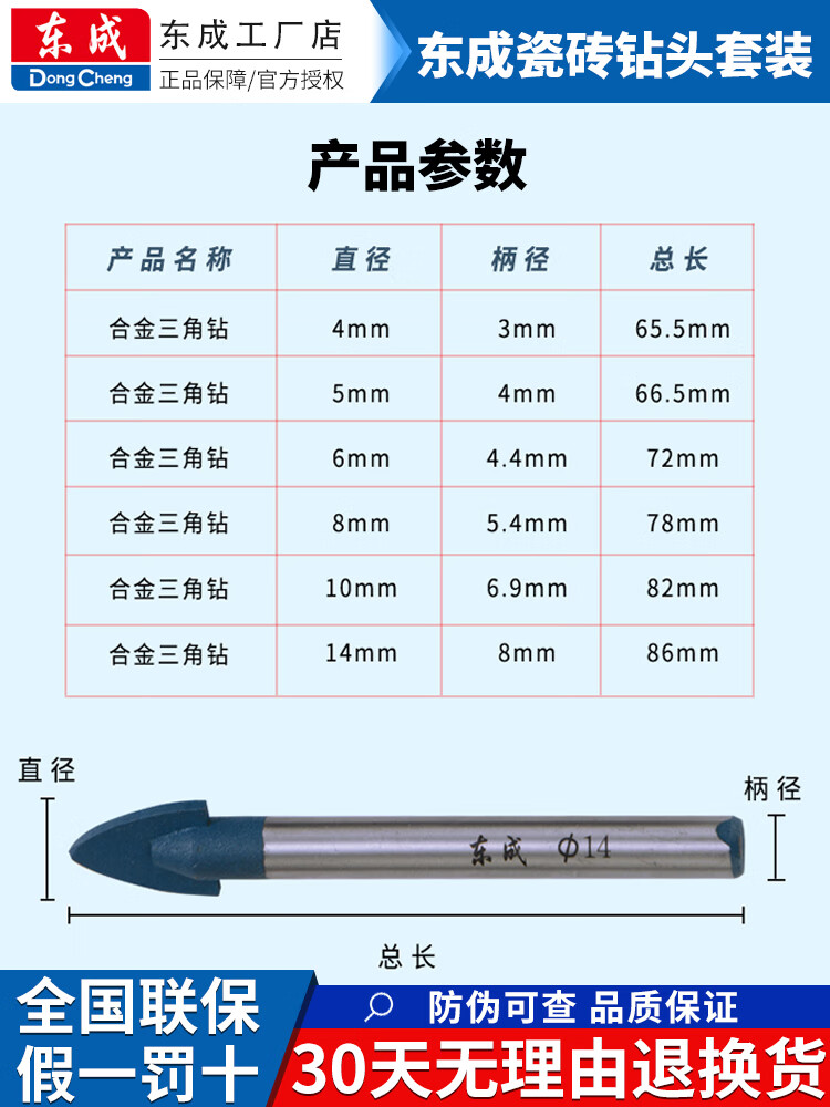 Dongcheng tile drill bit set alloy tile ceramic wall glass rotary electric drill drilling triangle drill bit 6mm Dongcheng original 4x65mm ten pieces