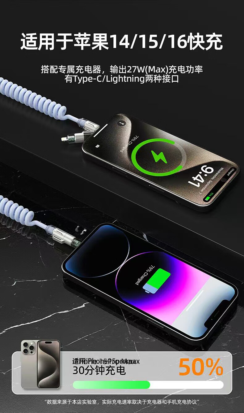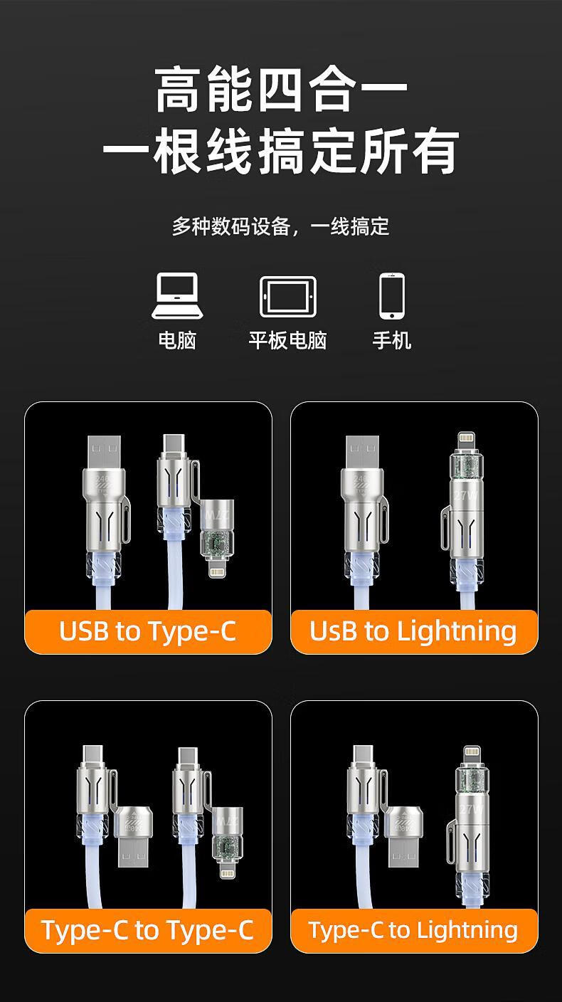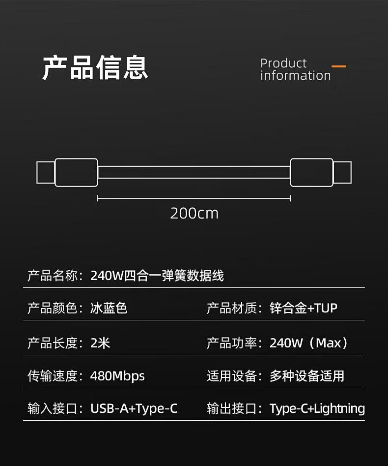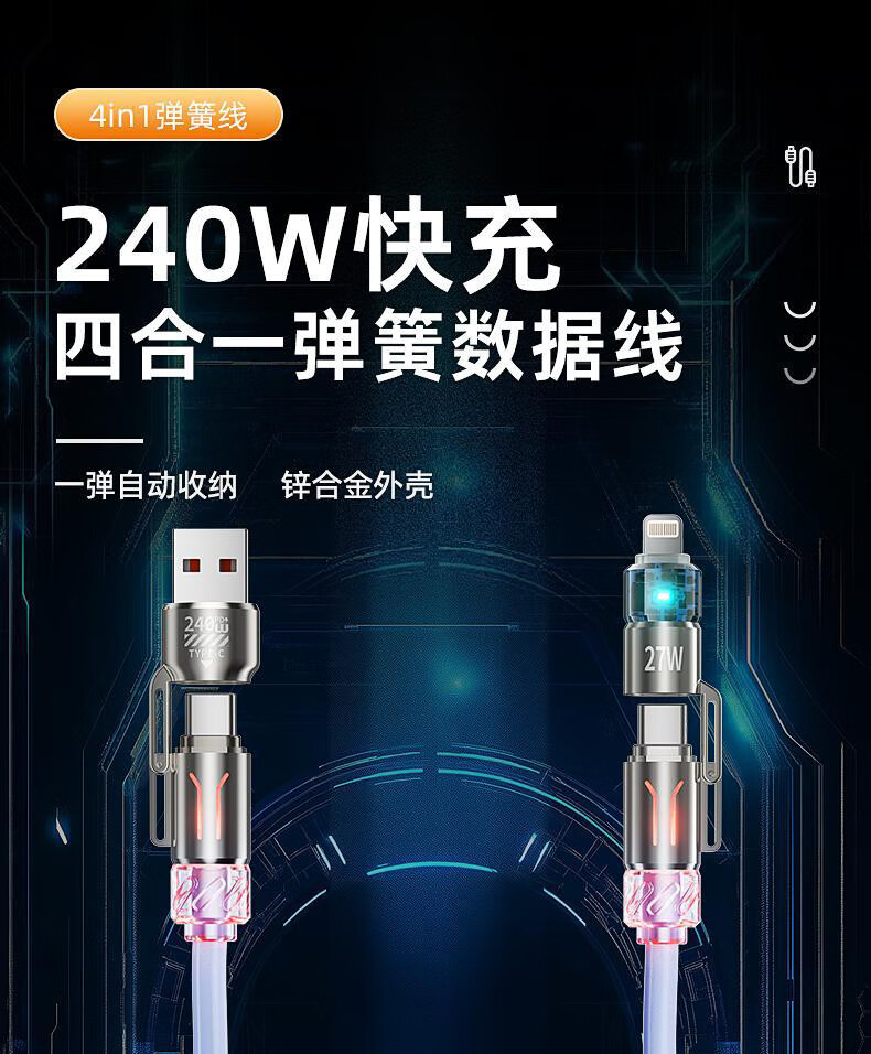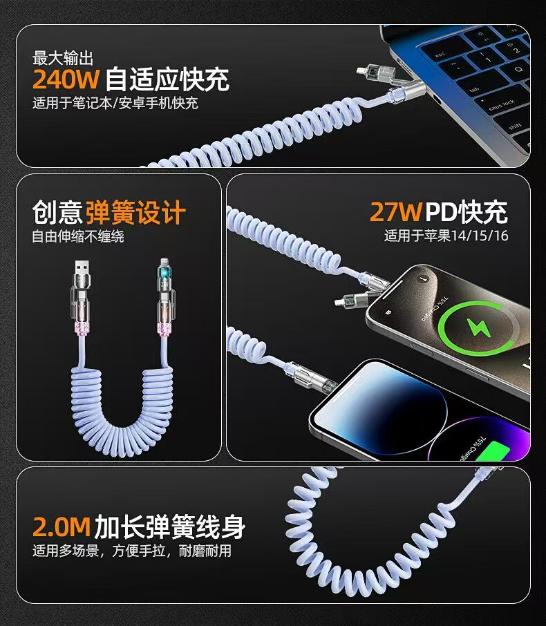 240W data cable four-in-one car spring aromatherapy luminous data cable suitable for Apple and Huawei type-c fast charging upgraded model comes with aromatherapy spring four-in-one 2 meters ice blue