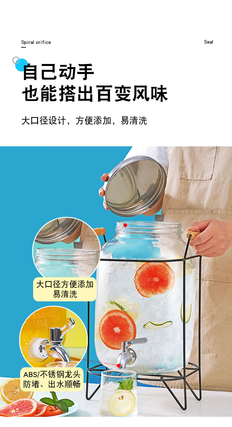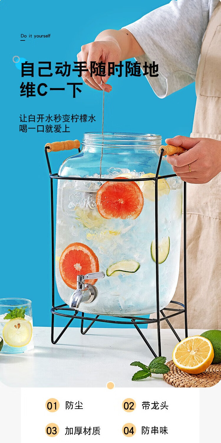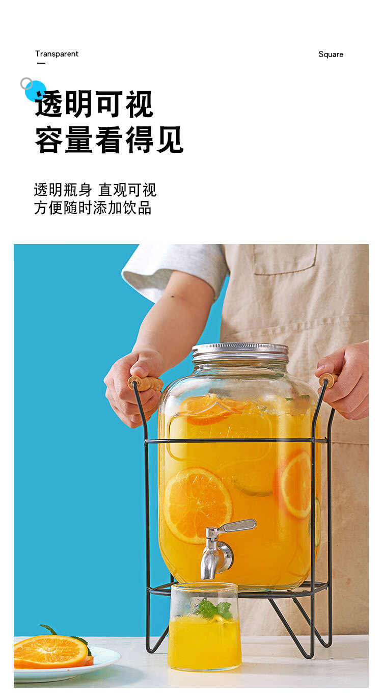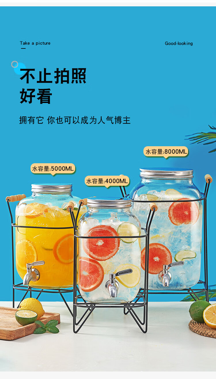 Internet celebrity Niubi barrel, Coke barrel, bar beer barrel, glass cold kettle, beverage barrel with faucet, homemade fruit tea barrel, 8 liters + stainless steel faucet + iron frame