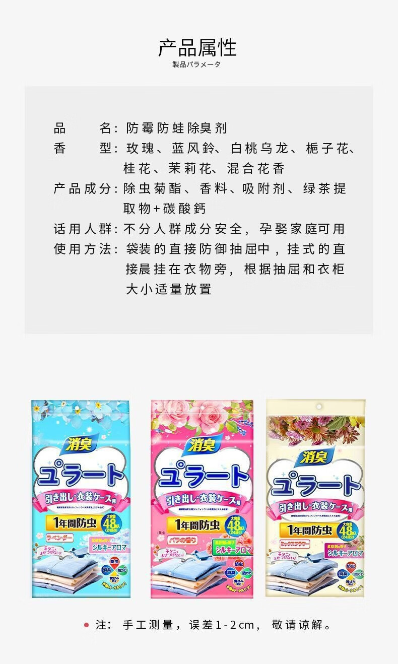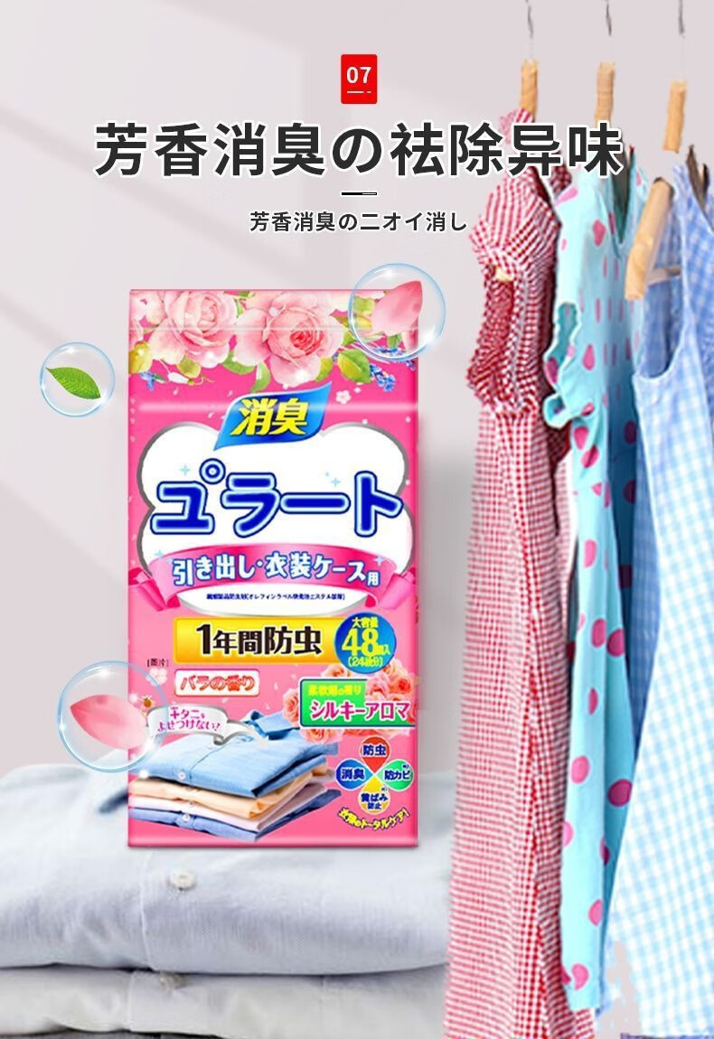 Japanese mothball wardrobe mold-proof, insect-proof, moisture-proof, moth-proof and mite-removing mothballs, natural aromatic clothing deodorizing and deodorizing 48 small packs, rose scent