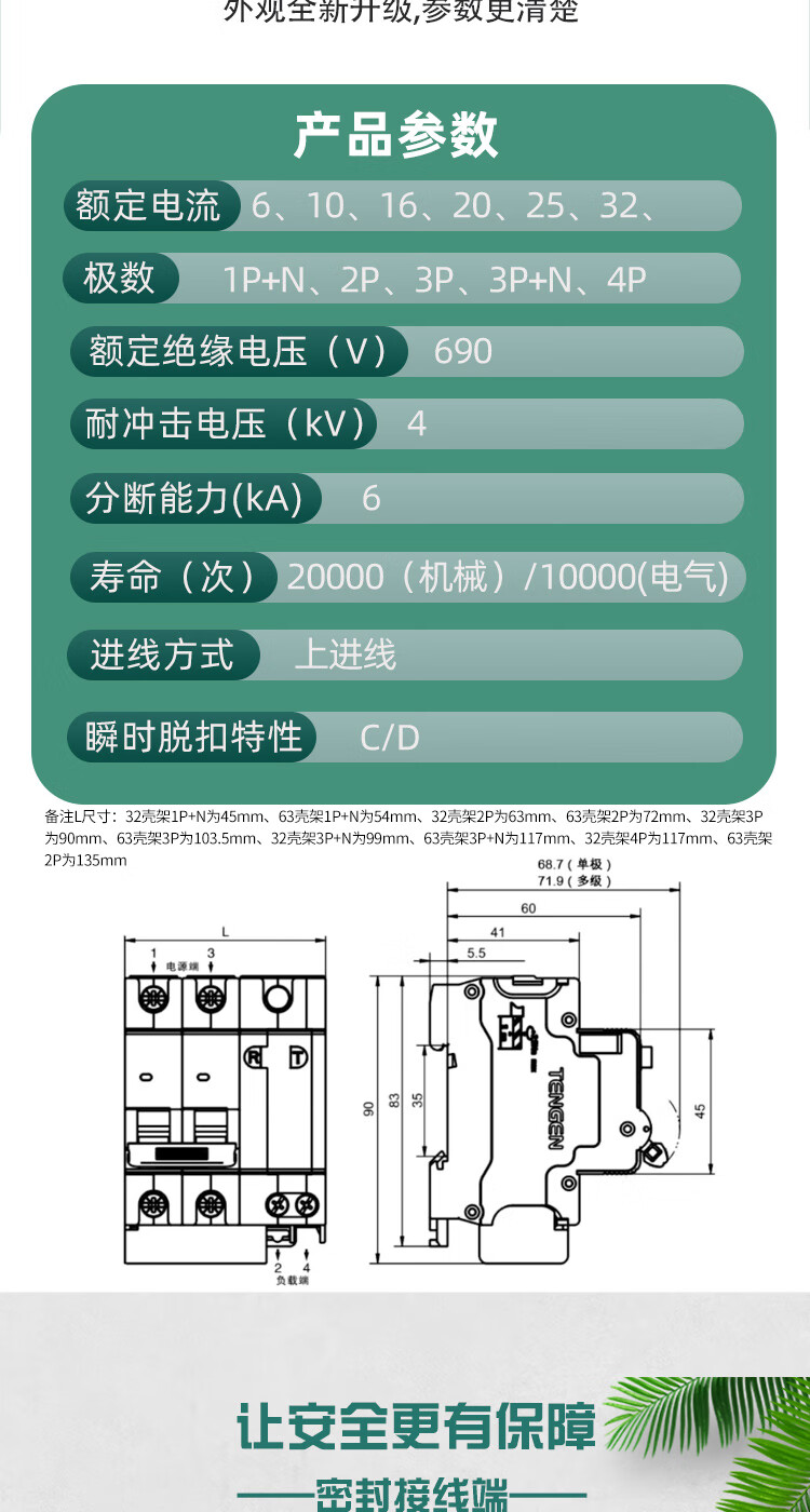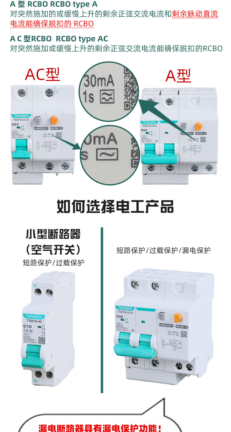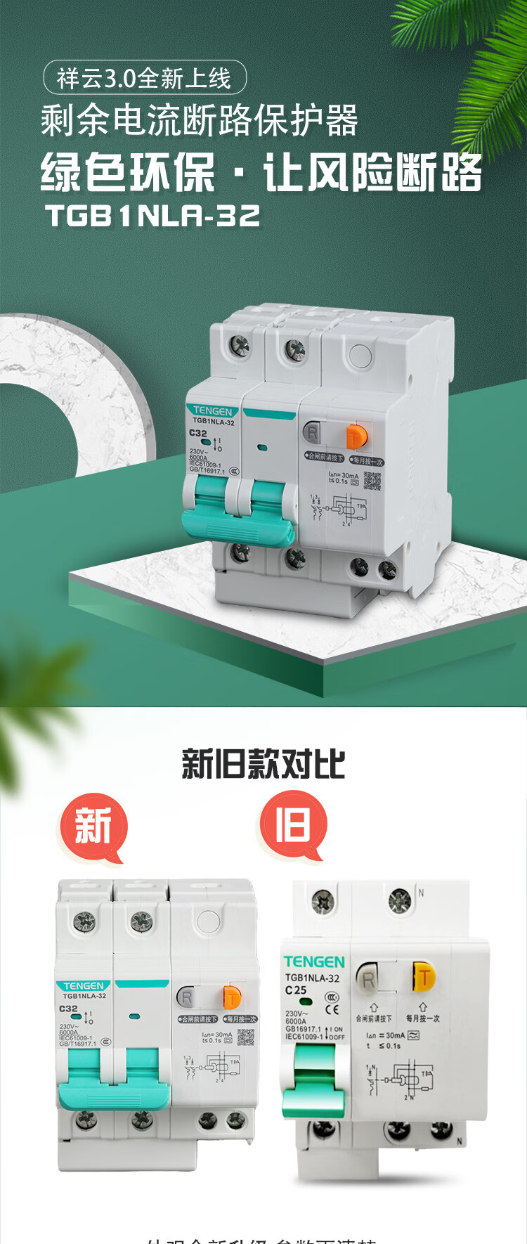 Tianzheng Electric (TENGEN) TGB1NLA series charging pile circuit breaker 32 frame C type air switch with leakage protection TGB1NLA-32 1P+N C16 30mA 2P