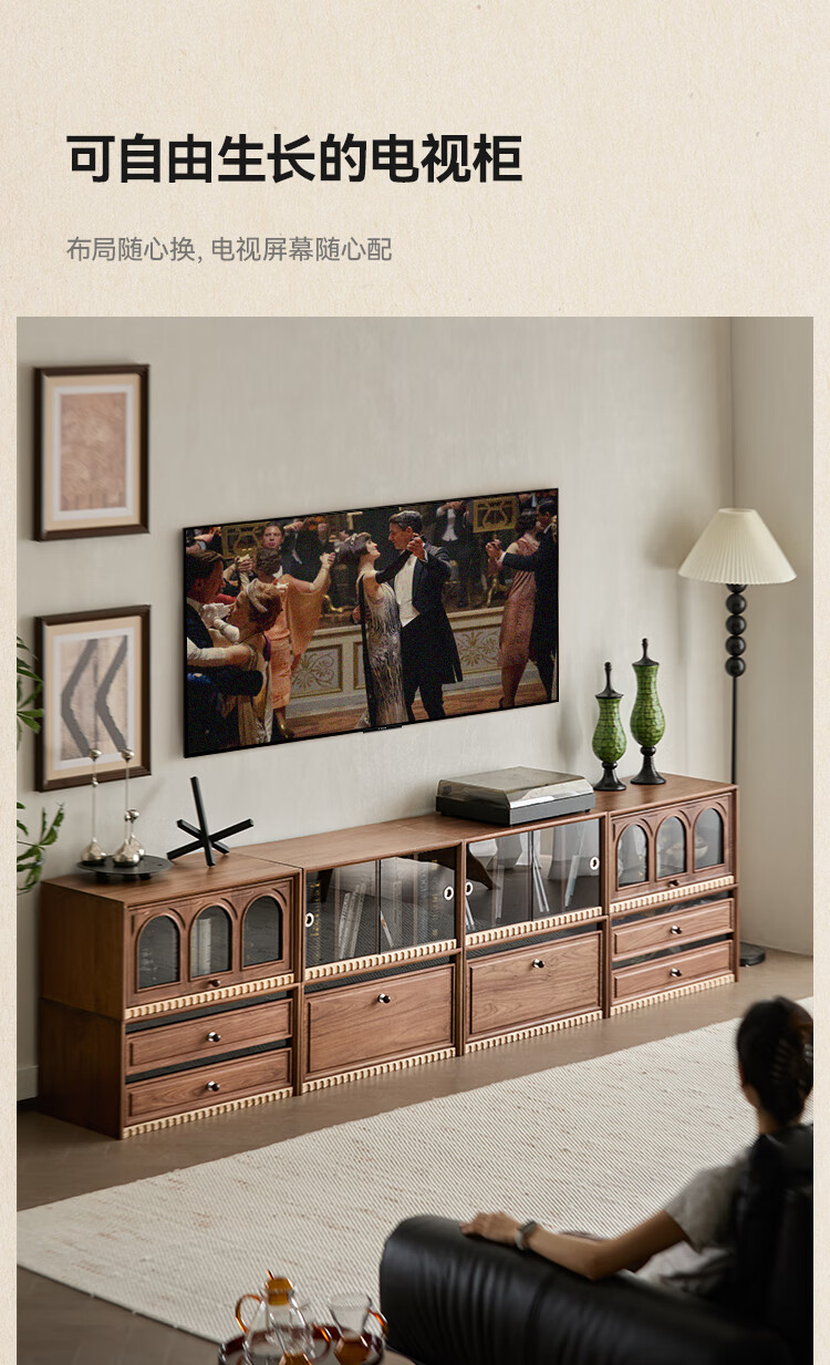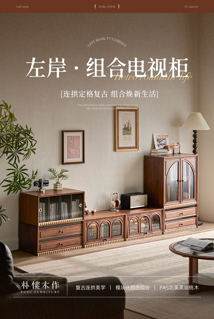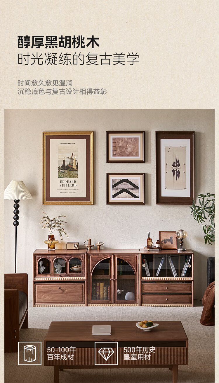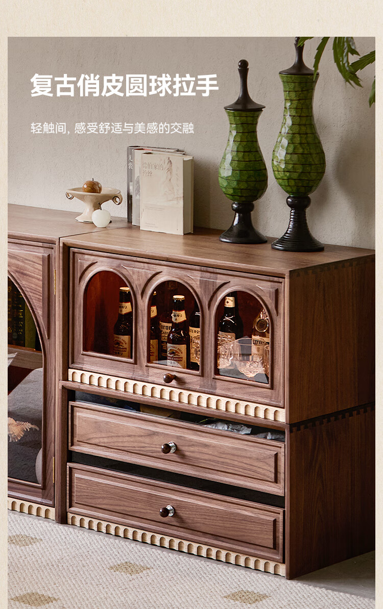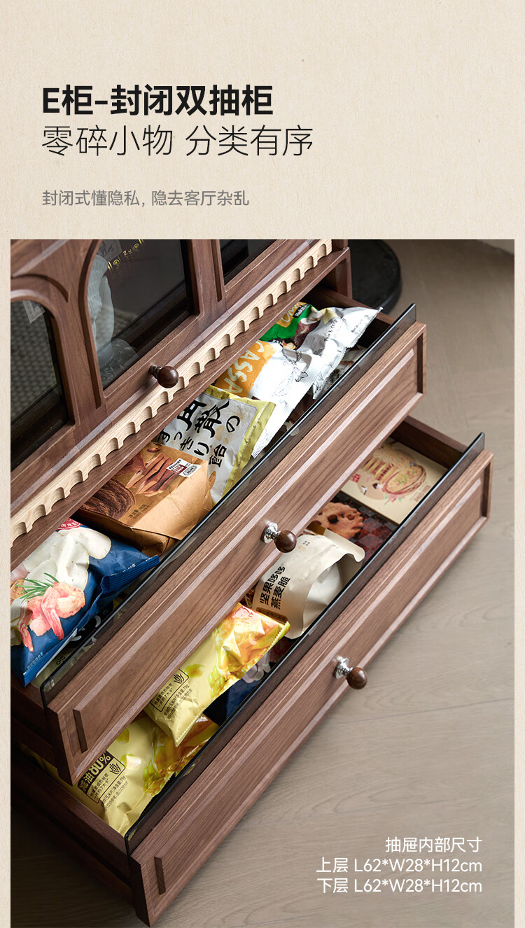 Solid wood TV cabinet made of Pusu wood, floor-standing French retro combination cabinet, antique black walnut wood living room storage integrated E cabinet - closed double drawer cabinet丨Ready stock