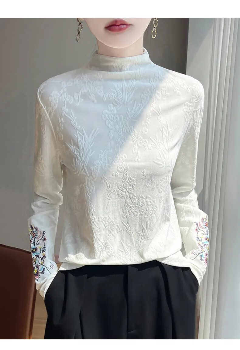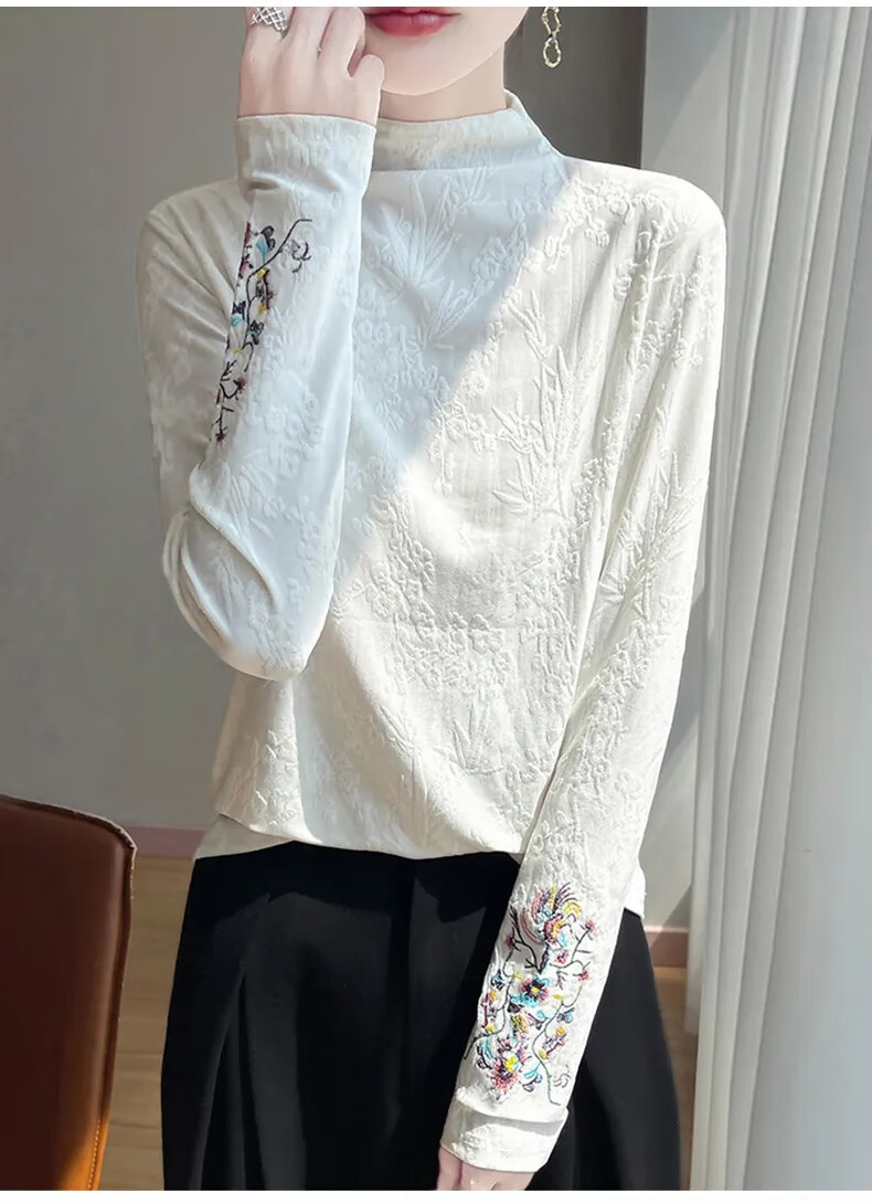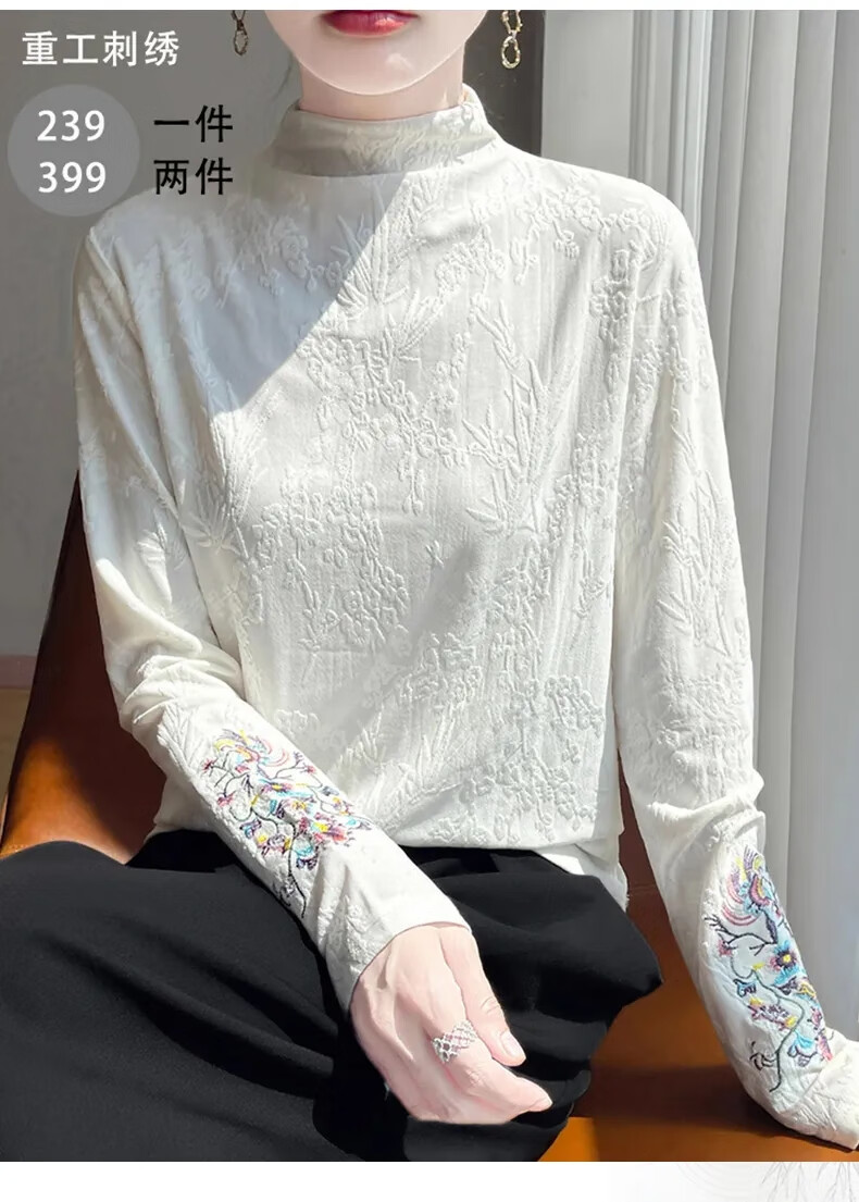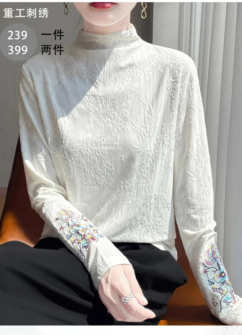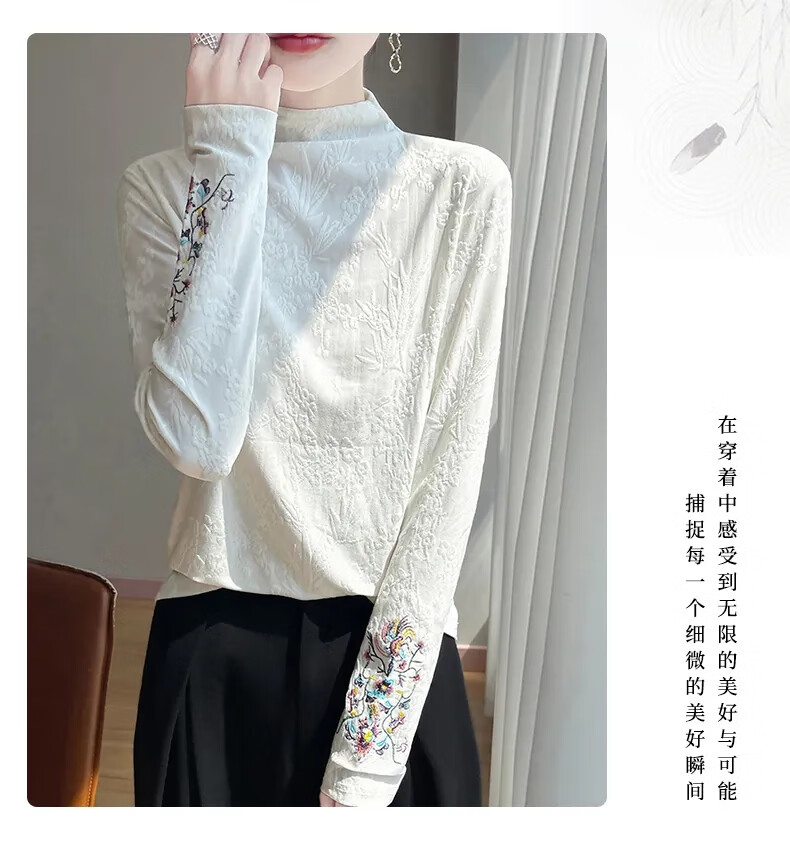 Suding women's original brand flagship store versatile half turtleneck/round neck heavy industry exquisite embroidery bottoming T-shirt autumn half turtleneck off-white XL