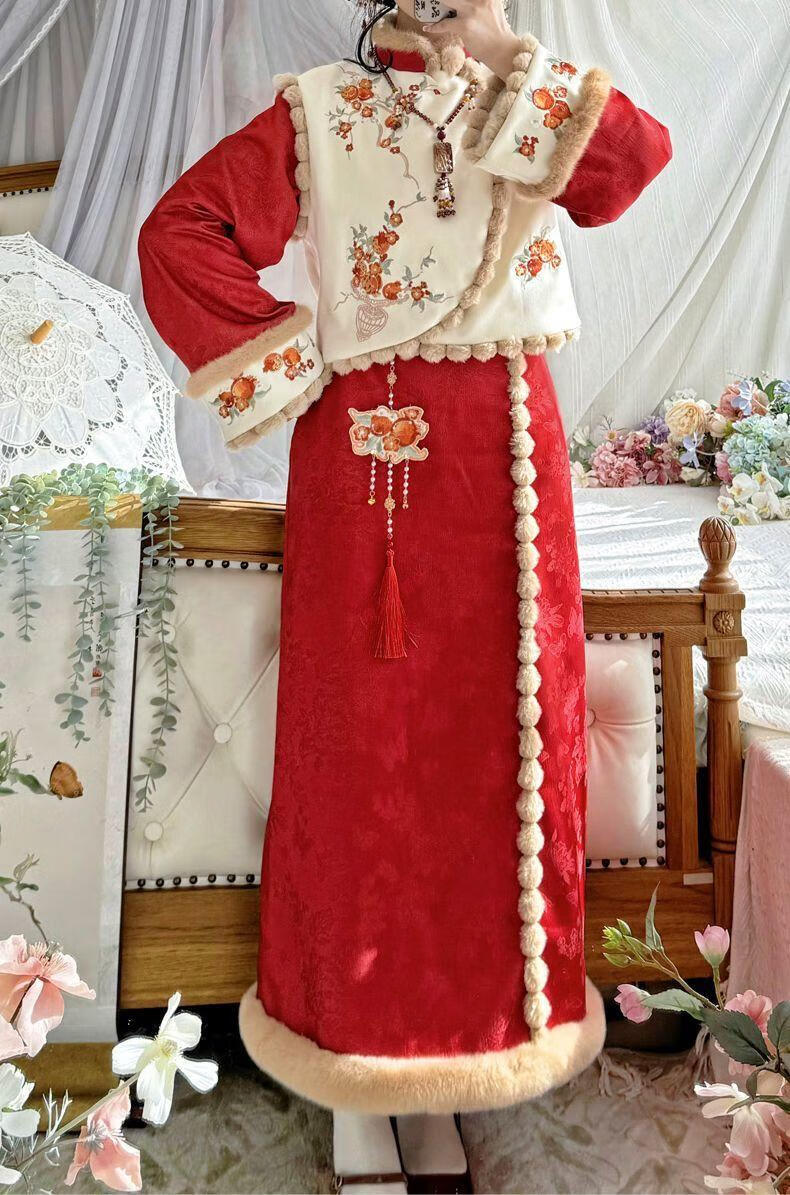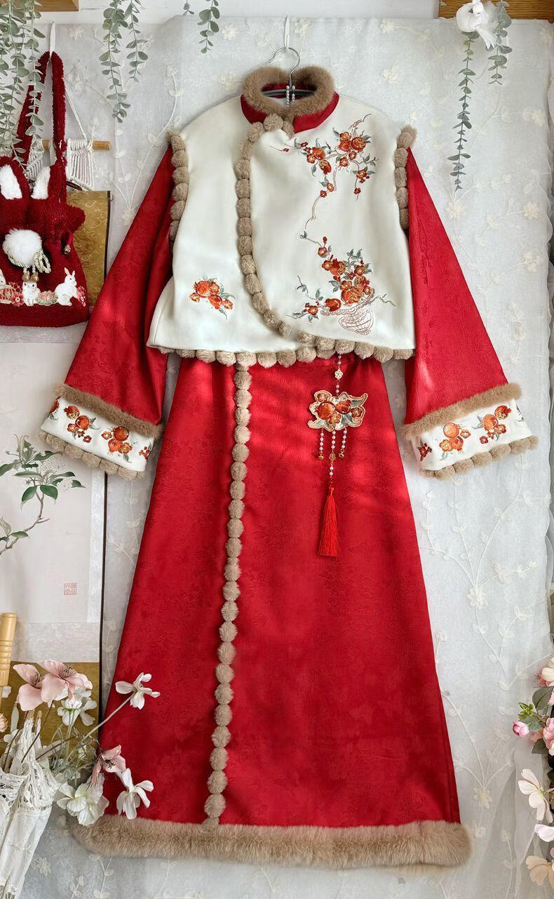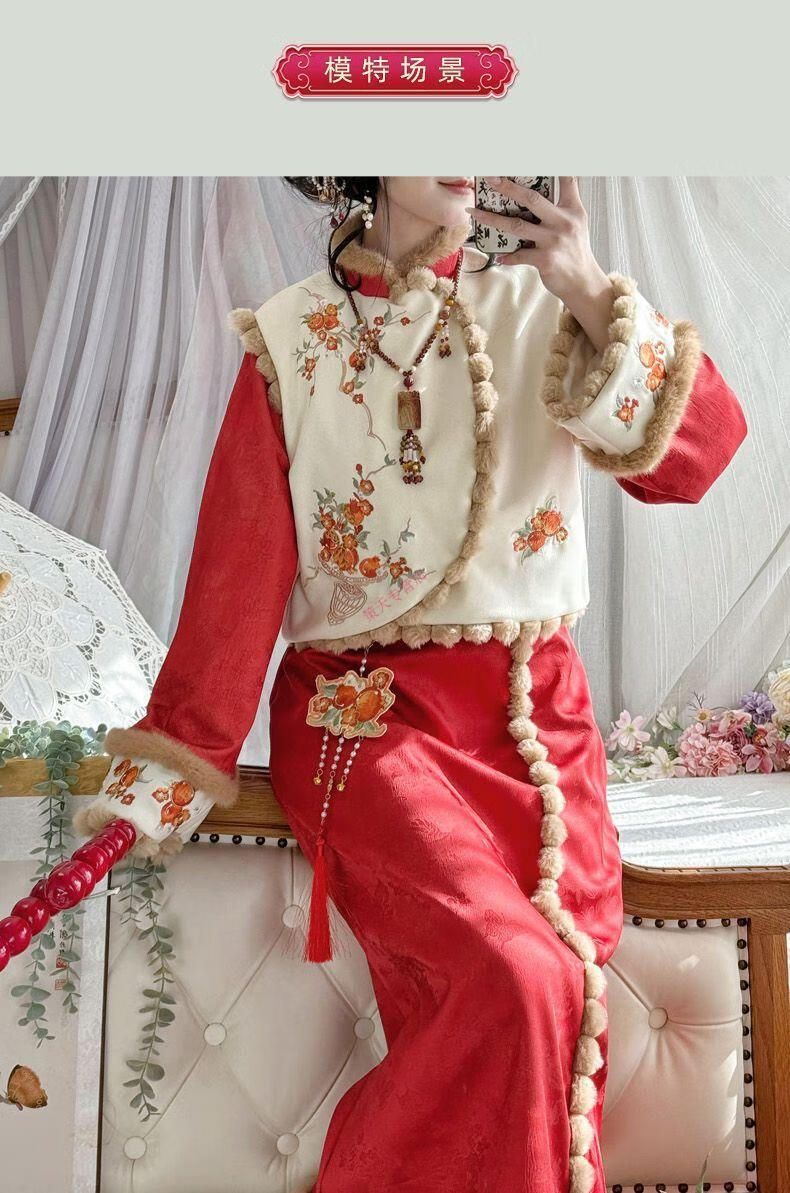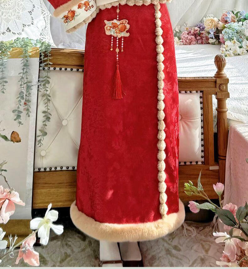 Pierre Cardin 2025 Winter Hanfu Women New Chinese Style Chinese New Year Clothes Plus Velvet Thickening Daily Winter Improved Cheongsam Vest Small Pomegranate Complete Set Free Pendant S