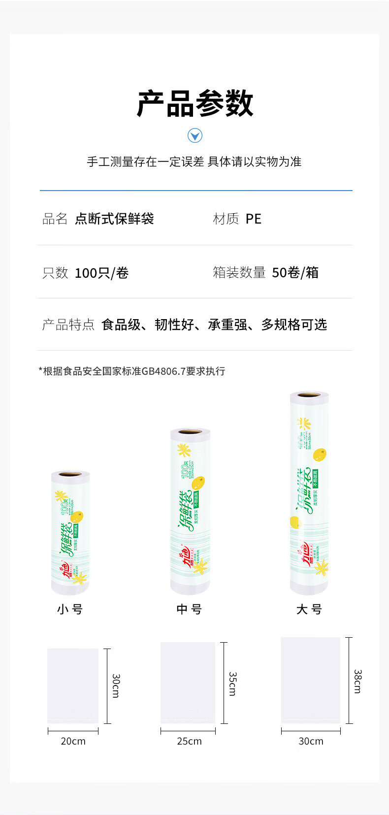 Lidi household disposable fresh-keeping bag food grade point-break edible PE thickened refrigerator freezer starting from one piece large size 30*38cm 50 rolls in the whole box