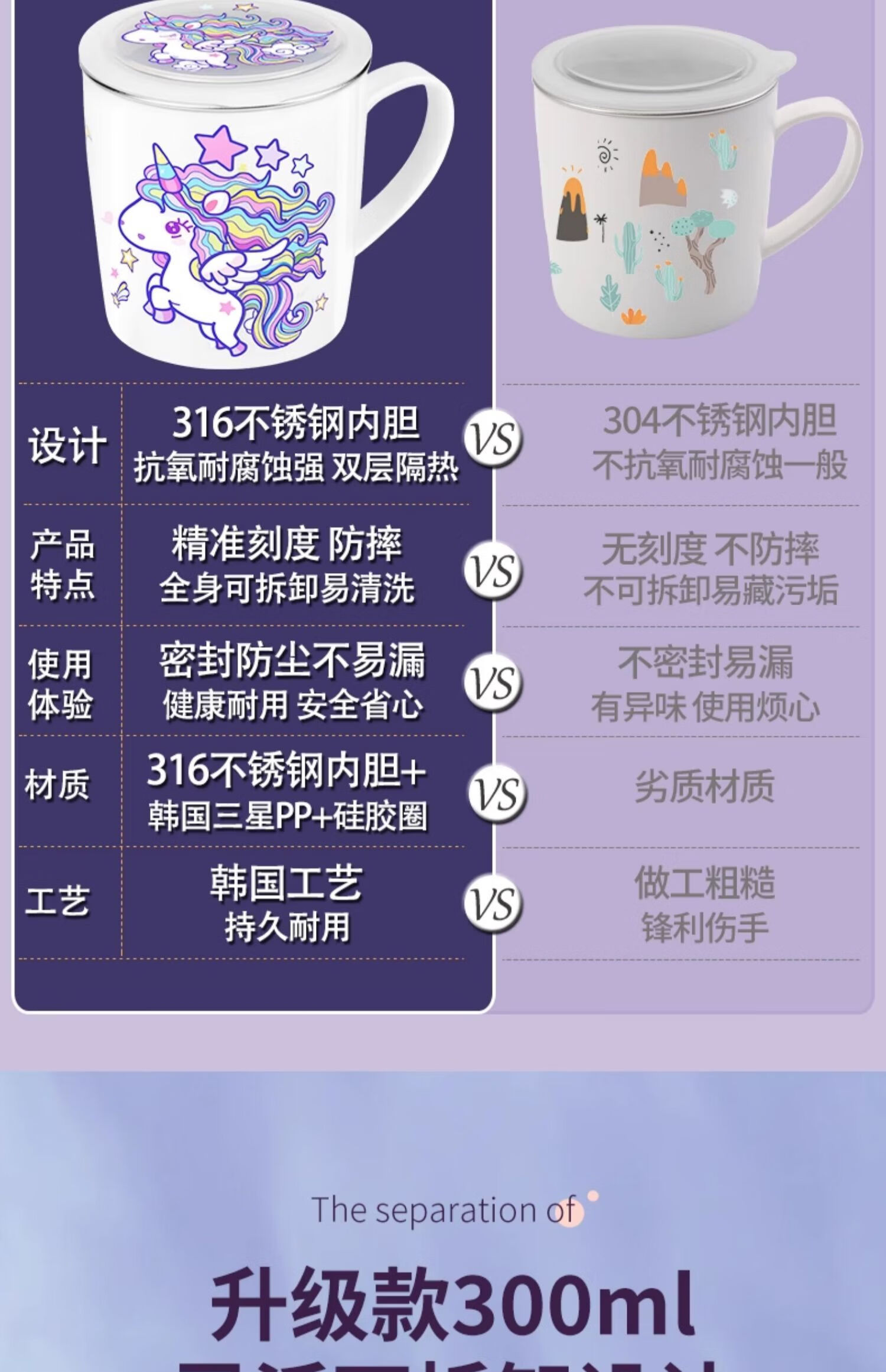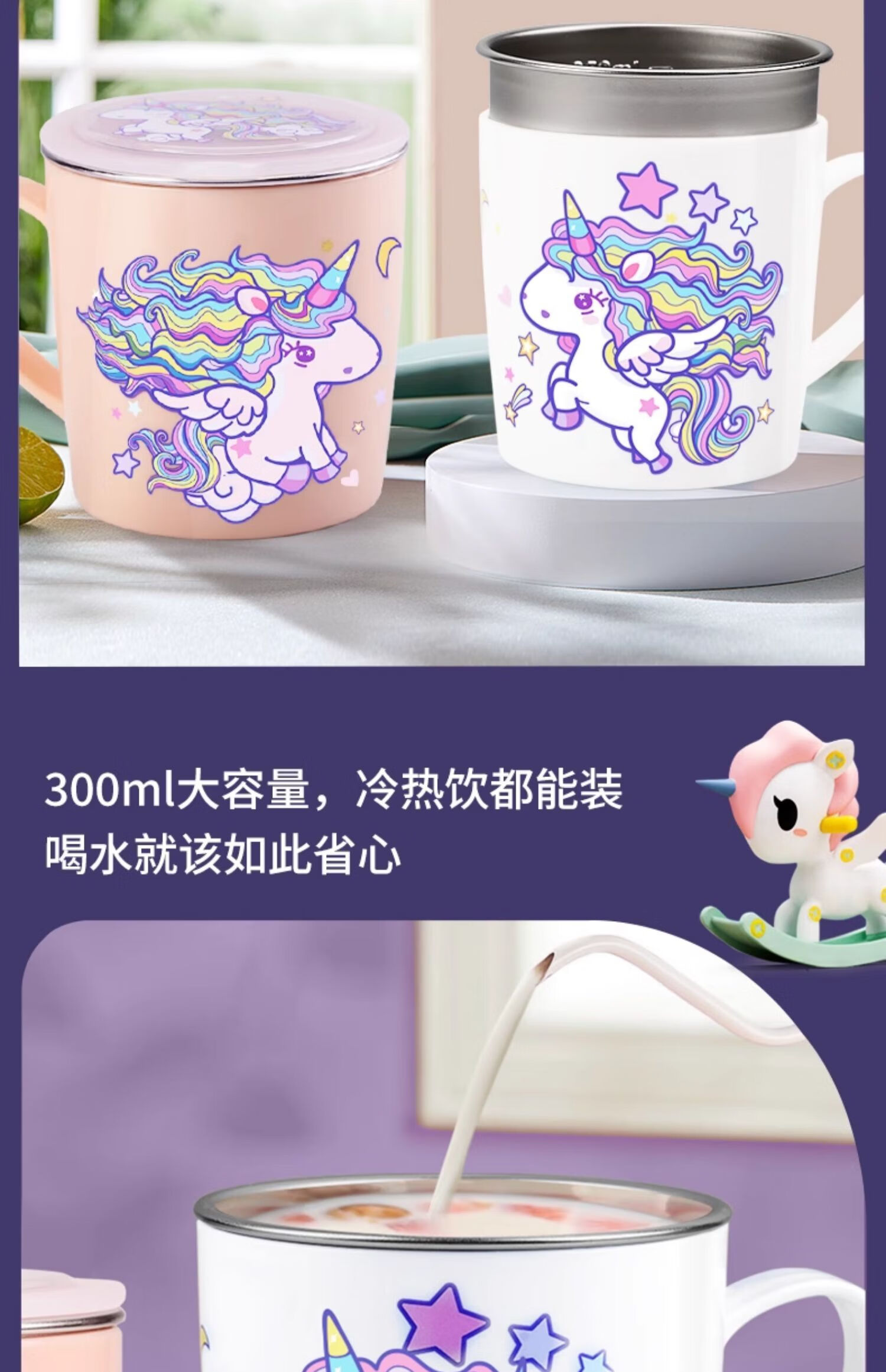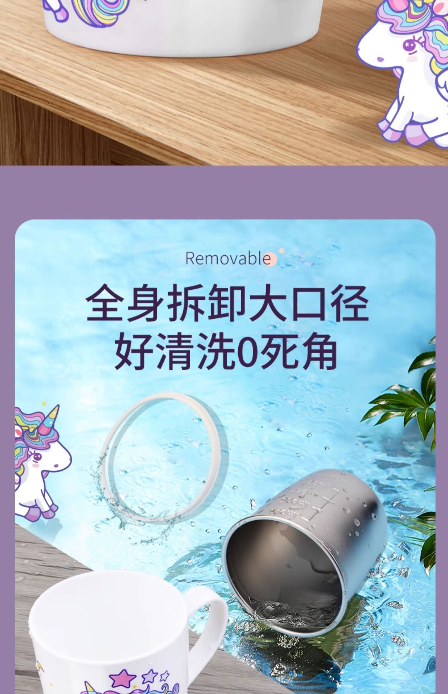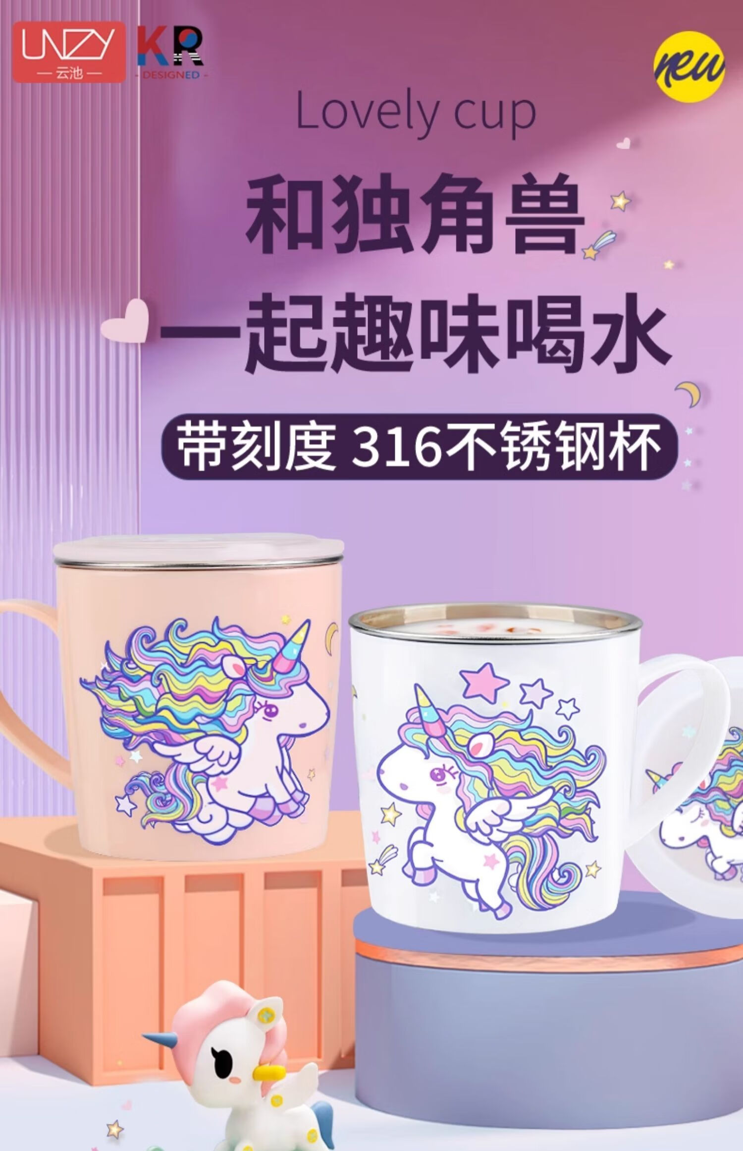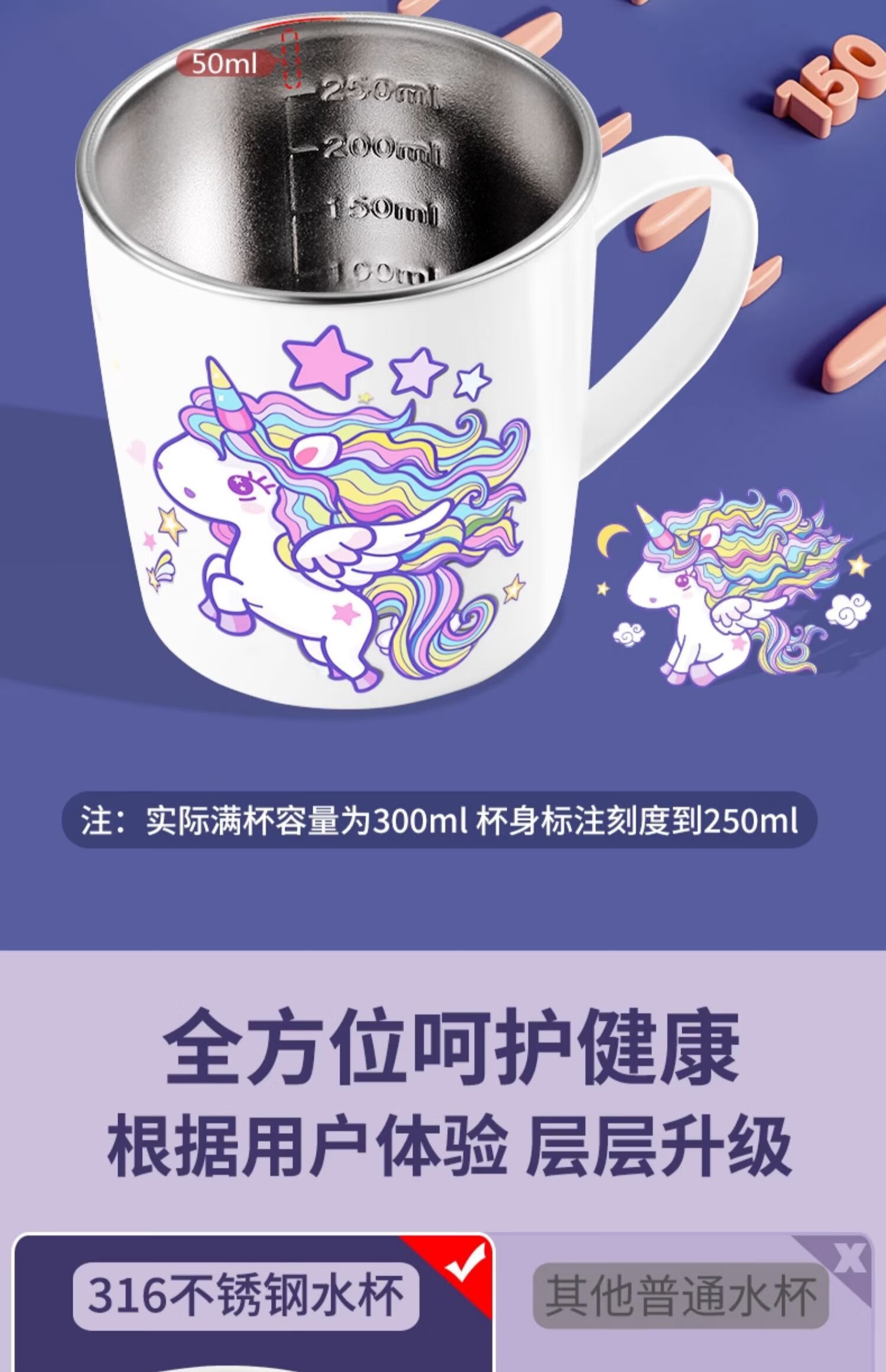 Children's water cup household 316 stainless steel cup with scale drinking cup kindergarten baby special open cup 316 white split unicorn 300ml